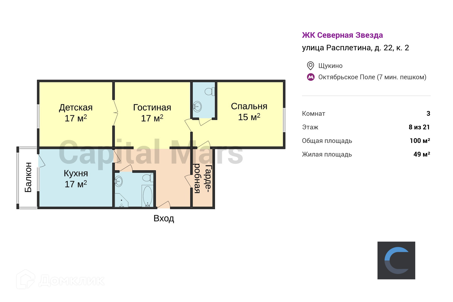 3-комнатная квартира, 100 м2, в аренду на длительный срок в Москве, улица Расплетина, 22к2