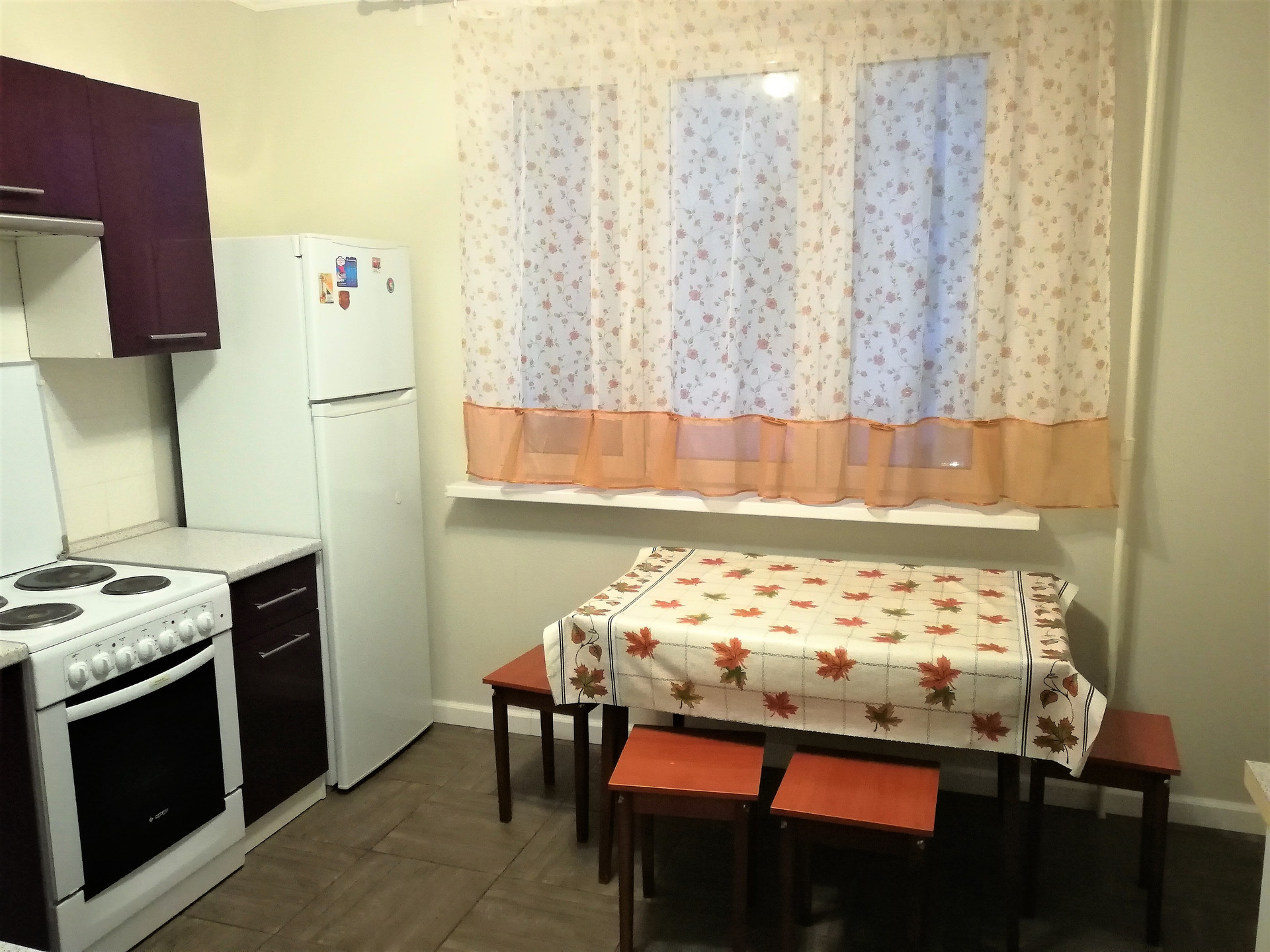 На кухне новый гарнитур, обеденный стол,стулья. Большой 2-х кам. холодильник, СМА ( стир. машина автомат)