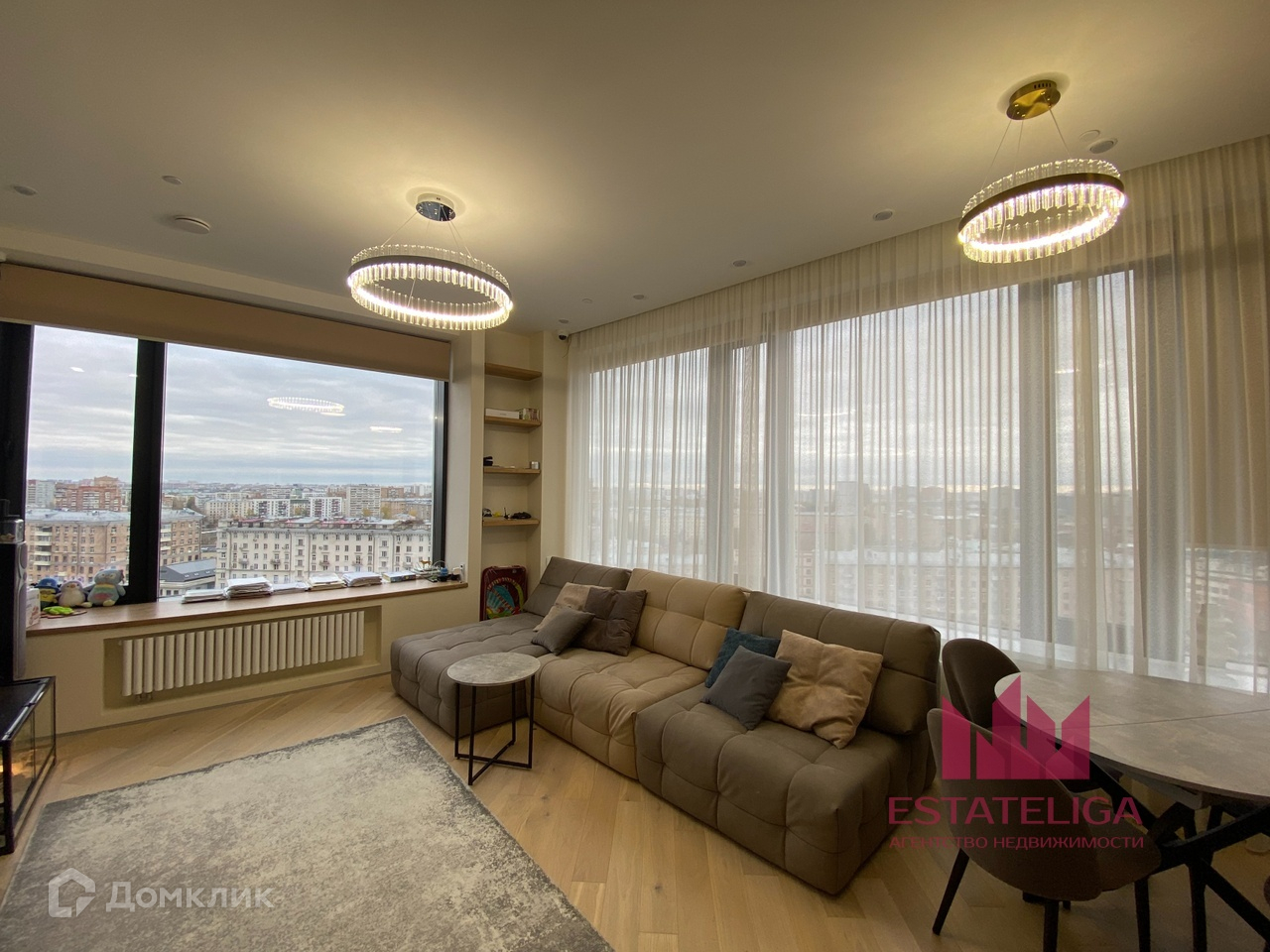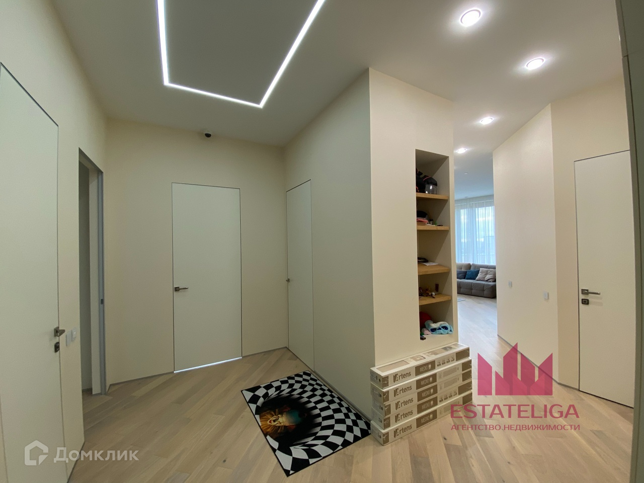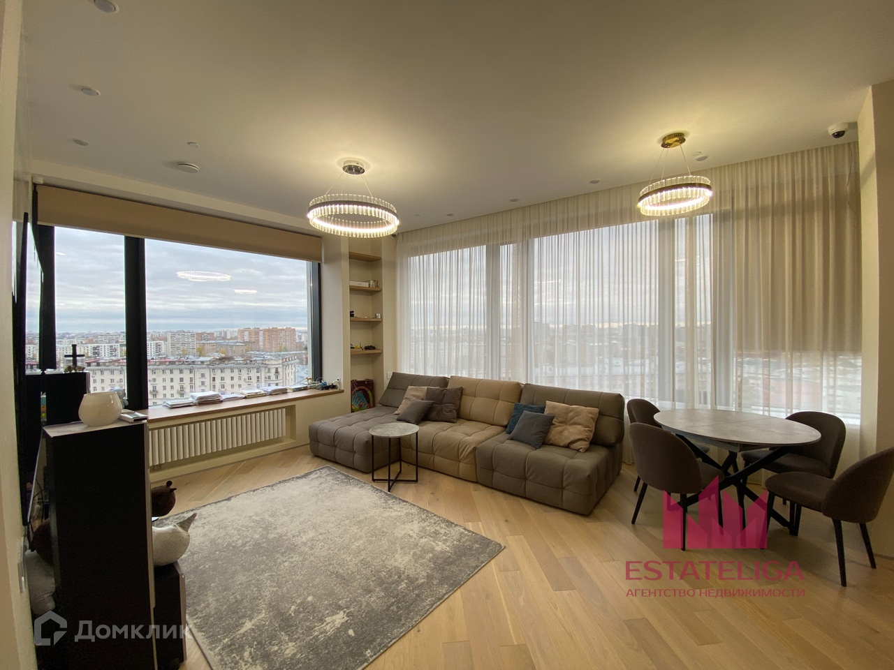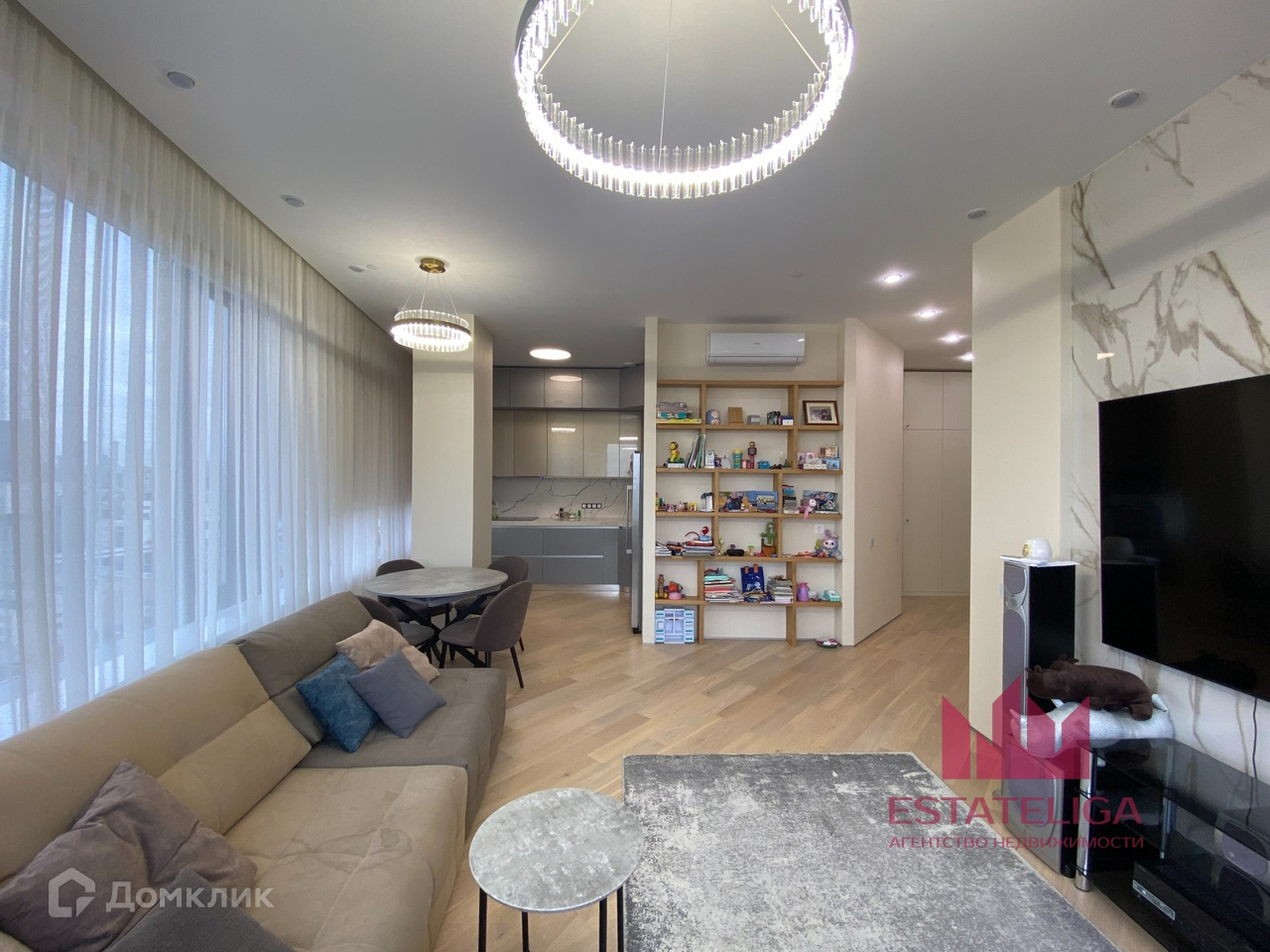 Планировка представляет собой: три изолированные комнаты, кухня-гостиная, два совмещенных санузла, гардеробная, хоз.блок. Много мест для хранения. Французский балкон. Телевизор в гостиной. Дизайнерская мебель.