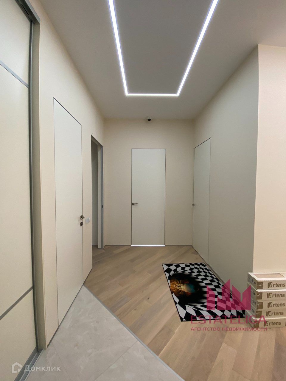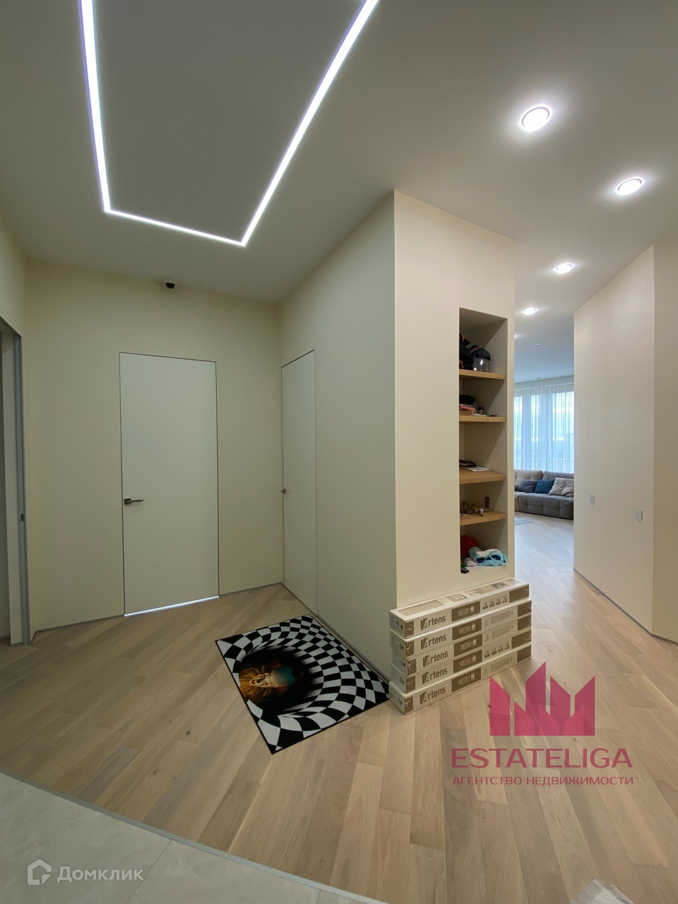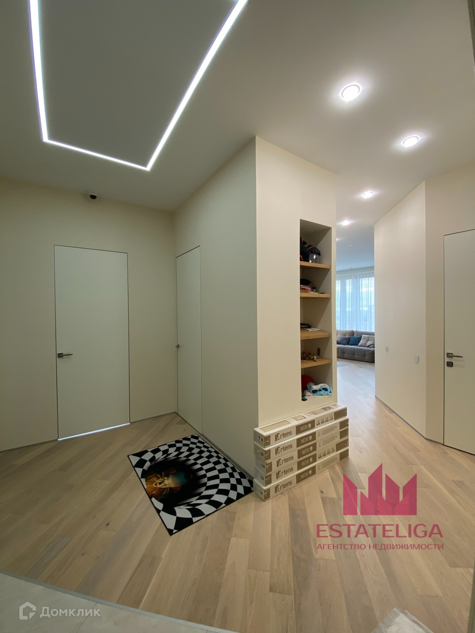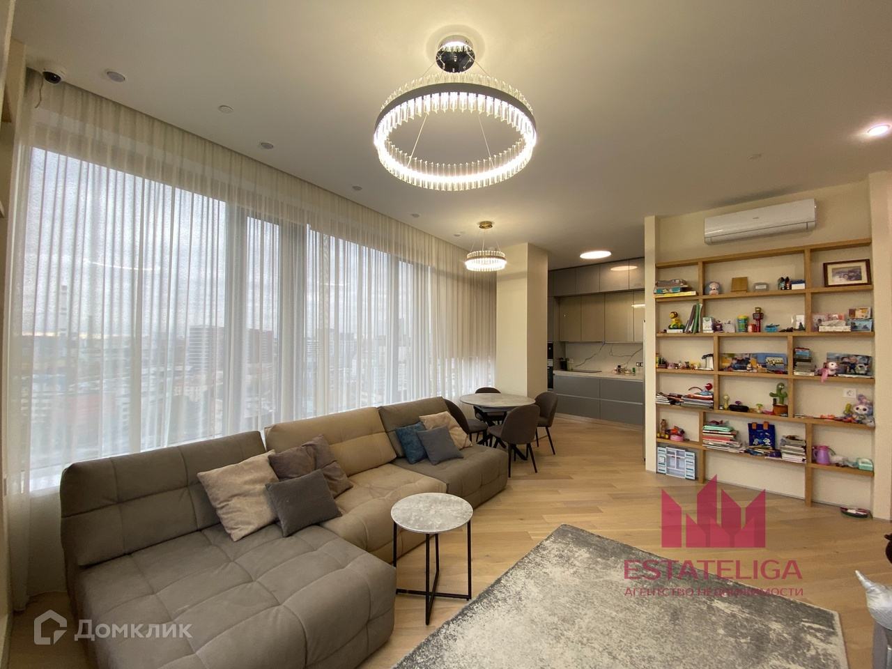 Планировка представляет собой: три изолированные комнаты, кухня-гостиная, два совмещенных санузла, гардеробная, хоз.блок. Много мест для хранения. Французский балкон. Телевизор в гостиной. Дизайнерская мебель.