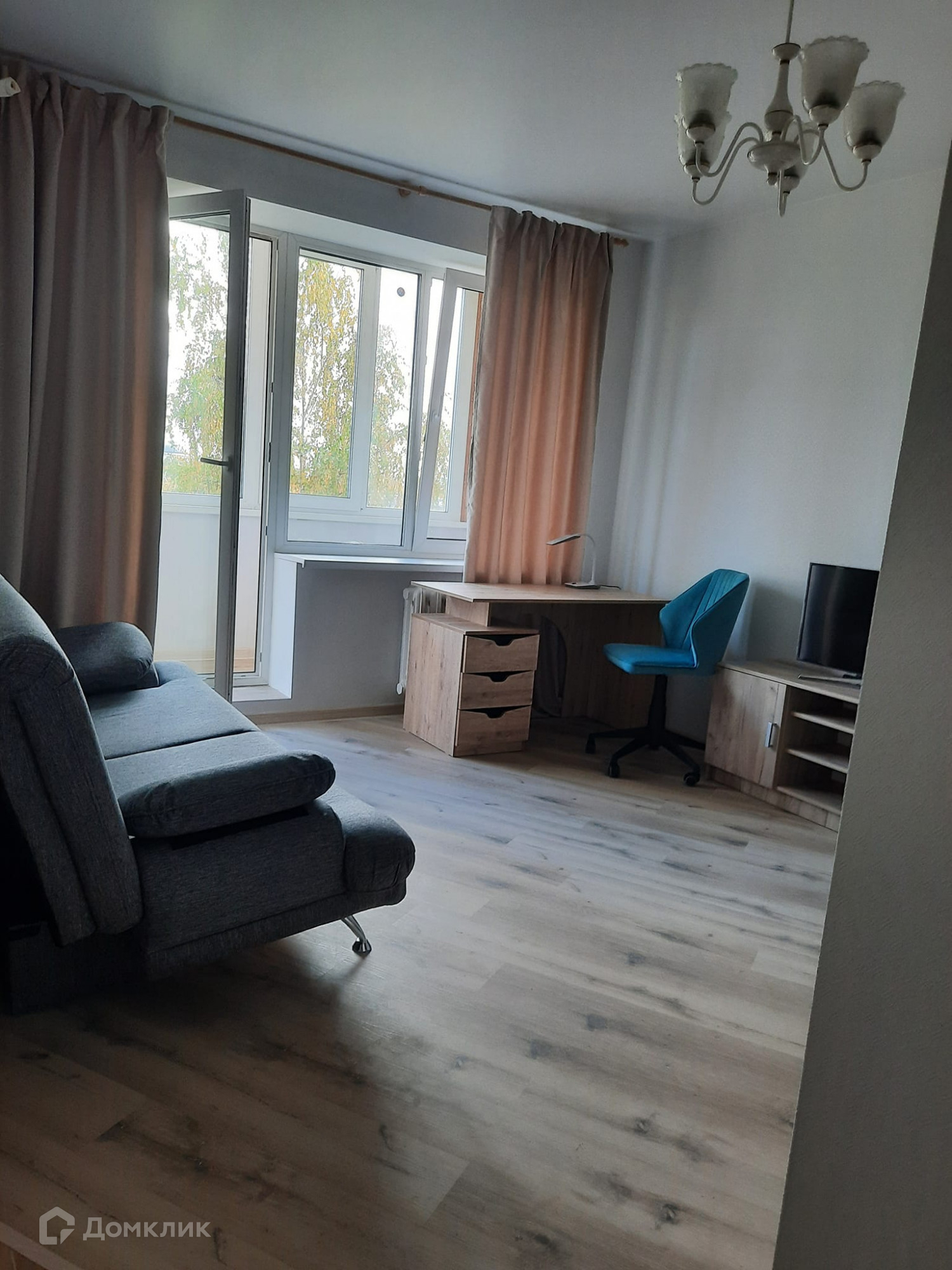 Из застекленной лоджии открывается роскошный вид в сторону Поклонной горы и Сити.  Только что закончили ремонт, сменили всё: окна, стены, пол и потолок,  водопроводную систему и электрику, поставили новую мебель, сделали встроенные шкафы. В комнате удалось выделить две зоны - отдельную спальню и гостиную с рабочим местом.  Квартира получилась симпатичной и удобной.