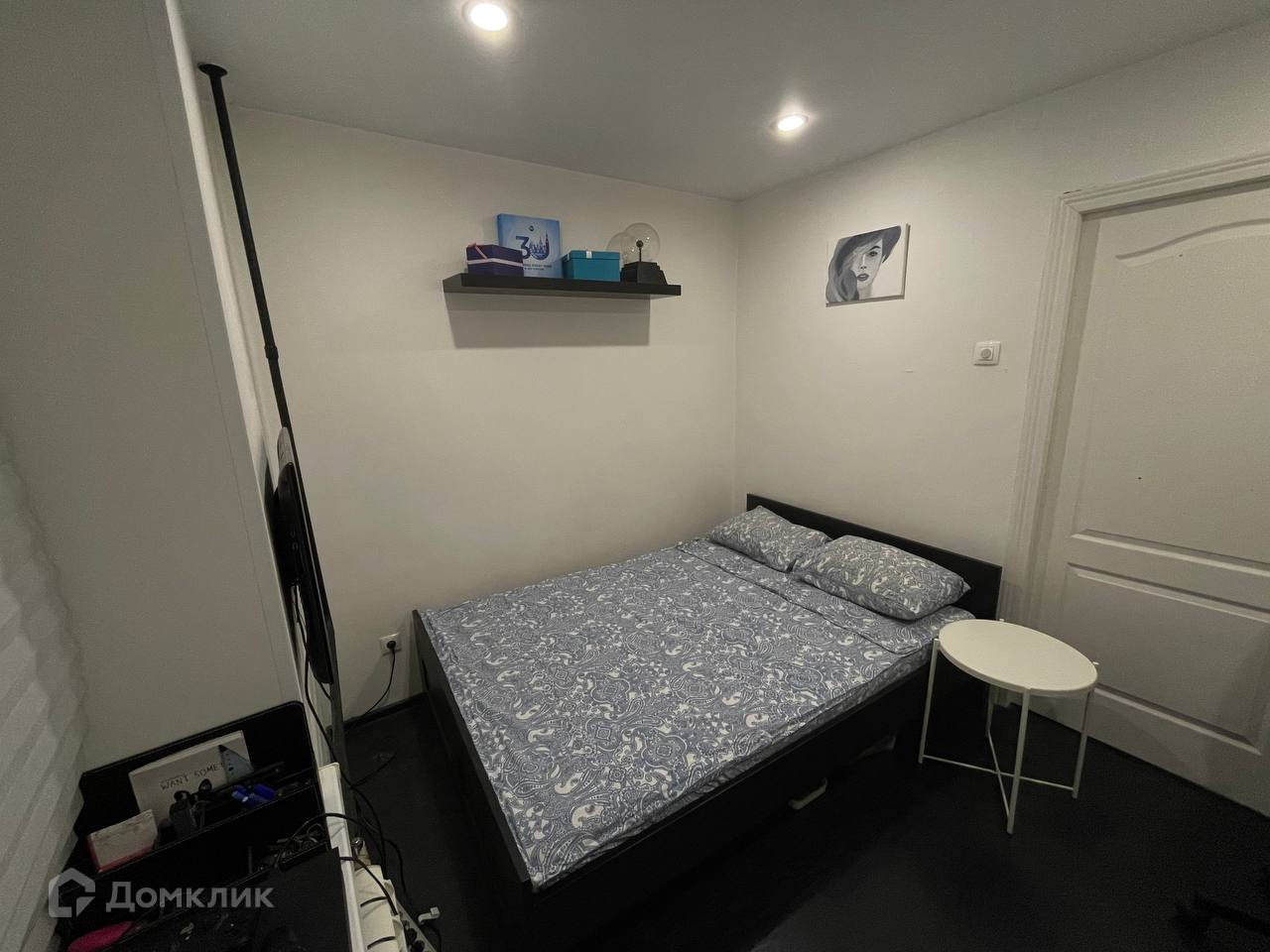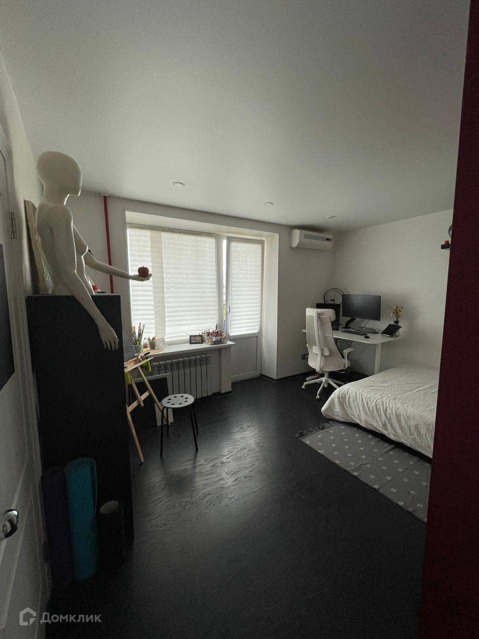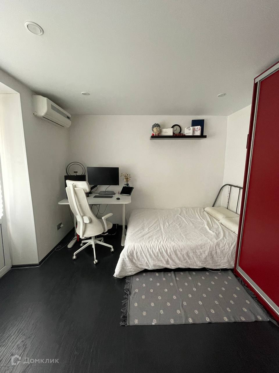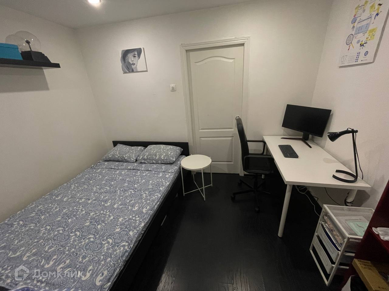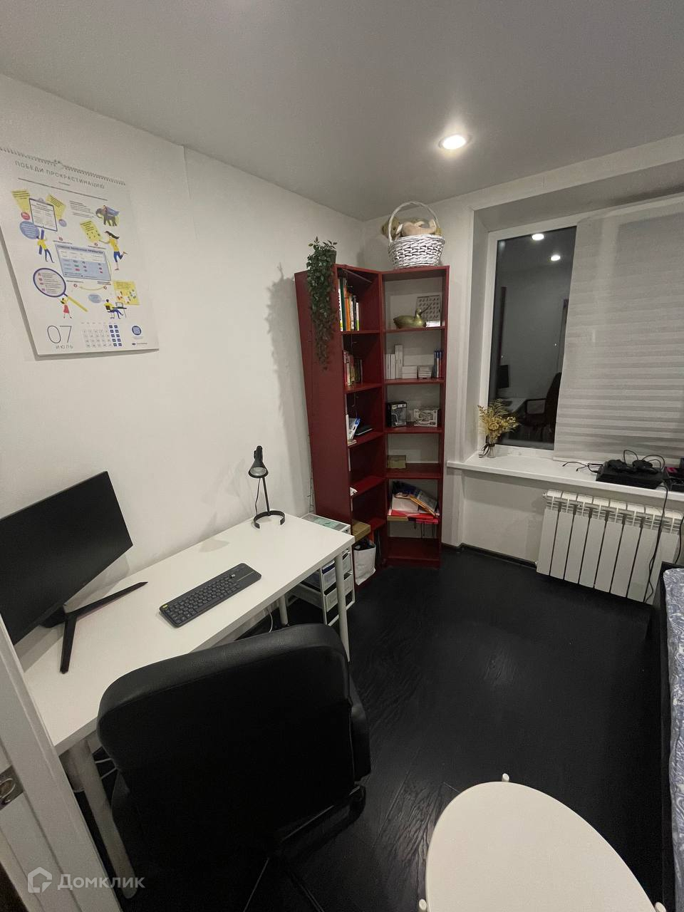 Из мебели: две двуспальные кровати, два стола, стулья, шкаф, две книжные полки, обувница, две подвесные полки, рейл, ящики для мелких вещей, черный стеллаж, вешалка для курток, маленький шкаф в прихожей.