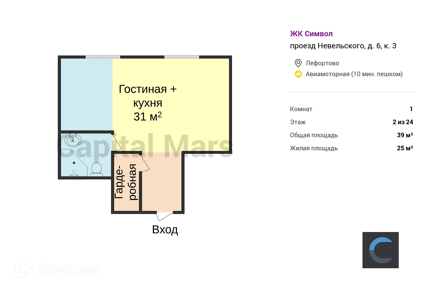 Общая площадь 39 м2