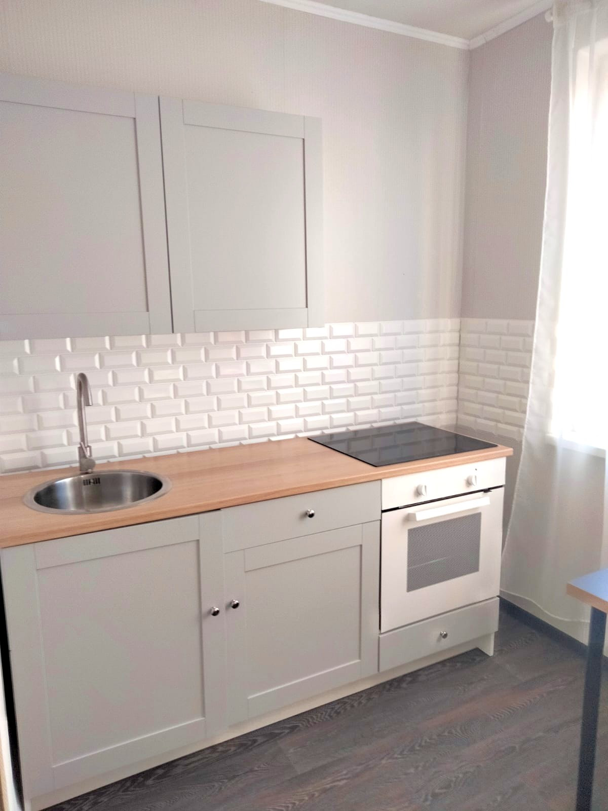 На кухне новый гарнитур, варочная панель, духовой шкаф, обеденная зона. Большой 2-х кам.  новый холодильник.