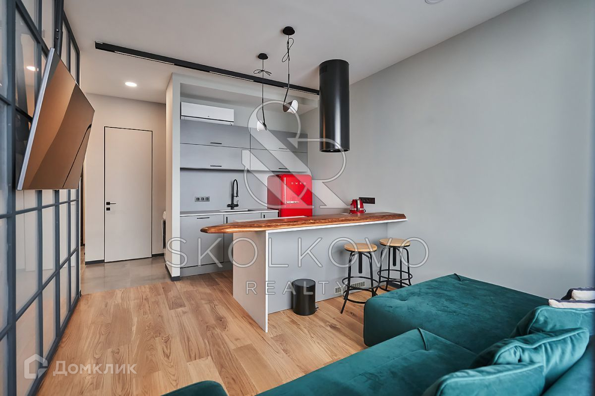 Функциональная планировка: гостиная-кухня, спальная комната, гардеробная, совмещенный санузел.