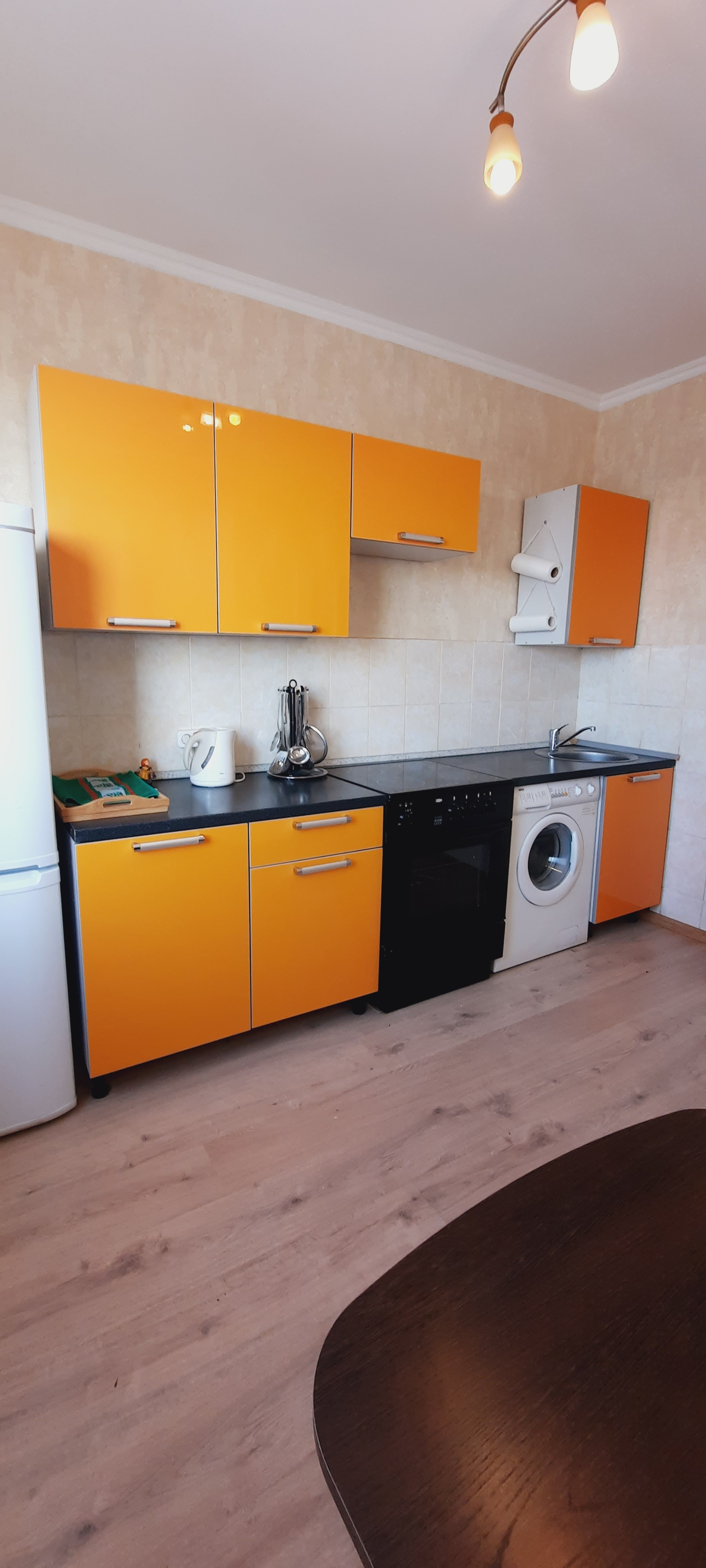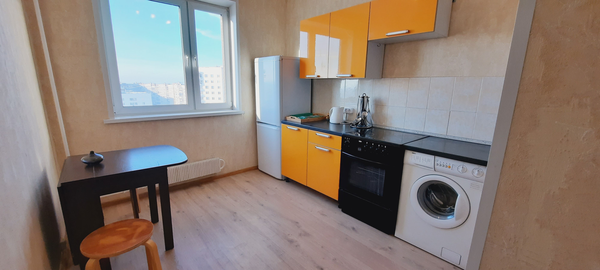 В квартире просторная кухня с современным лаконичным гарнитуром. Так же имеется объемная ниша для хранения вещей. В квартире минимум мебели, что позволит вам привезти и поставить свою. Из необходимого имеется плита с духовкой, стиральная машина, холодильник.