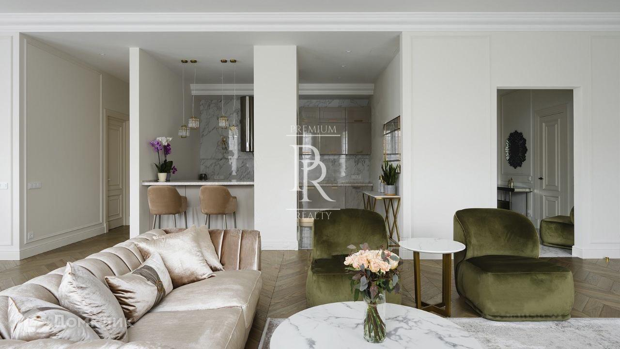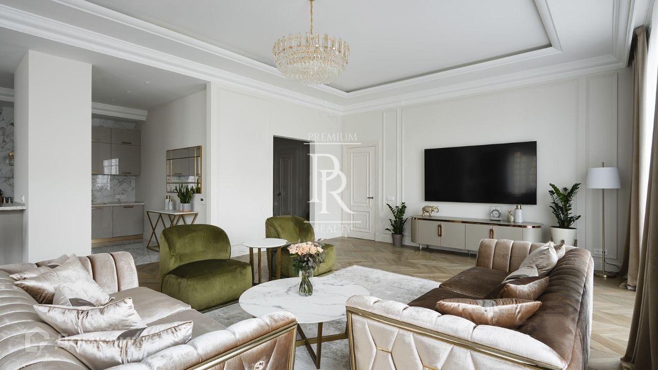 Просторная квартира общей площадью 200 м² на 3 этаже клубного дома в Хамовниках. Выполнен дизайнерский ремонт в стиле неоклассики. В квартире с потолками 3,5 метров спланирована кухня с бытовой техникой, столовая на шесть персон и гостиная с уютной зоной отдыха. В спальнях с панорамными окнами оборудованы гардеробные. Выход на общую открытую террасу предусмотрен из гостиной и спальни. Санузлы оснащены ванной и душевой кабиной. Окна квартиры выходят на улицу. Кладовая и два машина-места в подземном паркинге входят в стоимость аренды.