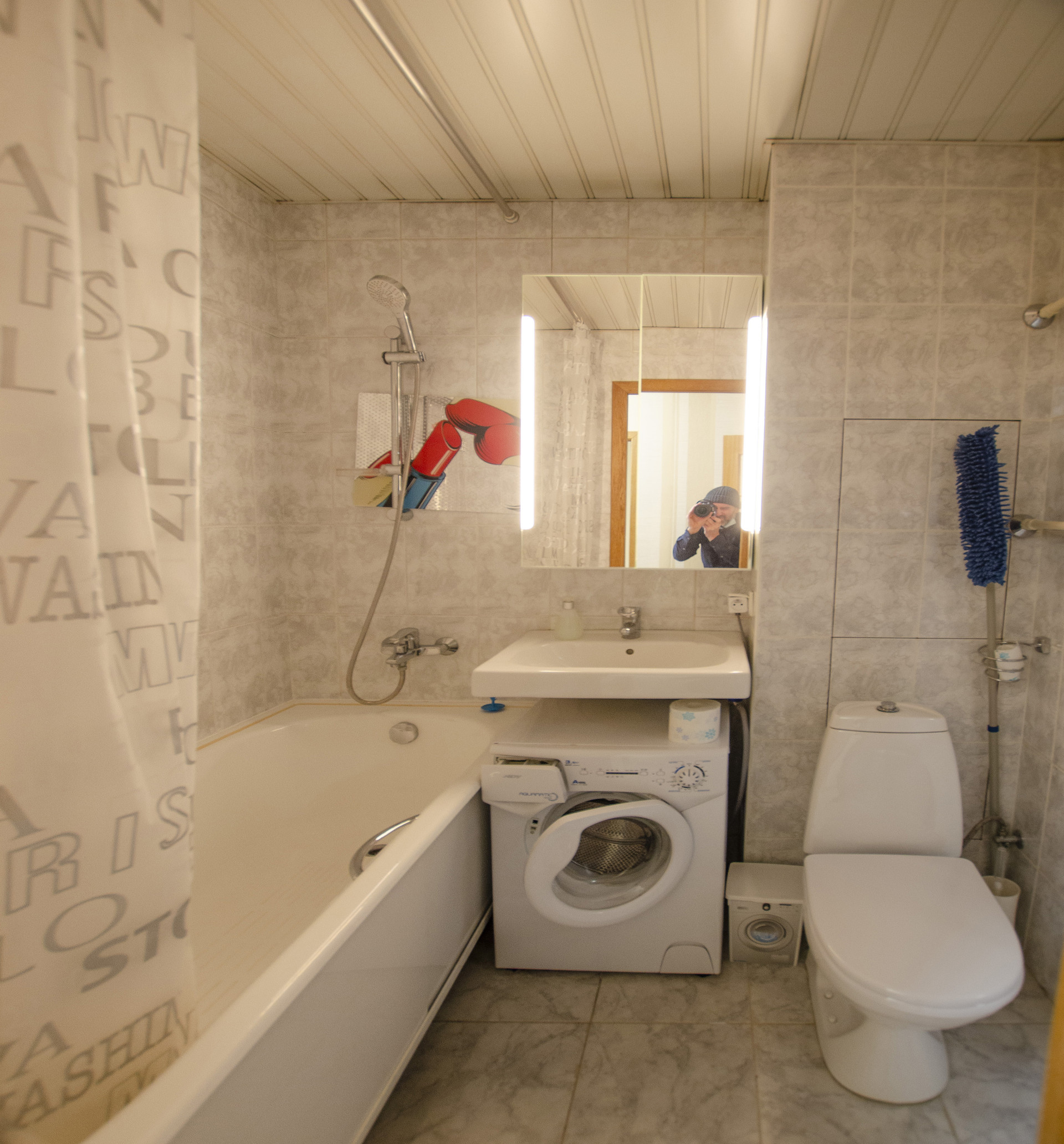 Совмещенный санузел со стиральной машиной и плиткой в потолок. В прихожей шкаф купе с зеркалом и подогреваемый пол из плитки.