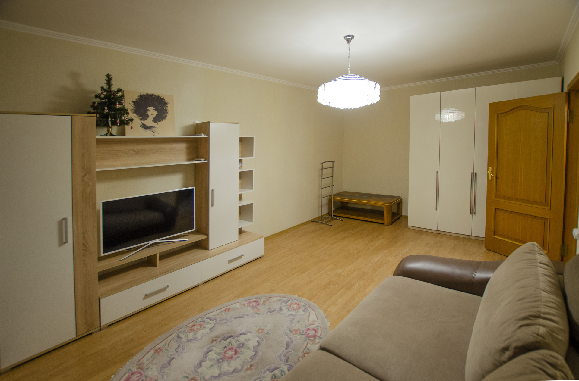 Просторная комната с выходом на застекленный балкон, полностью меблирована: имеются мягкий раскладной диван-кровать с ортопедическим матрасом, практичные системы хранения, включая несколько шкафов с зеркалами, кондиционер на тепло + холод, LED телевизор, сушилка, гладильная доска. Ламинат, стеклопакет.