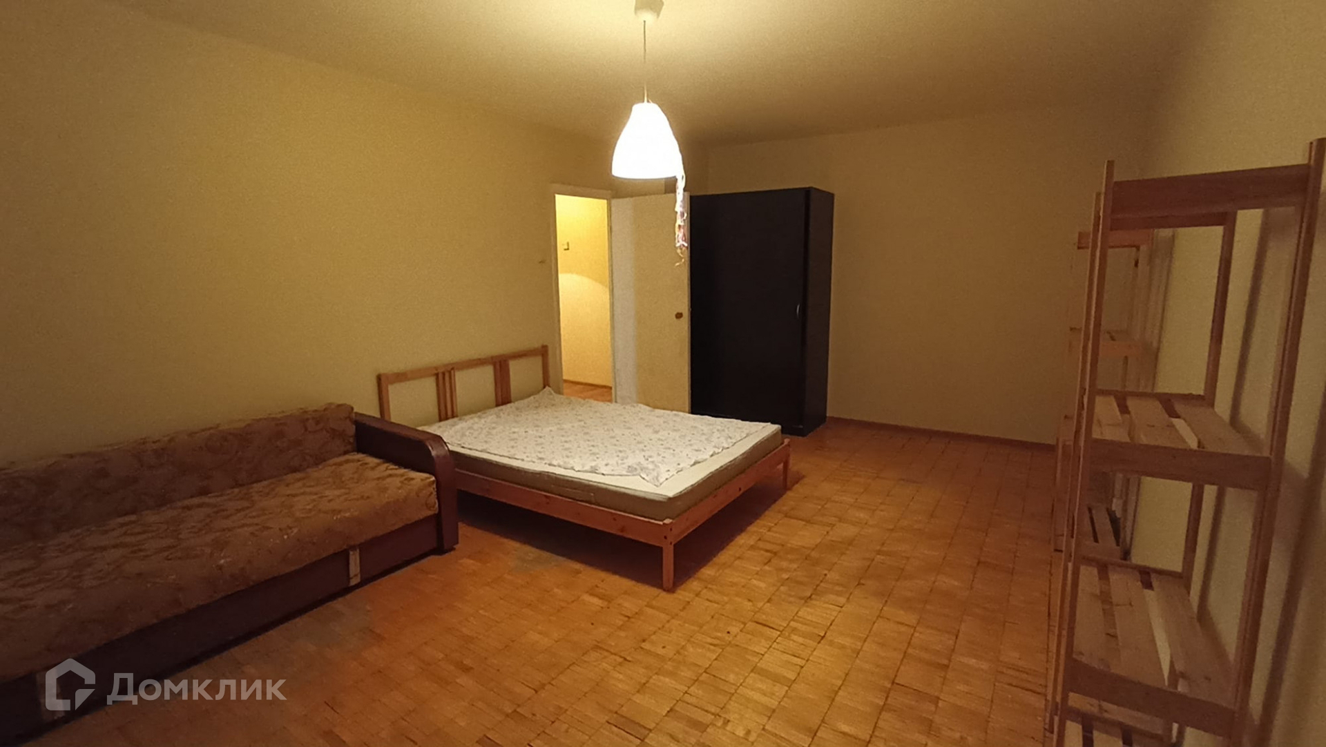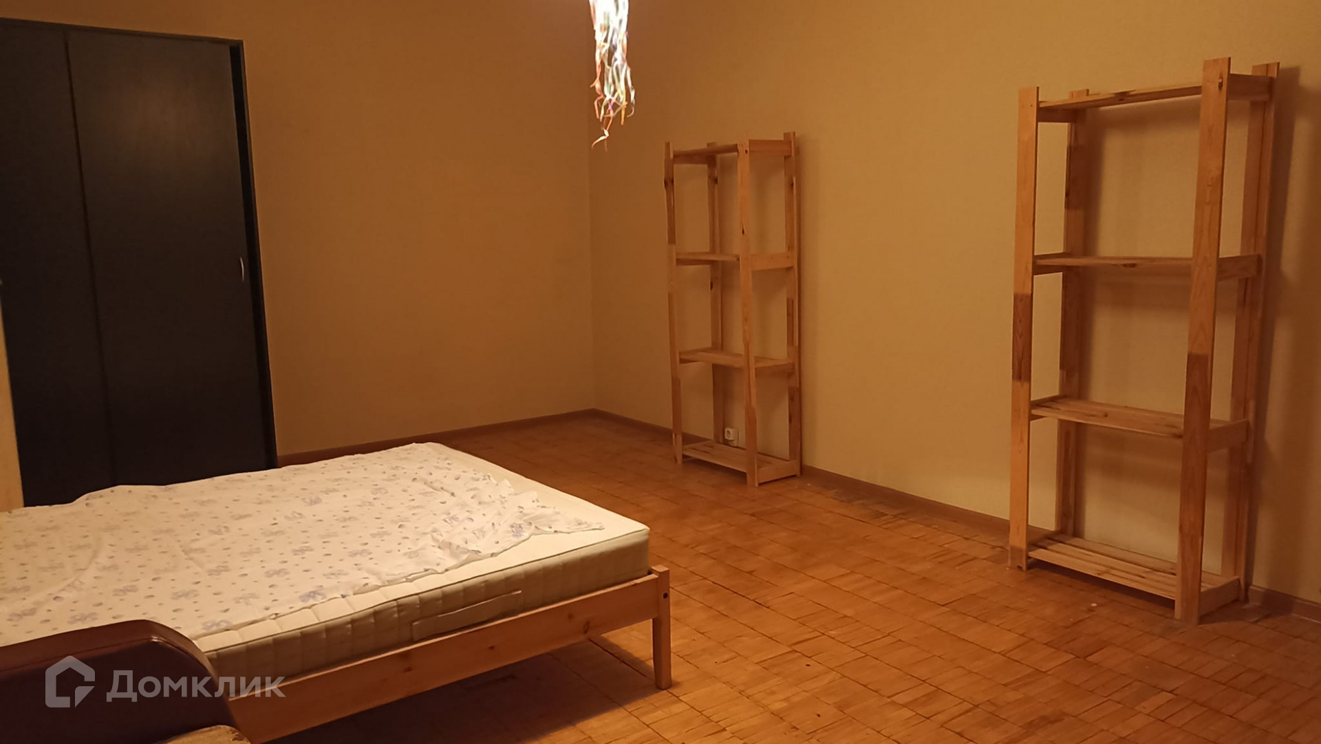 Минимум мебели, кровать, диван, два стеллажа, шкаф.