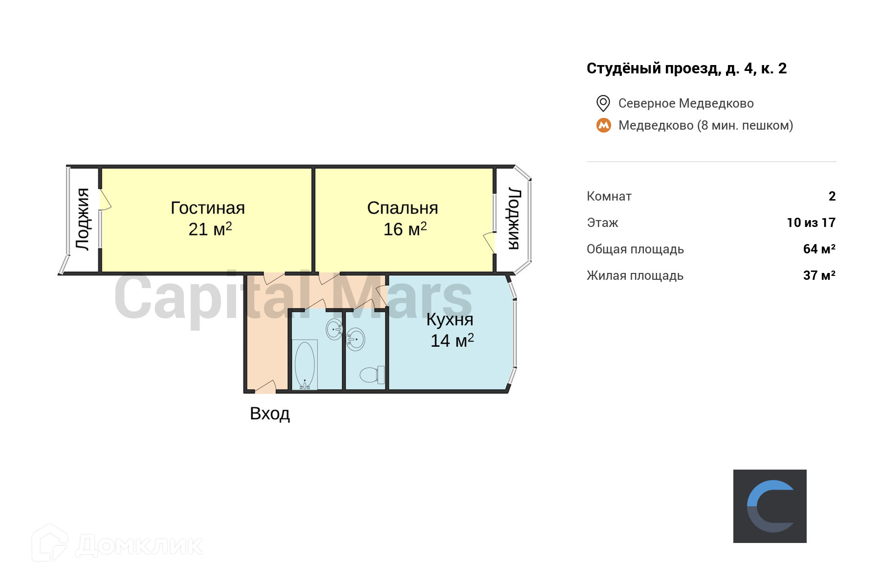 Общая площадь 64 м2