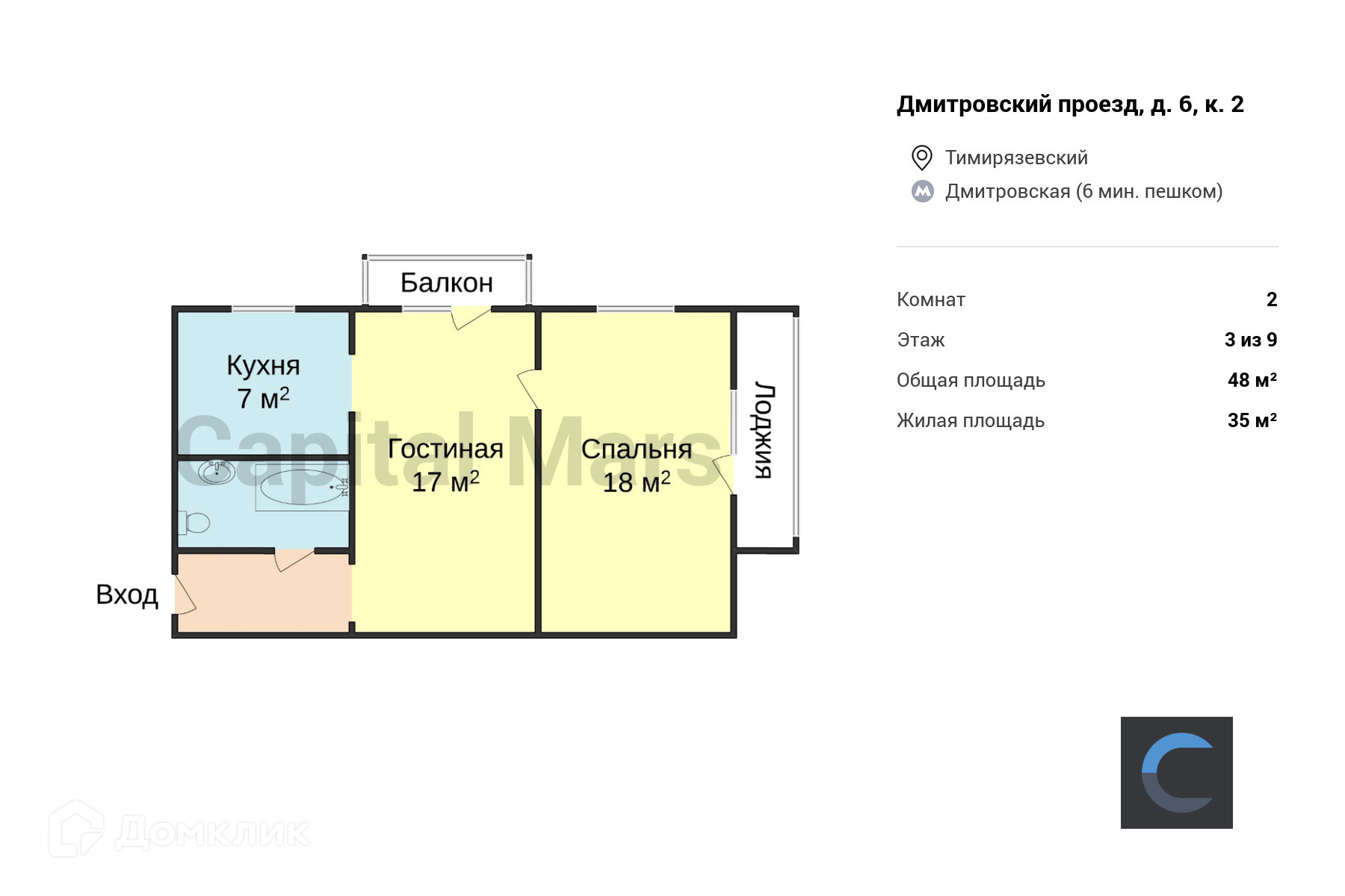 2-комнатная квартира, 48 м2, в аренду на длительный срок в Москве, Дмитровский проезд, 6к2