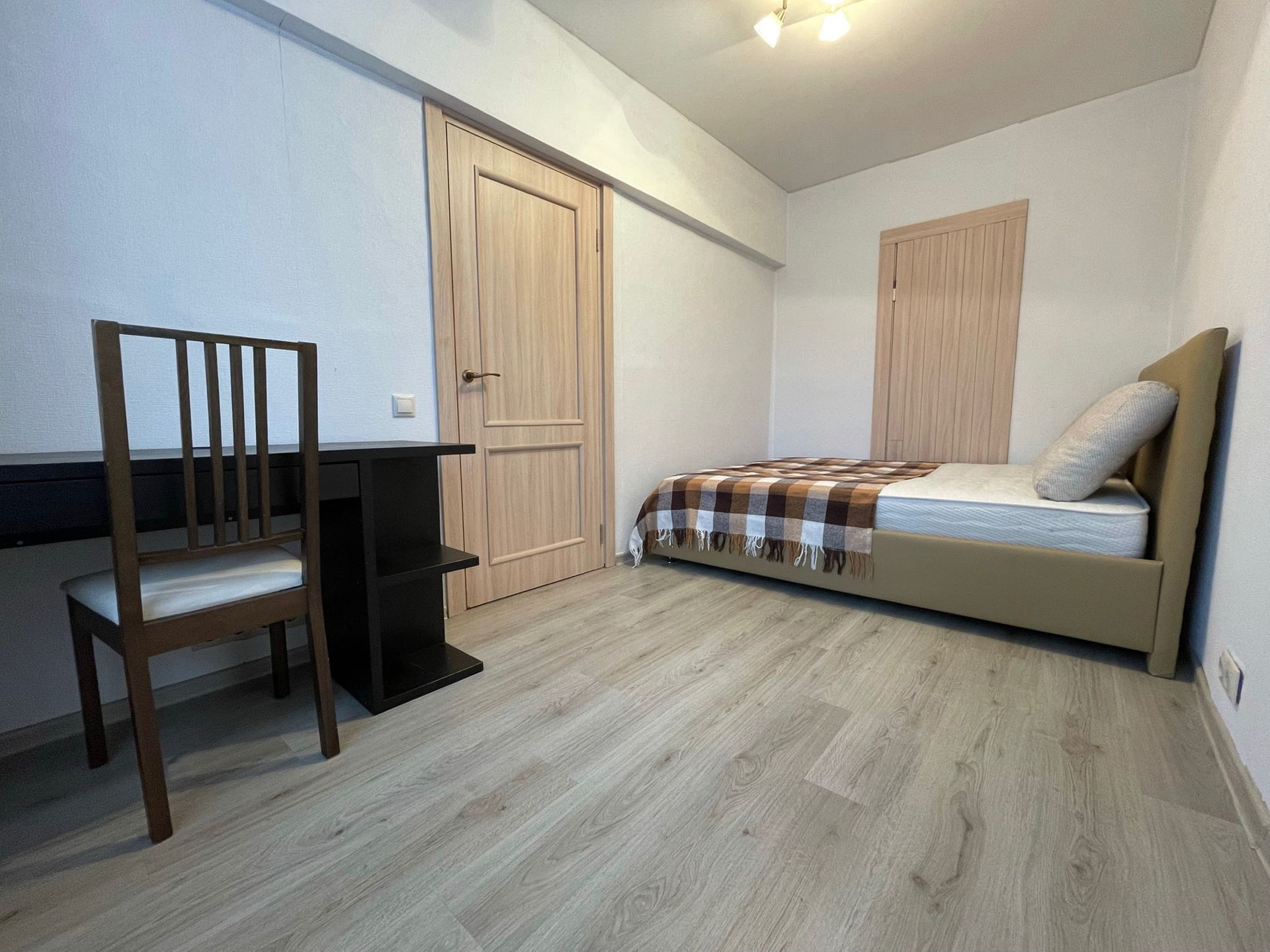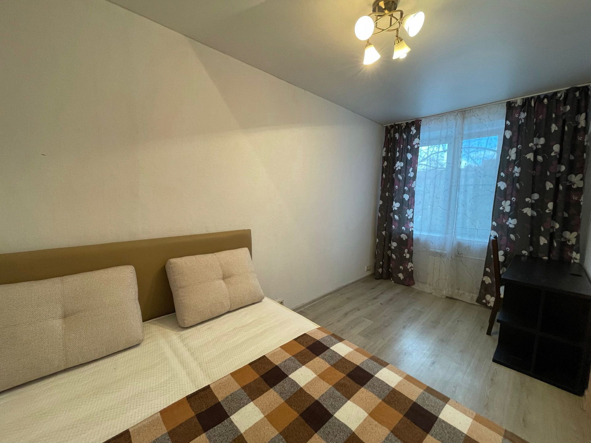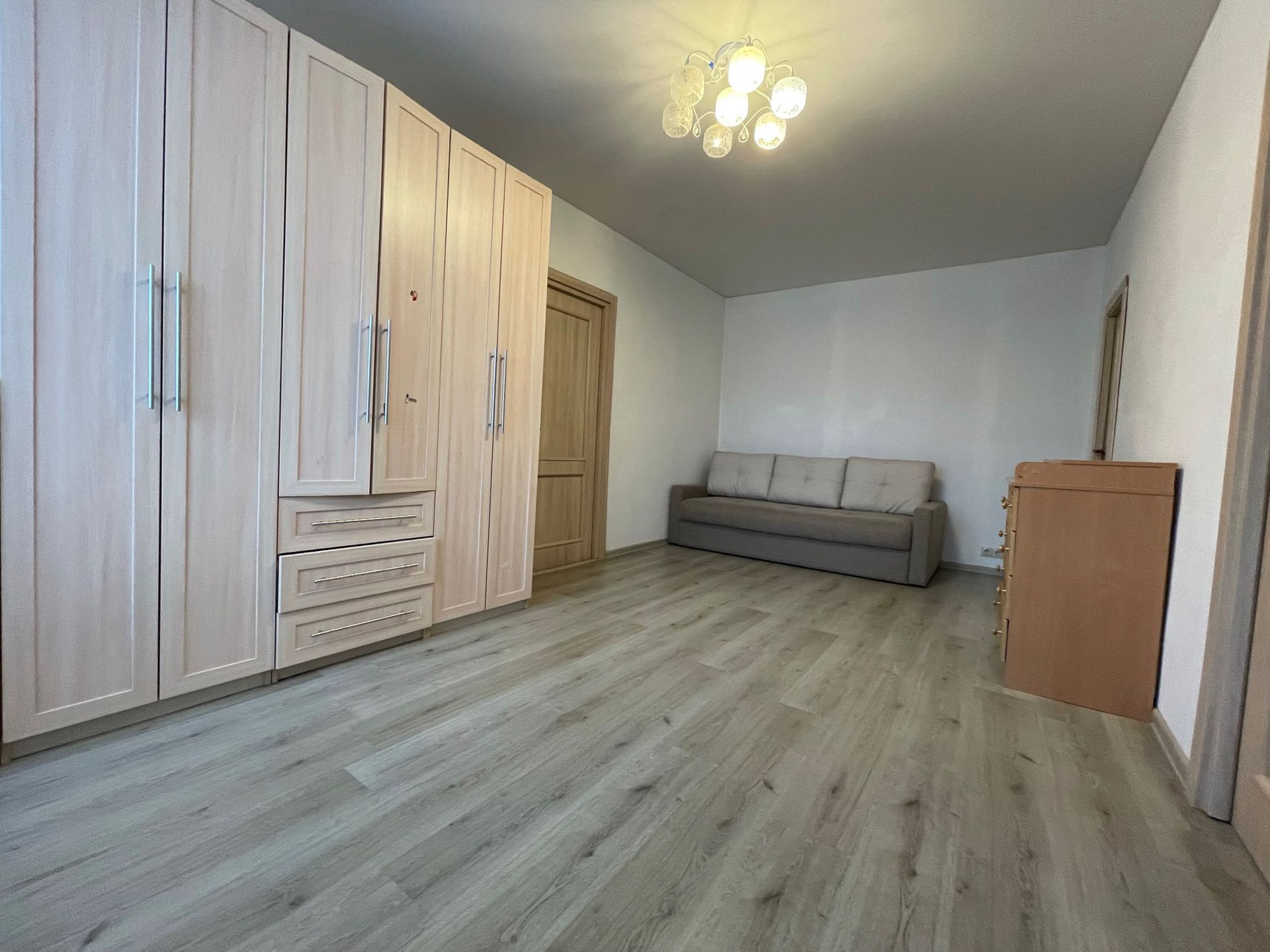 В спальне  есть все необходимое для комфортного проживания: двуспальная кровать, стол консоль, третья комната проходная оборудована вместительными шкафами, есть кладовая комната.