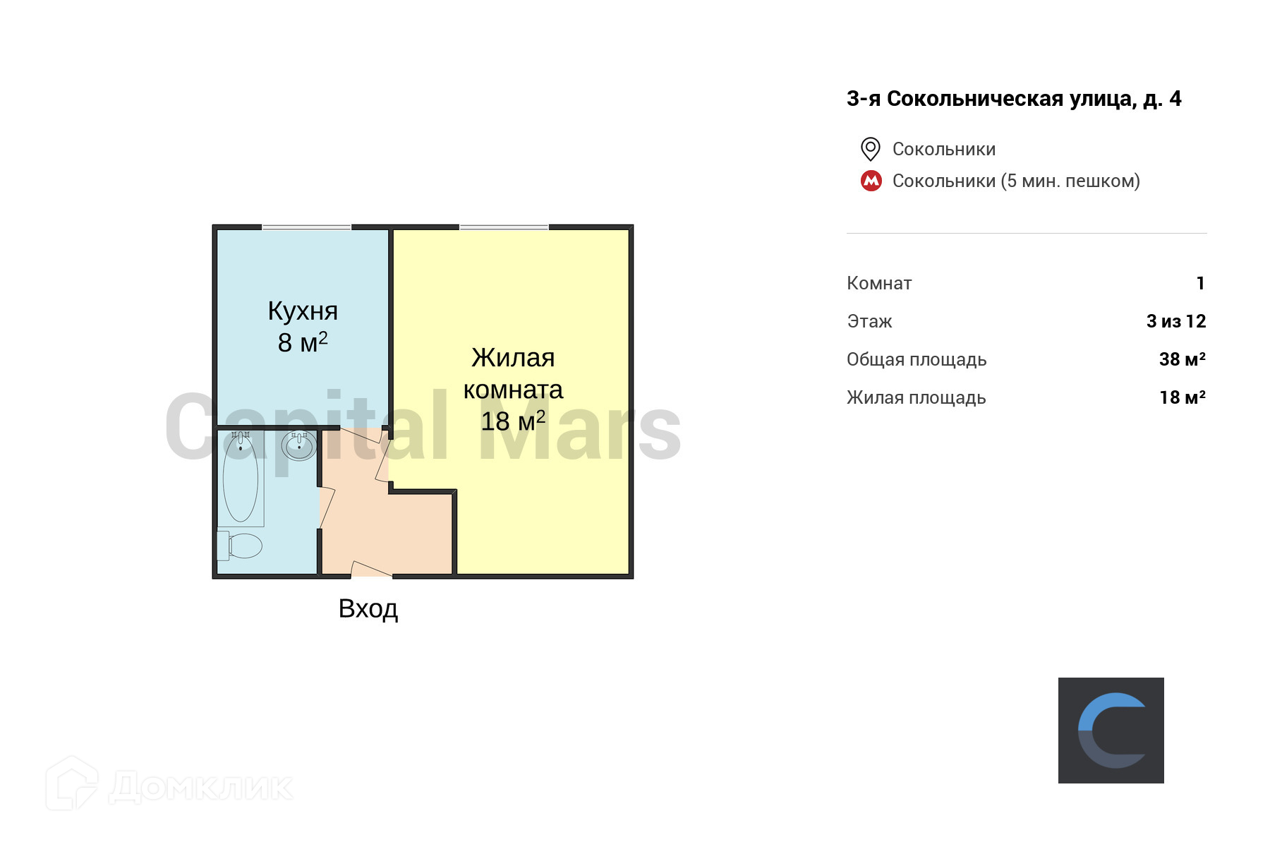 Общая площадь 38 м2