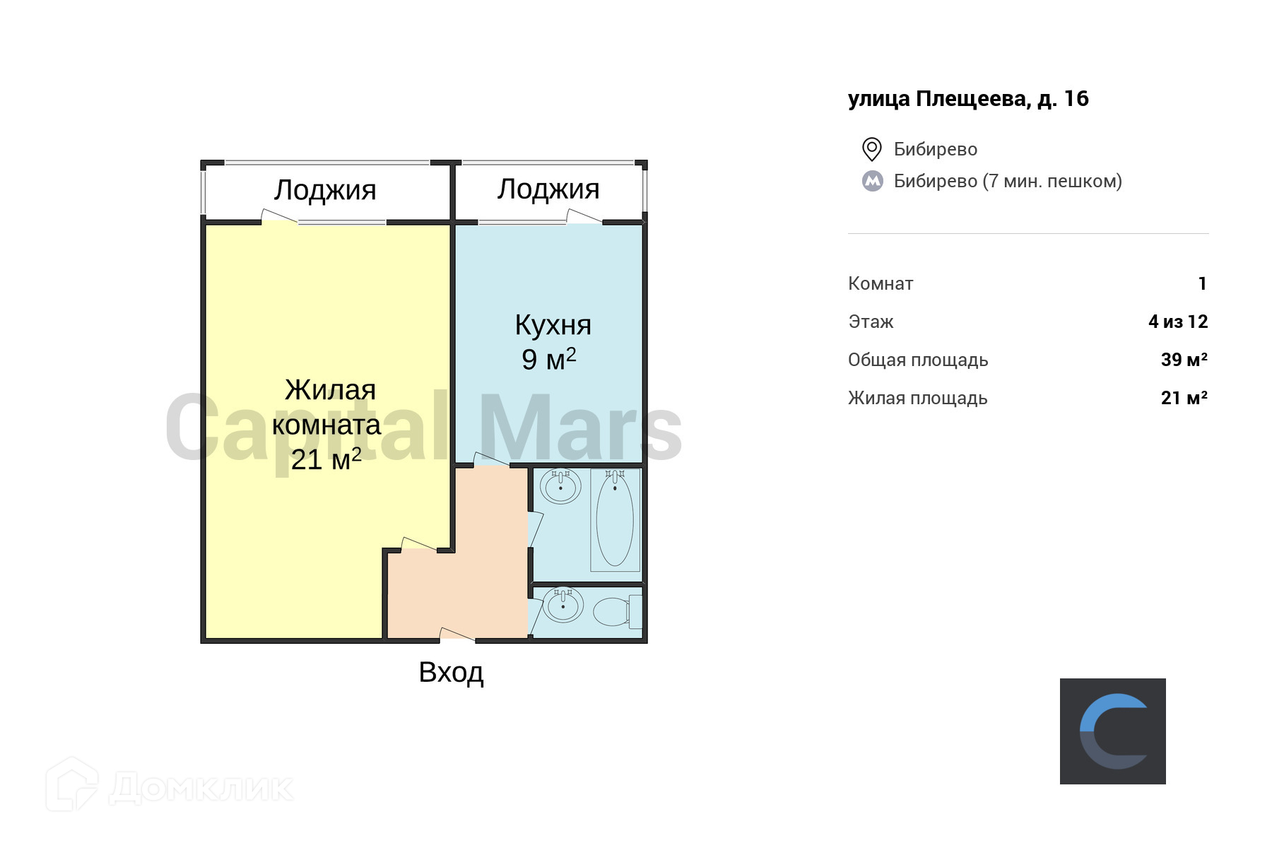 Общая площадь 39 м2