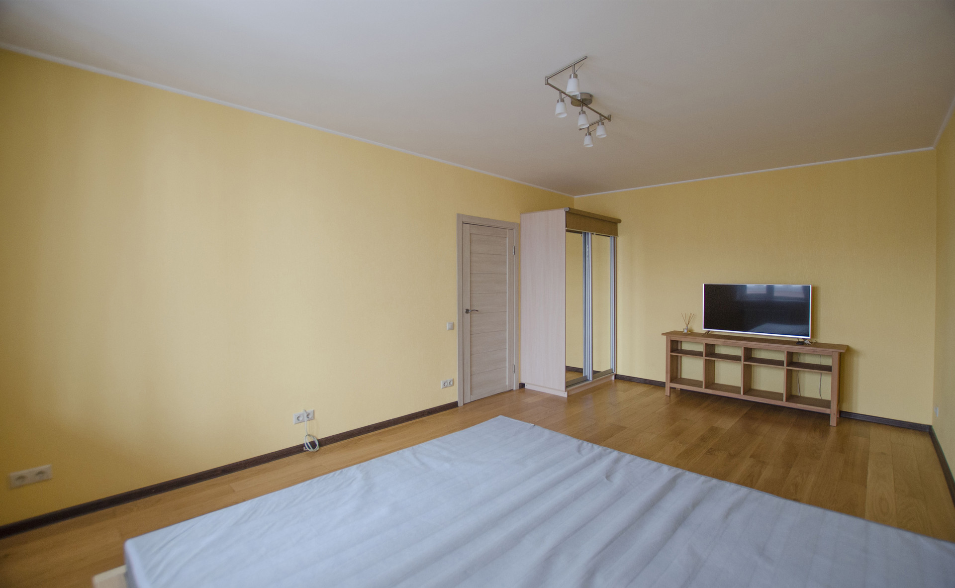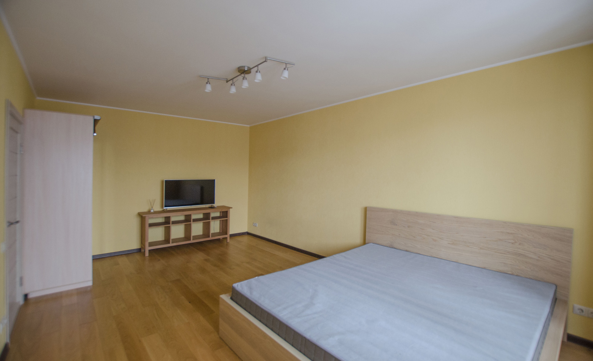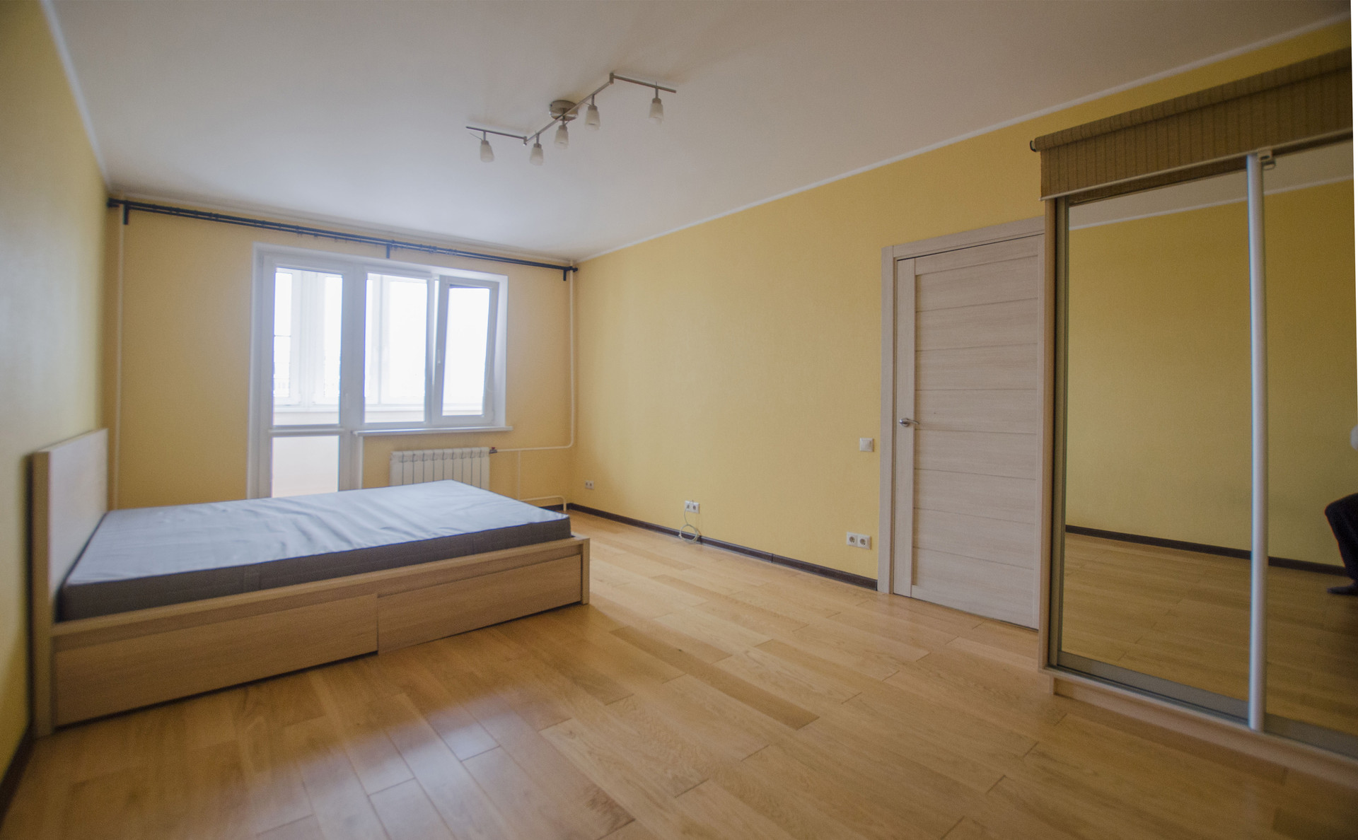 Просторная комната с выходом на застекленный балкон, полностью меблирована: имеются широкая двуспальная кровать, практичные системы хранения, включая шкаф с зеркалами и LED телевизор. Ламинат, стеклопакет.