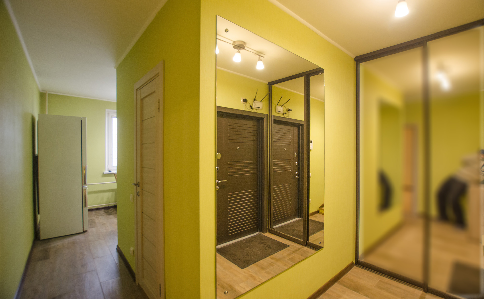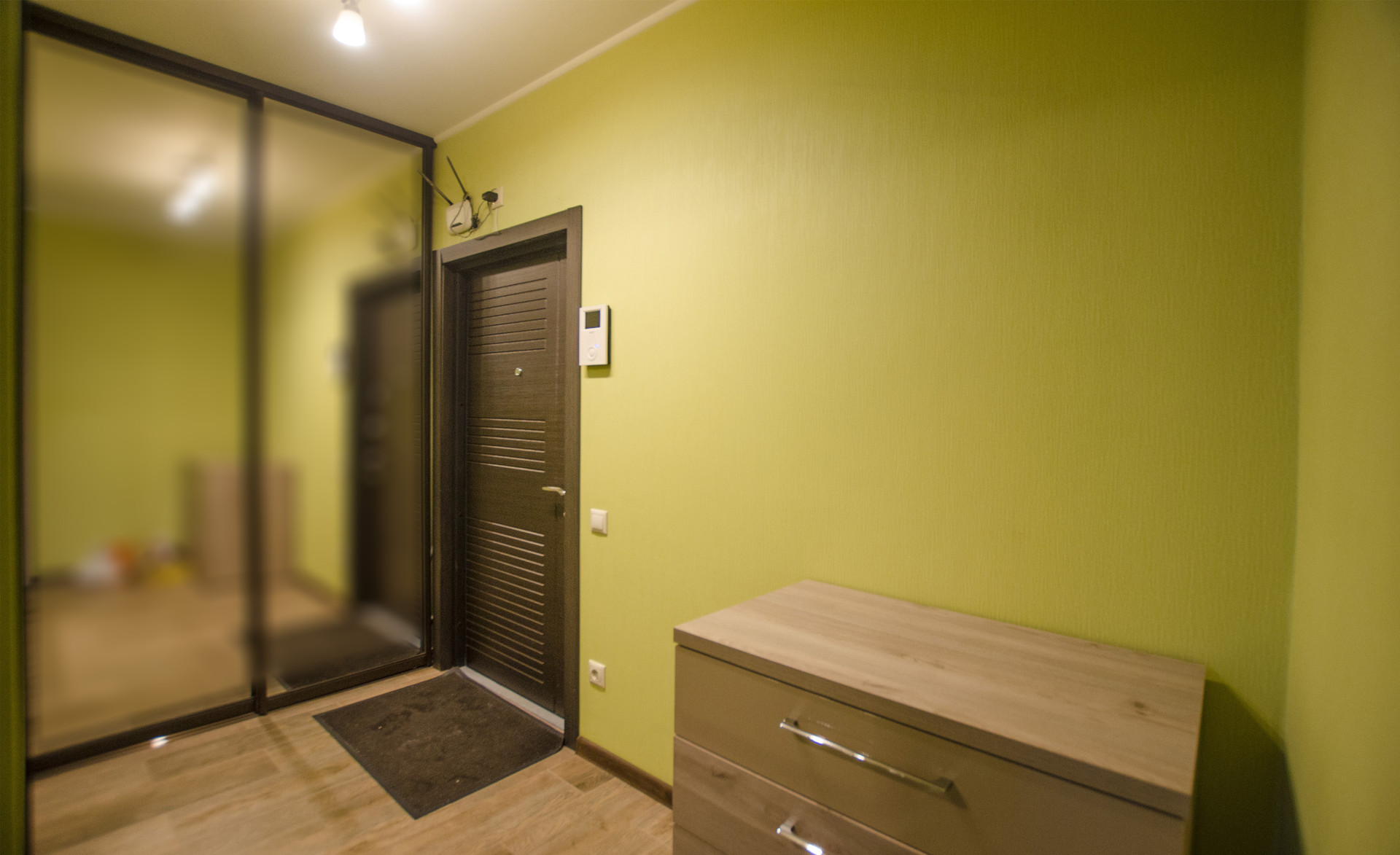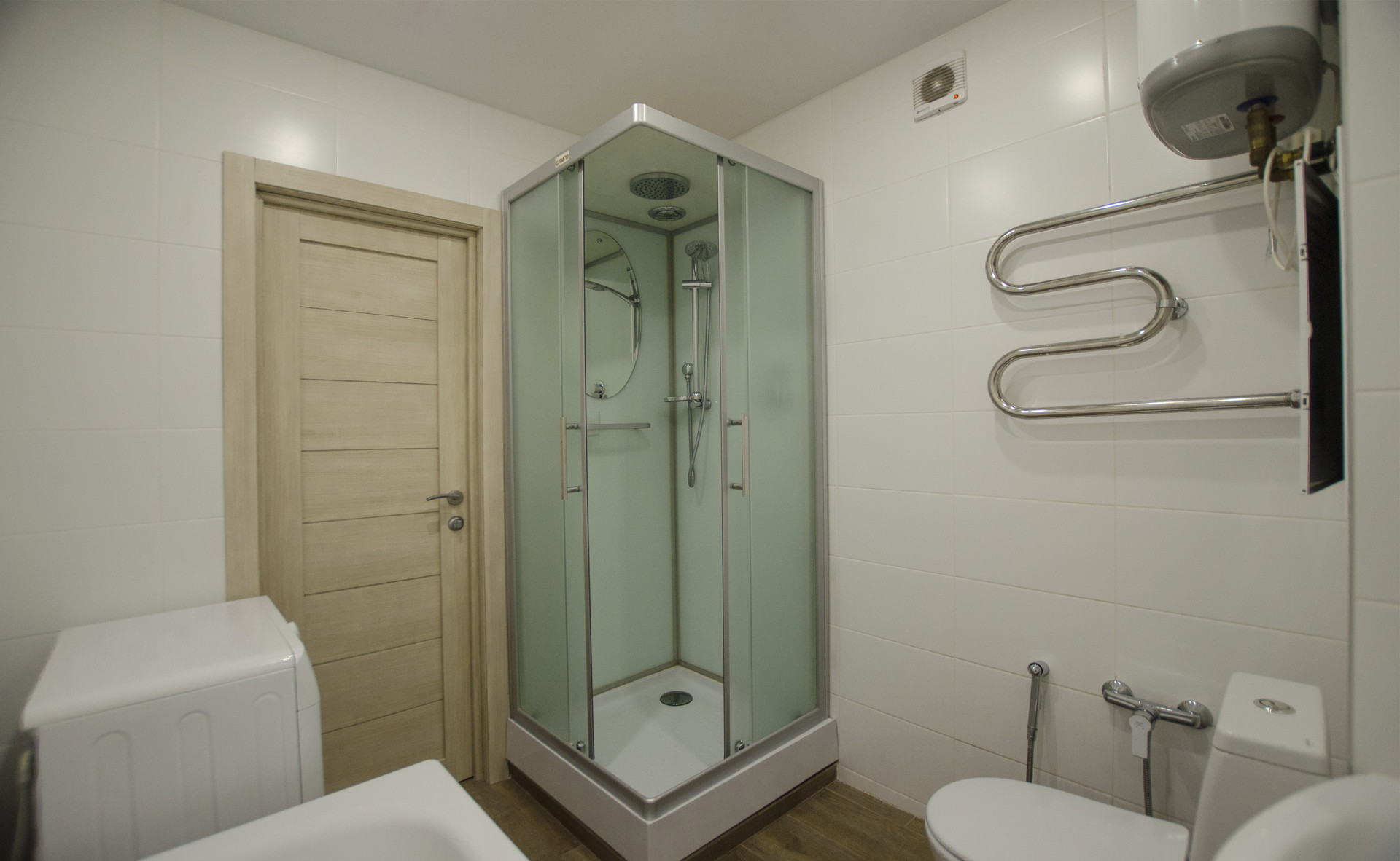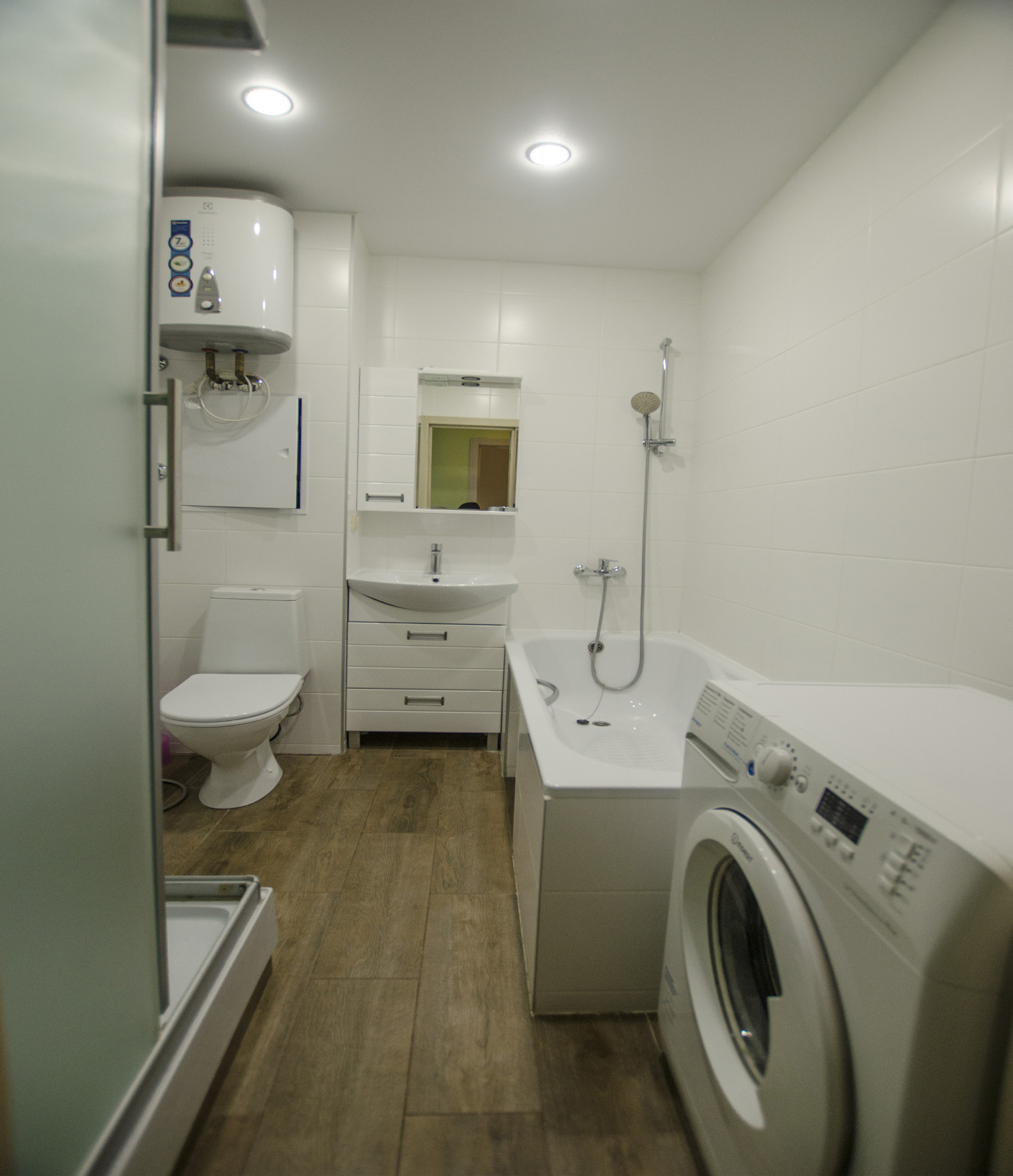Совмещенный санузел с ванной и дешевой кабиной, со стиральной машиной и плиткой в потолок. Подогреваемый пол. Бойлер. В прихожей большой встроенный шкаф-купе с зеркалом, видеодомофоном и подогреваемым полом.