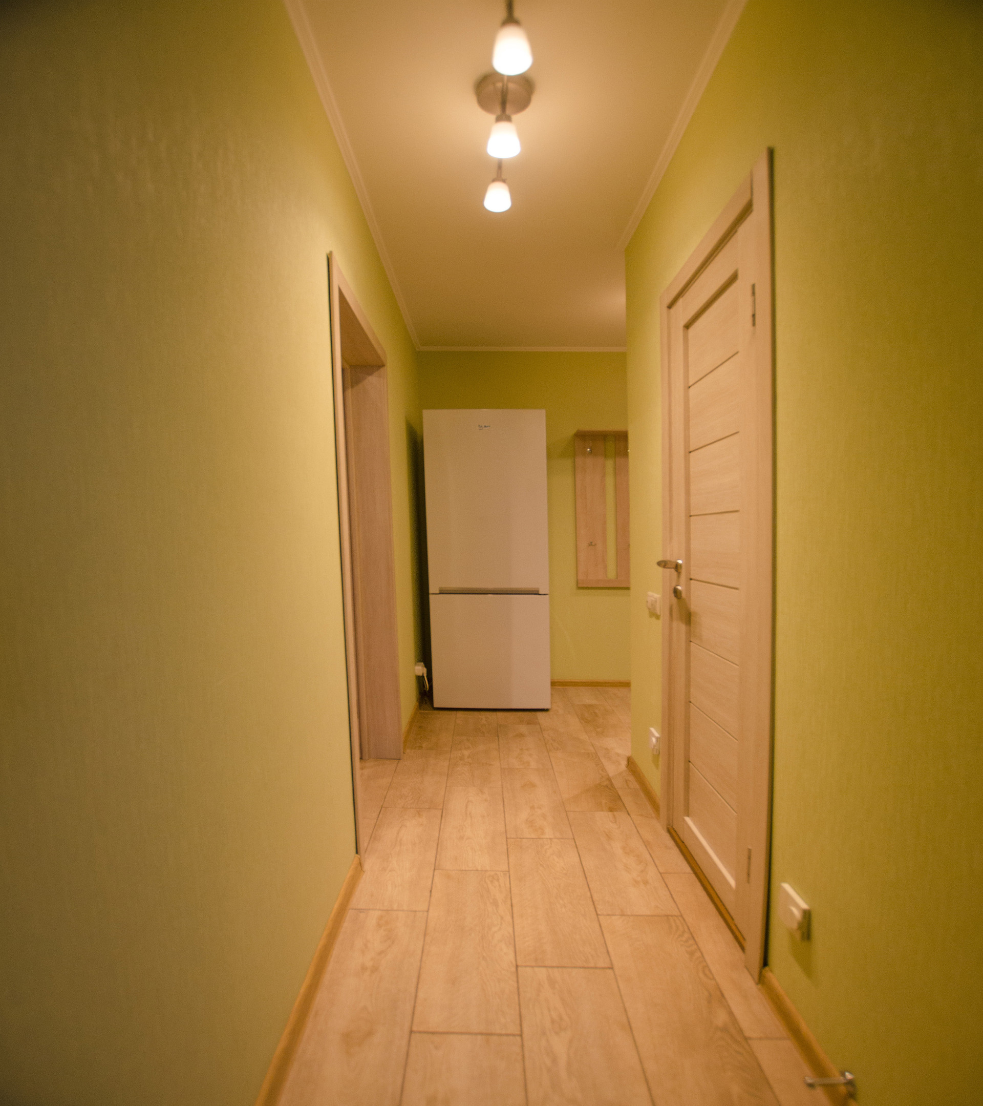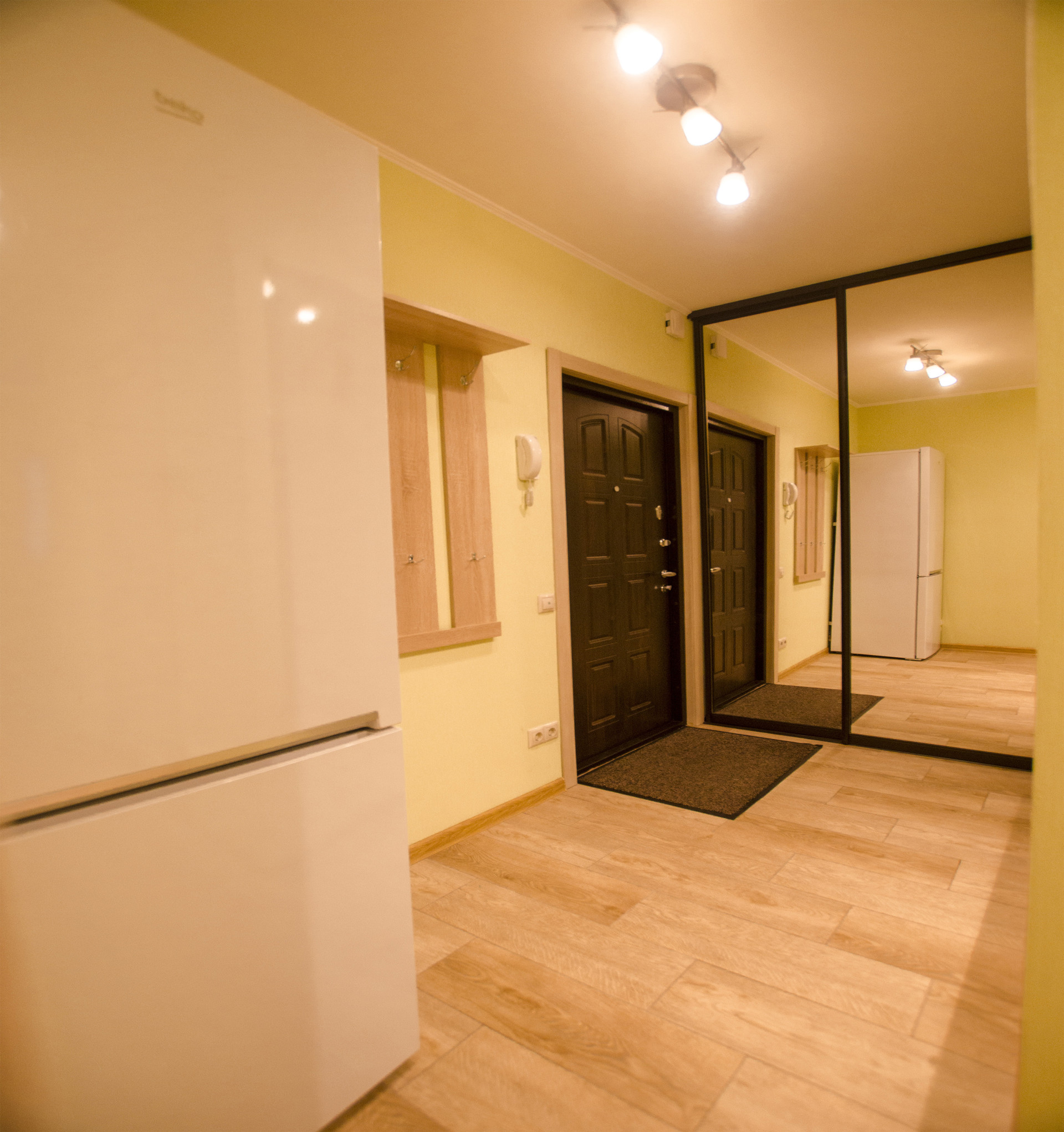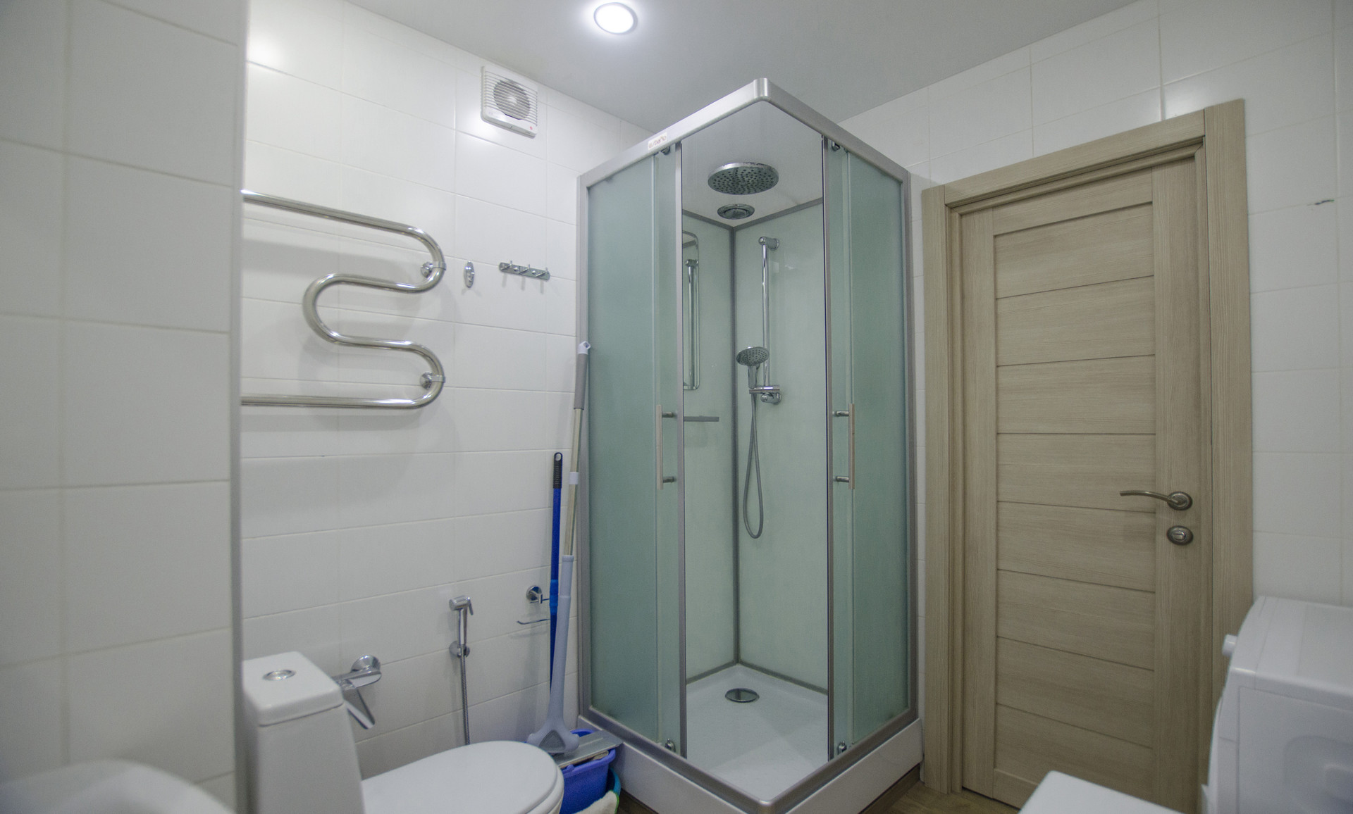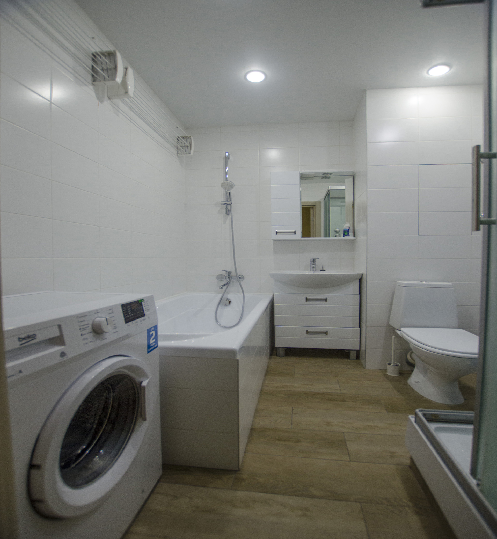 Совмещенный санузел с ванной и дешевой кабиной, со стиральной машиной и плиткой в потолок. Подогреваемый пол. В прихожей большой встроенный шкаф-купе с зеркалом, видеодомофоном и подогреваемым полом.