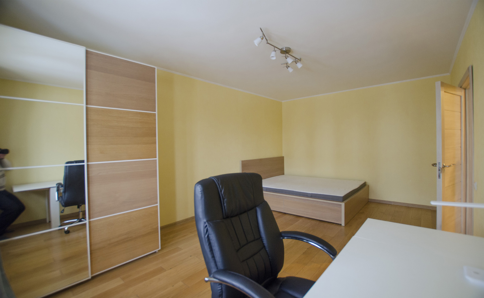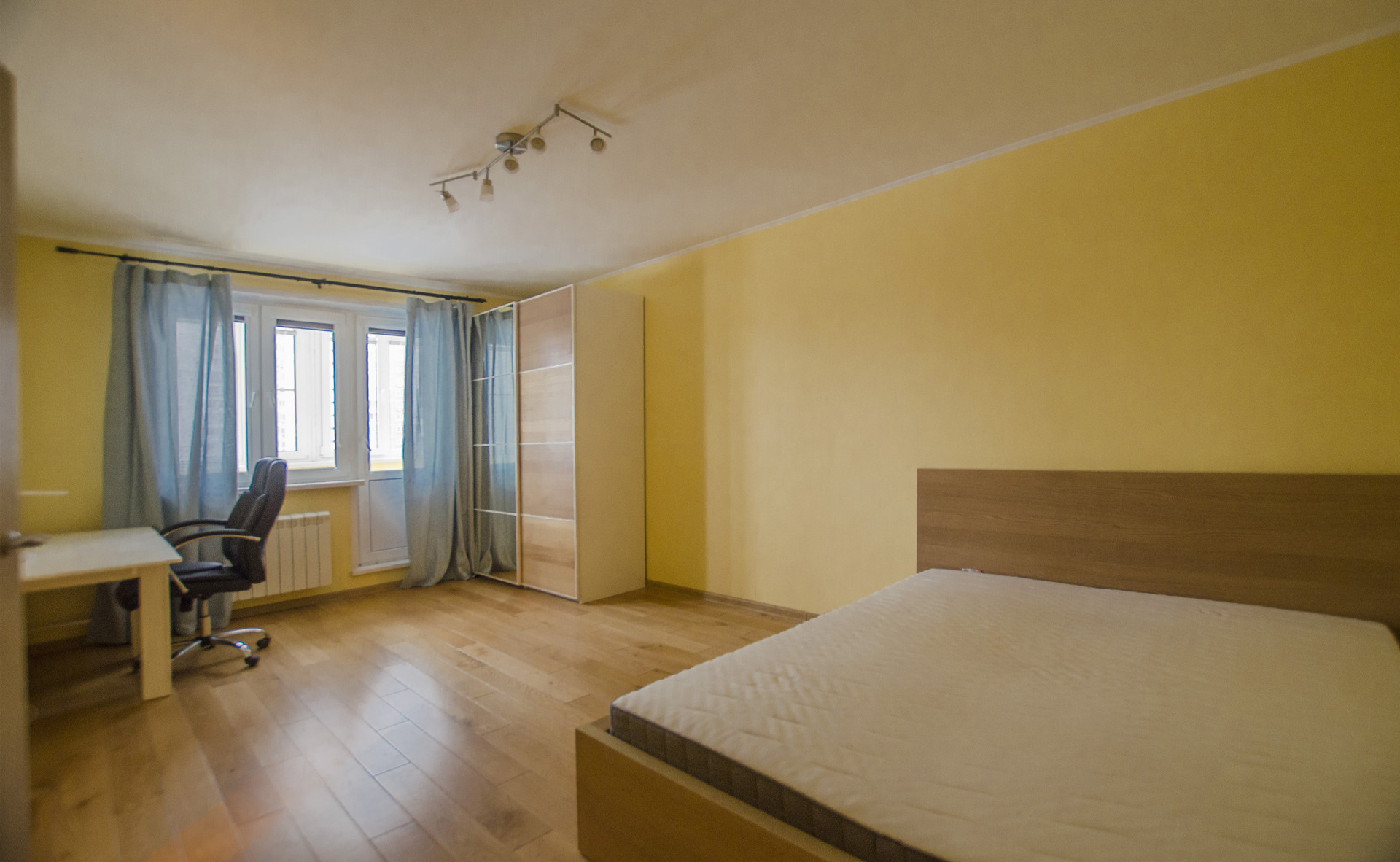 Просторная комната с выходом на застекленный балкон, полностью меблирована: имеются широкая двуспальная кровать, практичные системы хранения, включая шкаф с зеркалами. Ламинат, стеклопакет.
