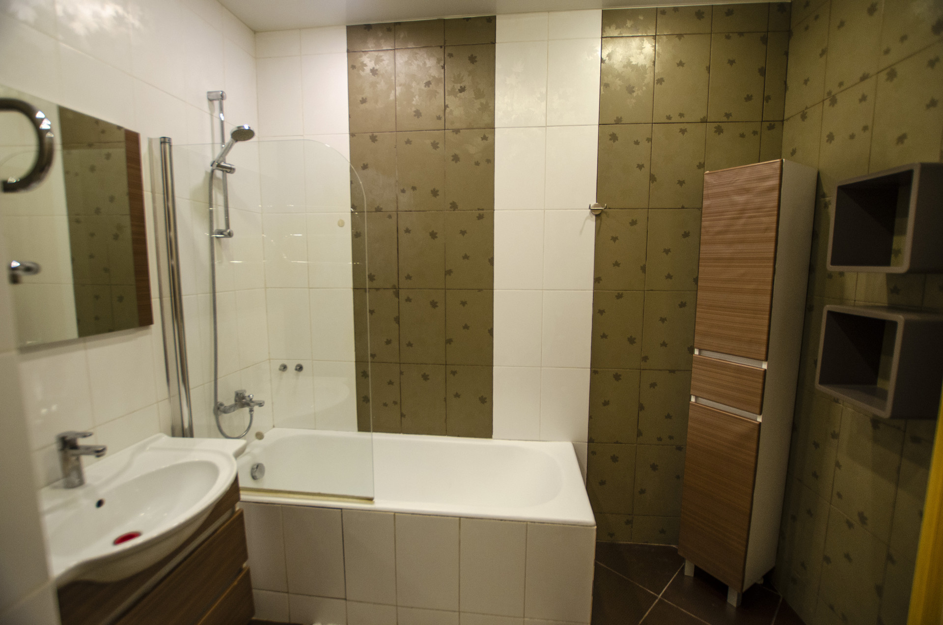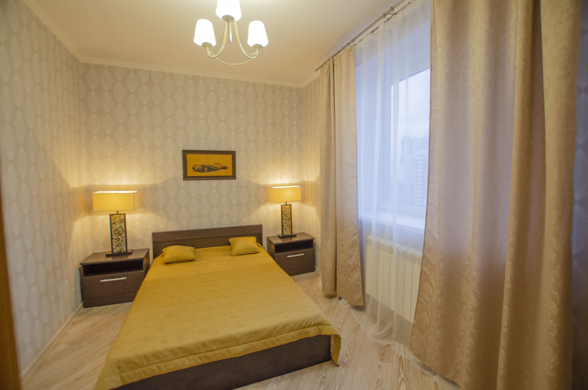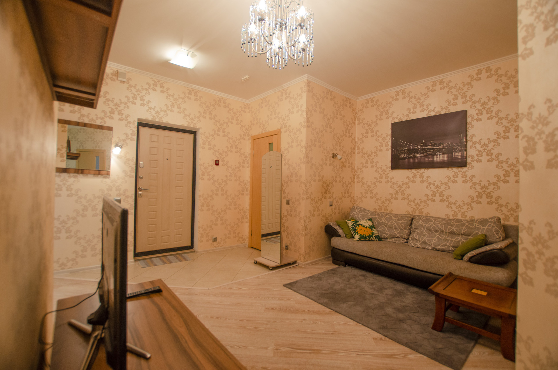 Комнаты полностью меблированы: имеются мягкий раскладной диван, двуспальная кровать, практичные системы хранения, включая шкаф, ЖК телевизор. Стеклопакет, ламинат и светлые тона обоев.