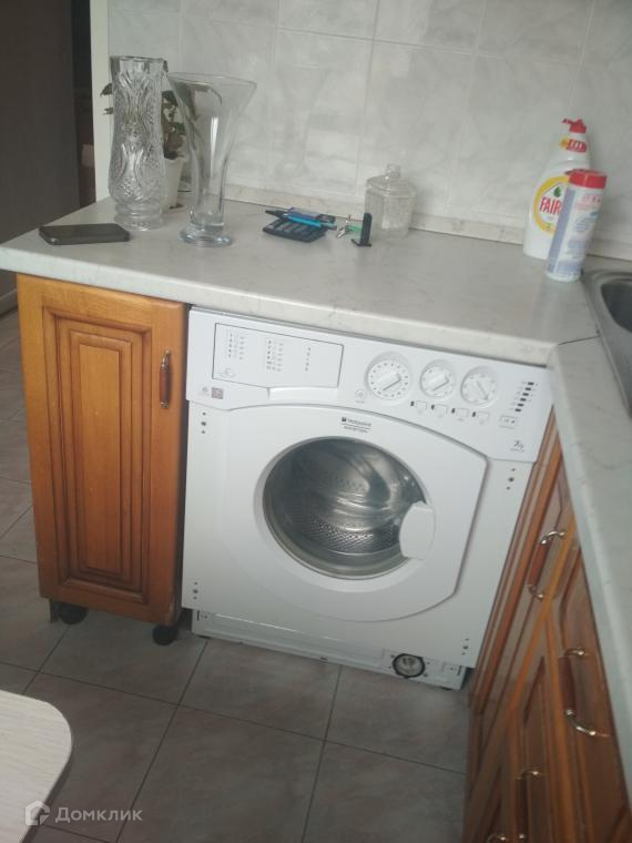 В квартире есть минимальный набор мебели и техники: двуспальная кровать, шкаф, кухонный гарнитур, обеденный стол, кухонный уголок, стиральная машина, холодильник, плита.