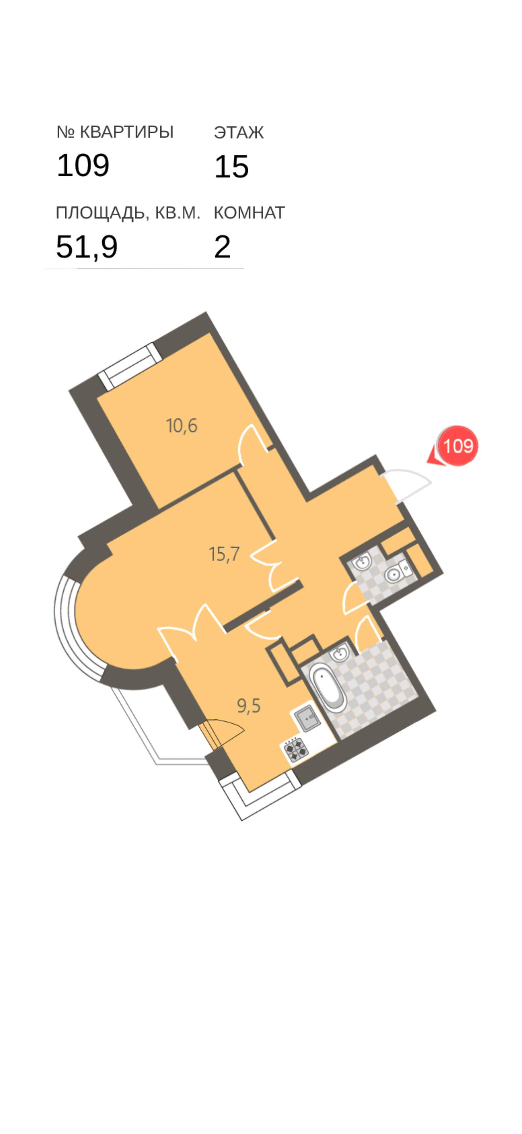 Сдаётся в первый раз (никто не жил), на длительный срок. 2-комн. квартира, 51,9 м² на 15 этаже (с балконом)