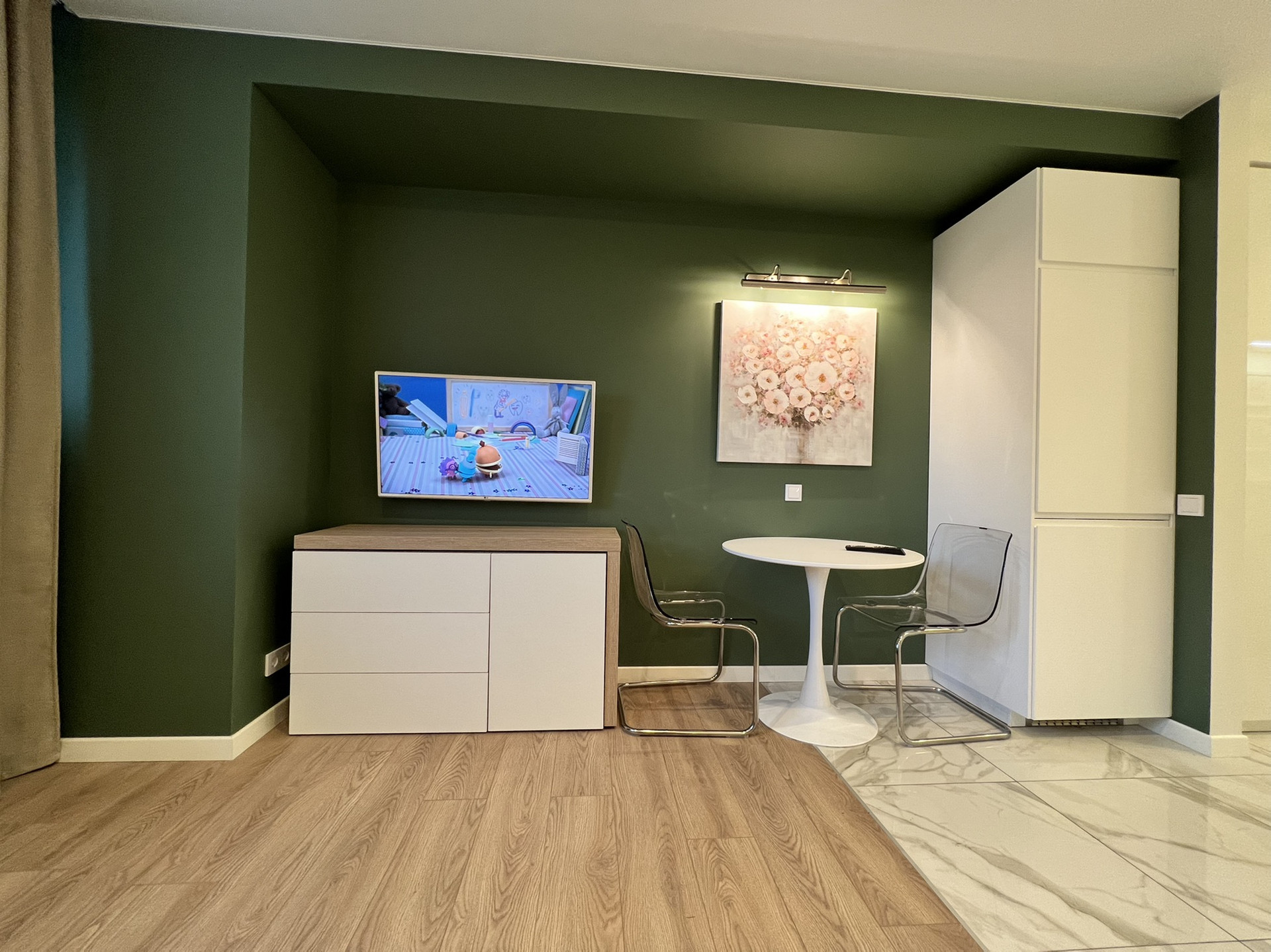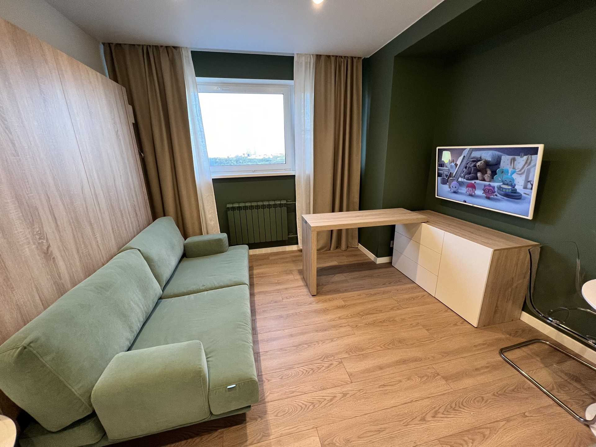 Под телевизором расположена тумба трансформер, которая легким движением превращается в удобное рабочее место.