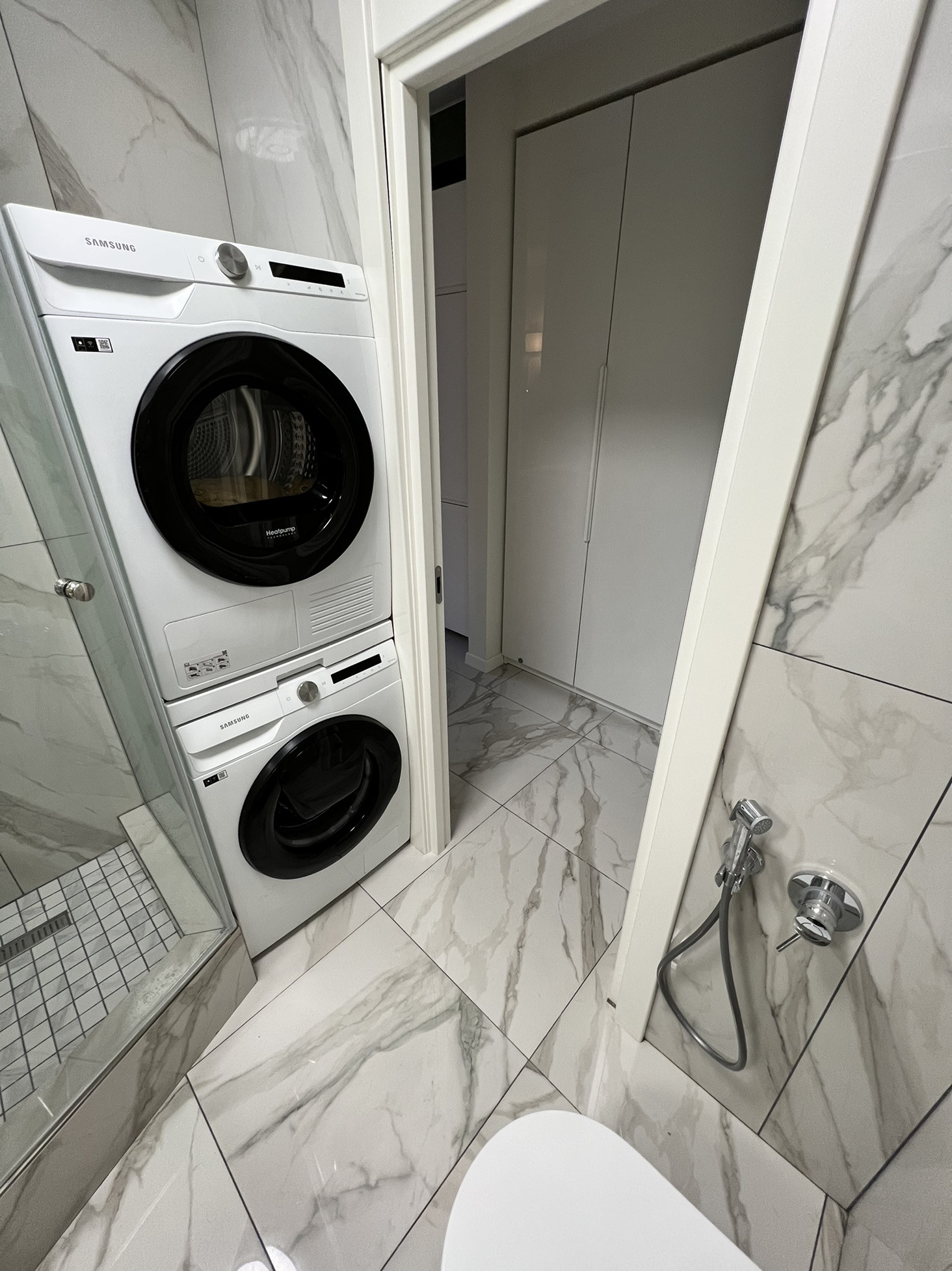 В ванной все делалось для того, что бы вместить полноразмерную стиральную и сушильную машину( вам не придётся сушить вещи на этих ужасных сушилках! Белье из сушильной машины можно сразу убирать в шкаф или надевать!)