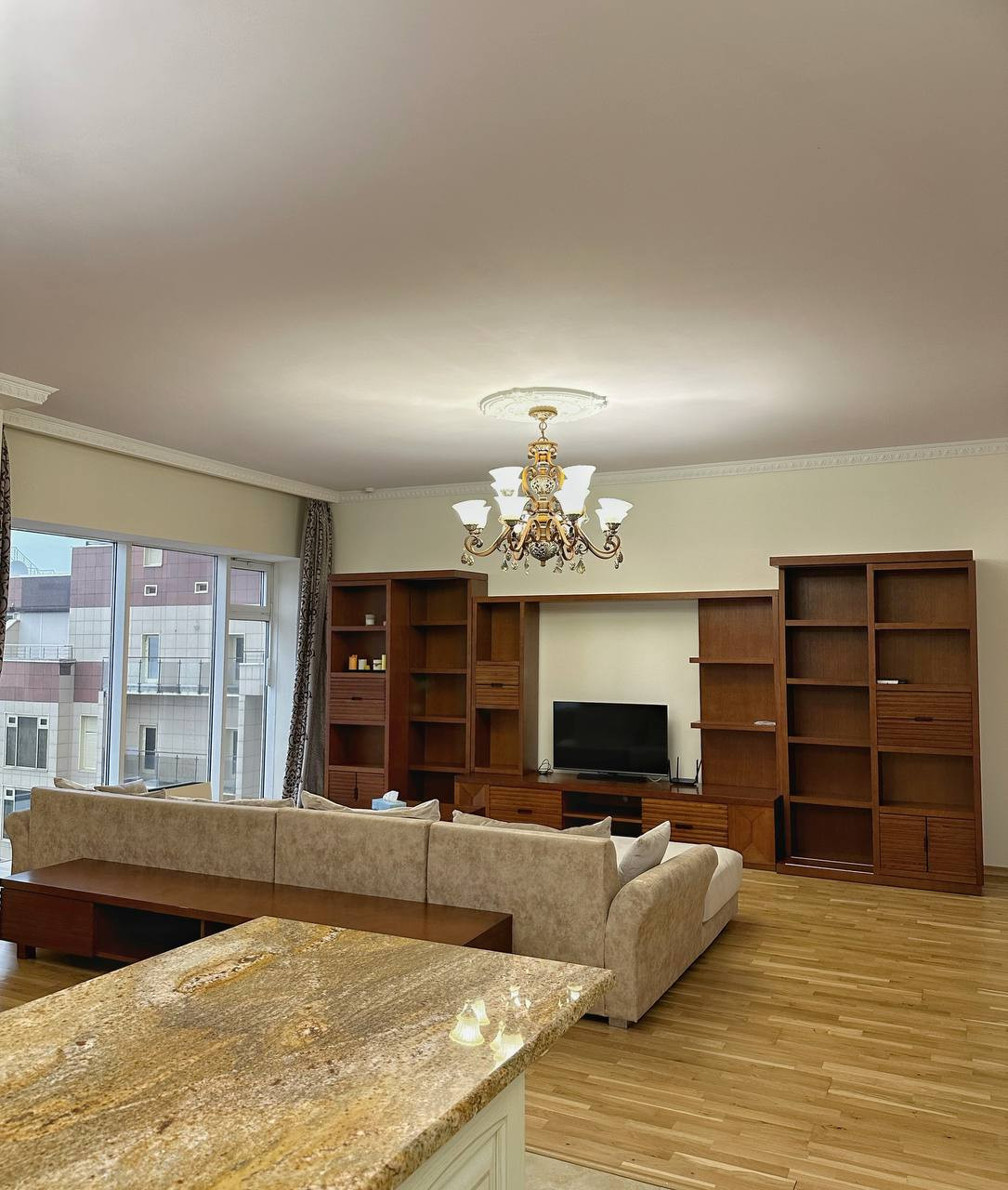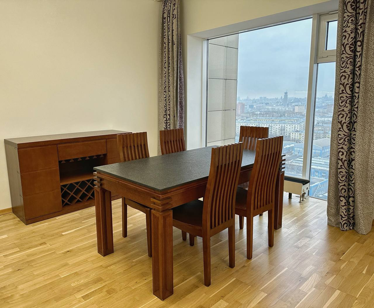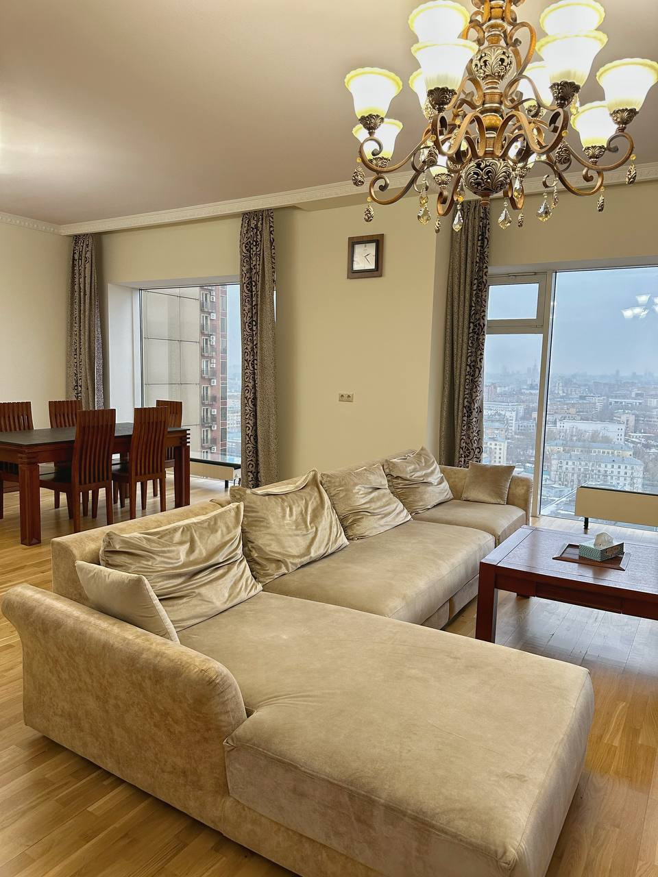 Панорамные окна смотрят в центр. Квартира полностью меблирована.