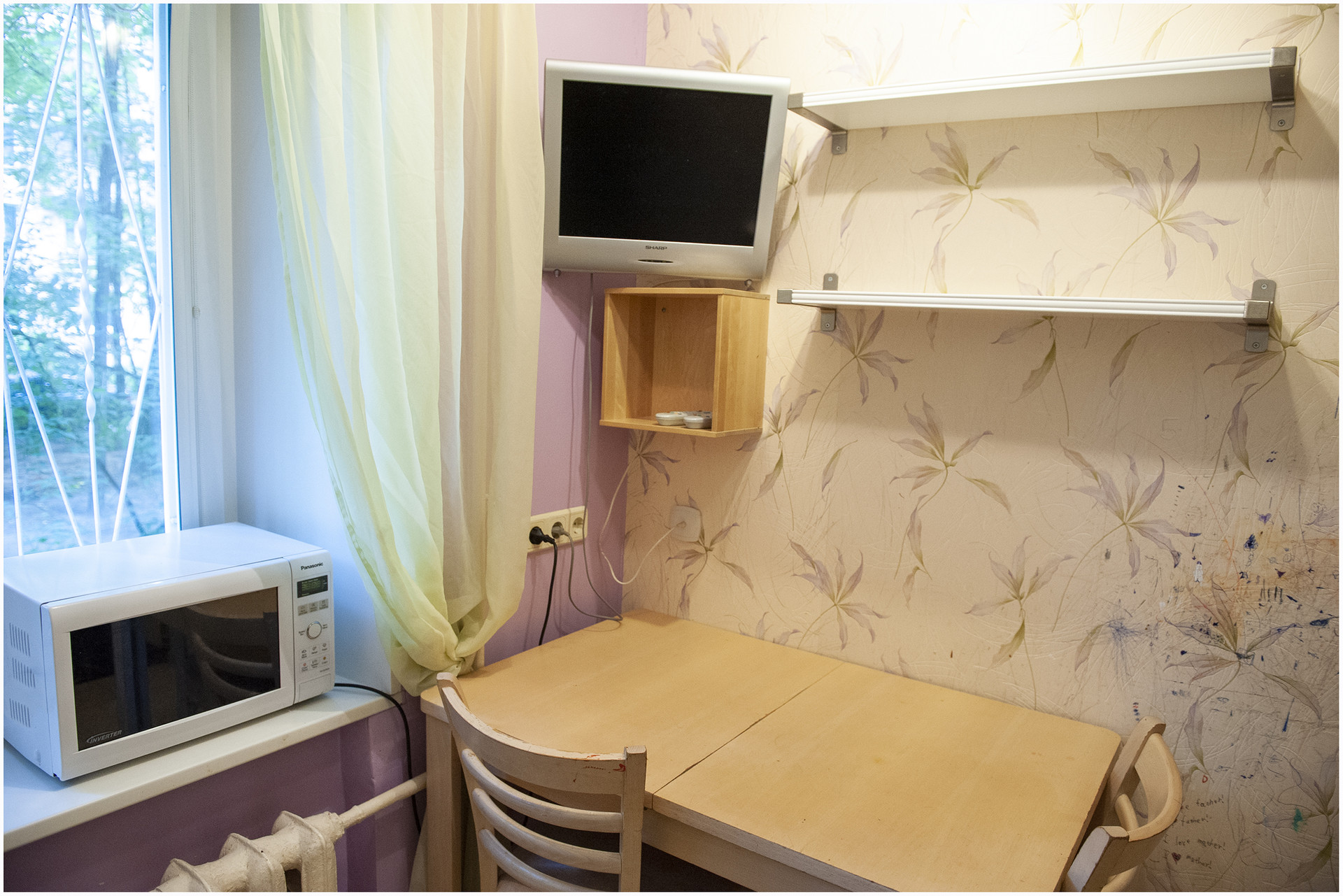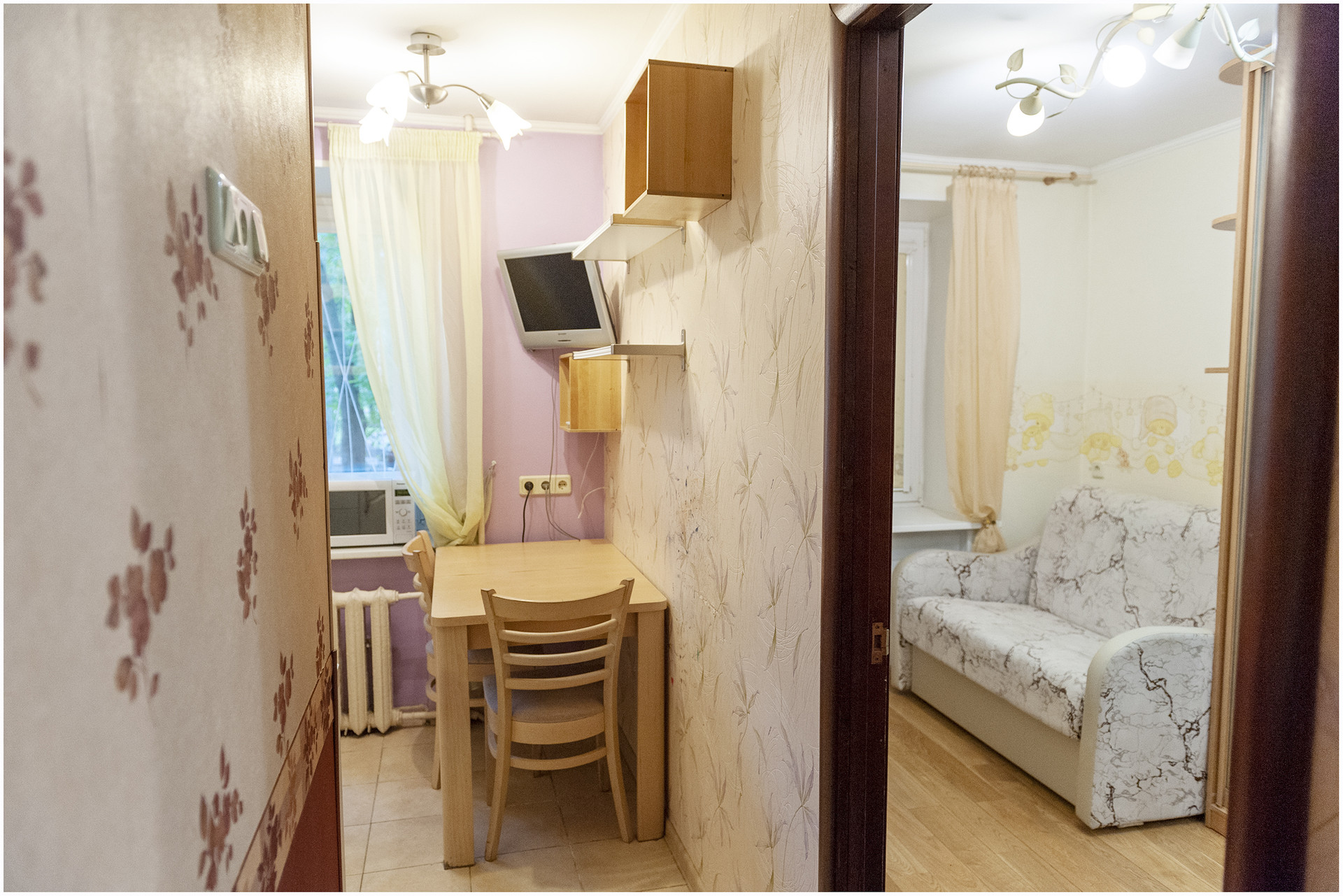 Высокий первый этаж, окна выходят в тихий палисадник, на окна установлены решетки. Двухкомнатная квартира 34,4 кв.м (гостинная 17,6 кв.м, комната 9 кв.м), оборудована всем необходимым для комфортного проживания. В маленькой комнате раскладной диван, в гостиной диван раскладывается на полноценное 2-х спальное место.