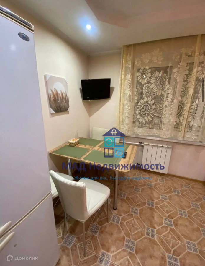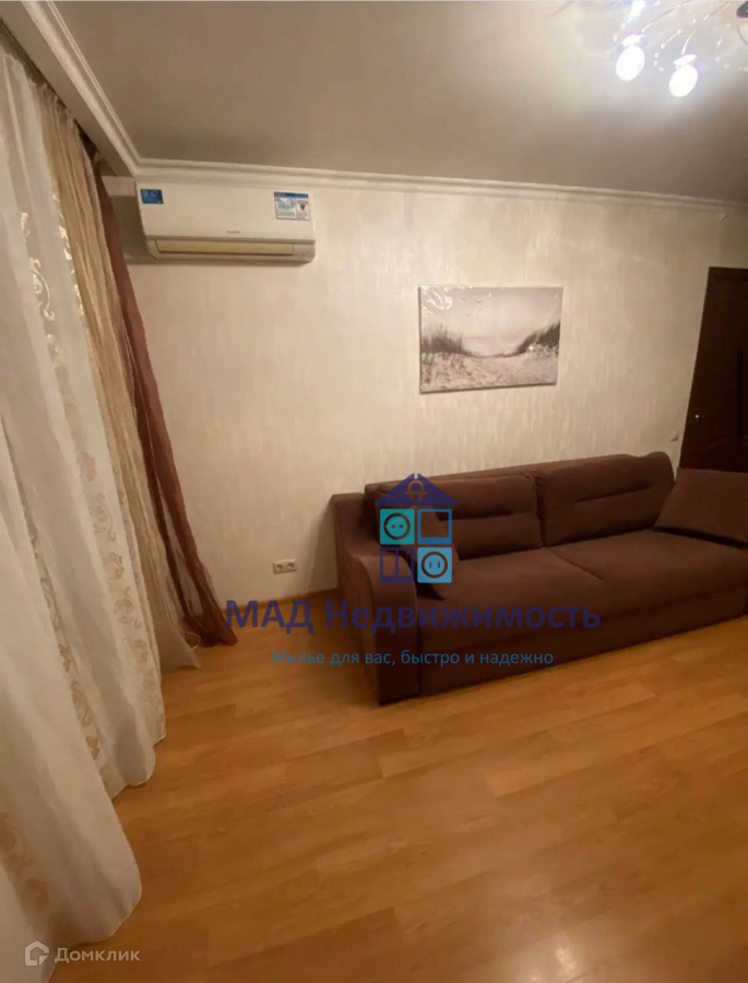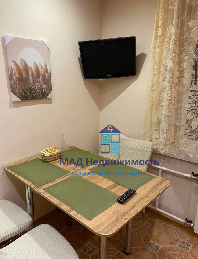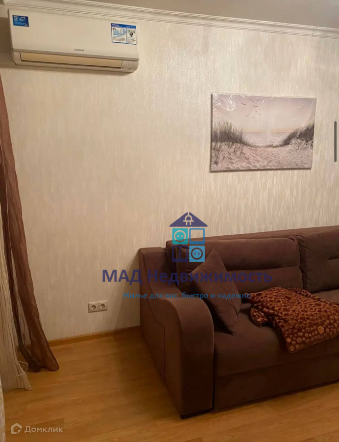 В комнате: угловой шкаф под потолок, комод, диван, кондиционер, шторы, плед, аксессуары: вазы, картина, светильники и декорированное дерево, утюг. На кухне:окно с замком для защиты детей, кухонный гарнитур - кухонный двор, раковина и смеситель blanco, варочная поверхность газовая