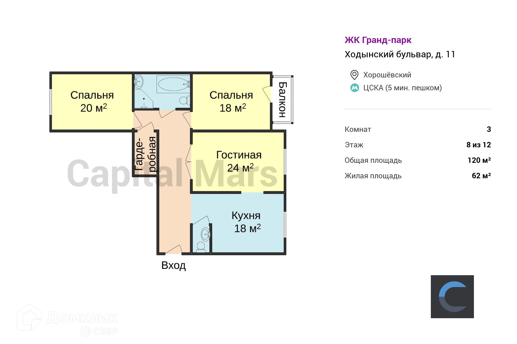 Предлагается 3-комнатная квартира общей площадью 120 м² в ЖК "Гранд-парк", недалеко от станции метро "ЦСКА". Высокие потолки увеличивают пространство, наполняя его светом. Для комфортного проживания в наличии имеется вся необходимая мебель, а также нагреватель воды и система теплого пола. Кухонный гарнитур оснащен посудомоечной машиной, духовой печью. Для удобства организована гардеробная комната. Из дополнительных преимуществ - наличие балкона. Окна обращены во двор, обеспечивая тишину.