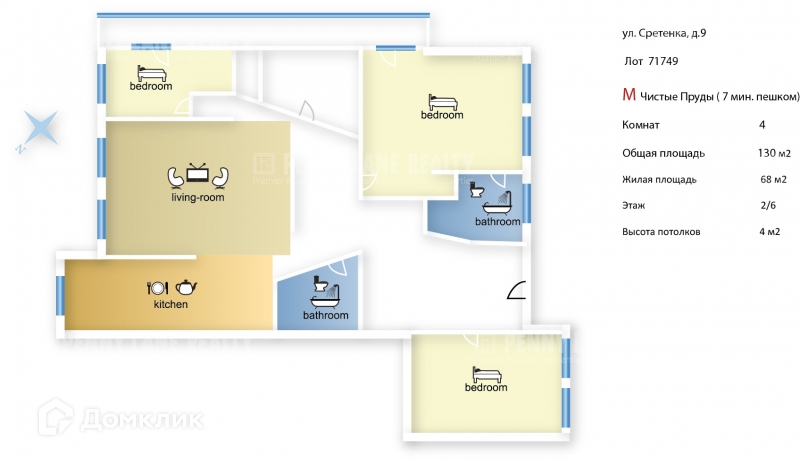 4-комнатная квартира, 130 м2, в аренду на длительный срок в Москве, улица Сретенка, 9