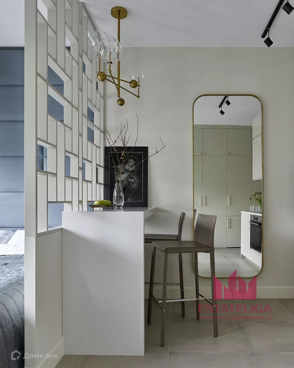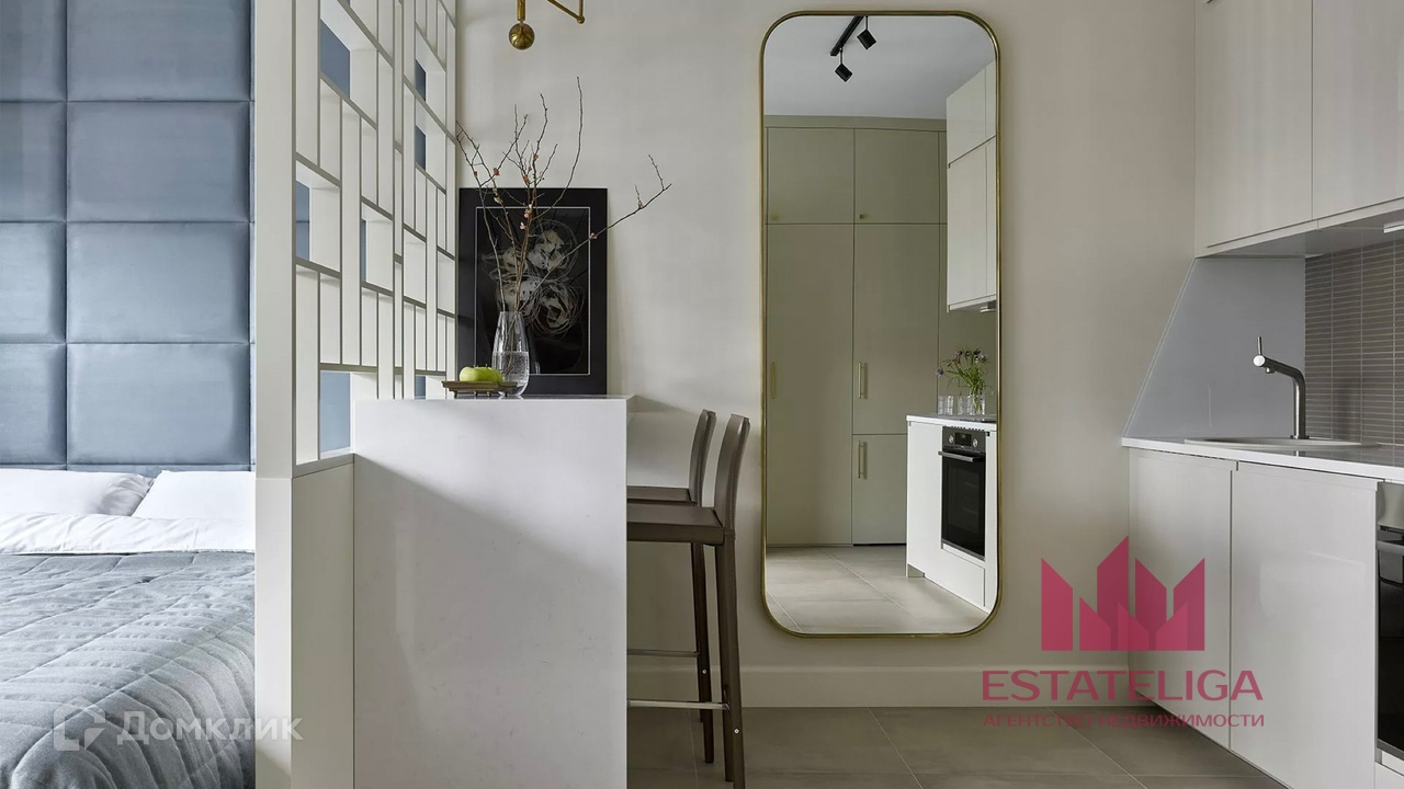 Функциональная планировка: просторная и светлая кухня с барной стойкой, которая играет роль обеденного и письменного стола, зона спальни с полноценной двуспальной кроватью, совмещенный санузел, просторный холл с масштабным шкафом семь метров в длину и три в высоту. В шкафу разместили не только гардероб, но и встроили полноразмерный холодильник и оборудовали нишу для панели ТВ. Дополнительные места хранения организовали в верхнем ряде кухонных шкафов и в основании кровати с подъемным механизмом.