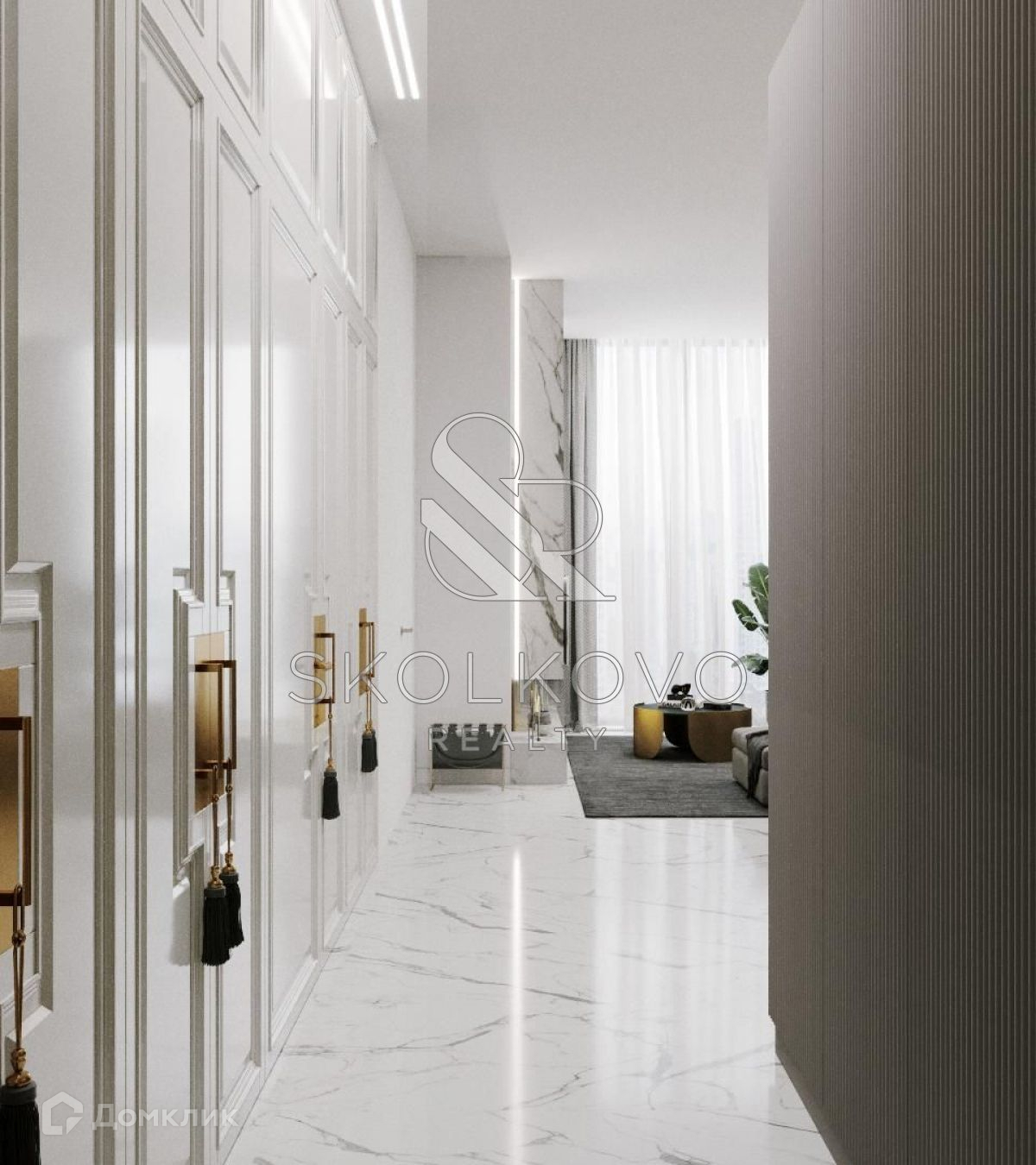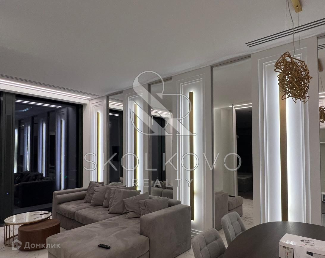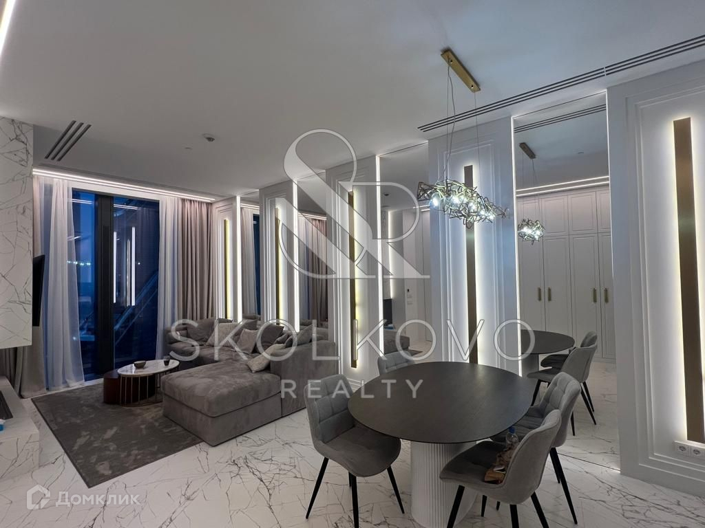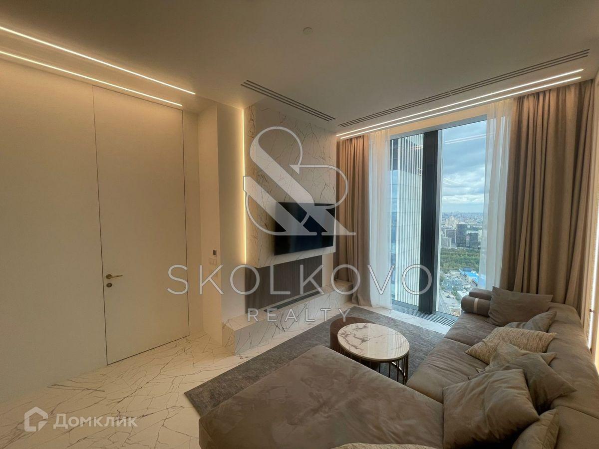 Квартира расположена на 45 этаже 78-этажного дома. Из окон открывается панорамный вид на Москву-реку.