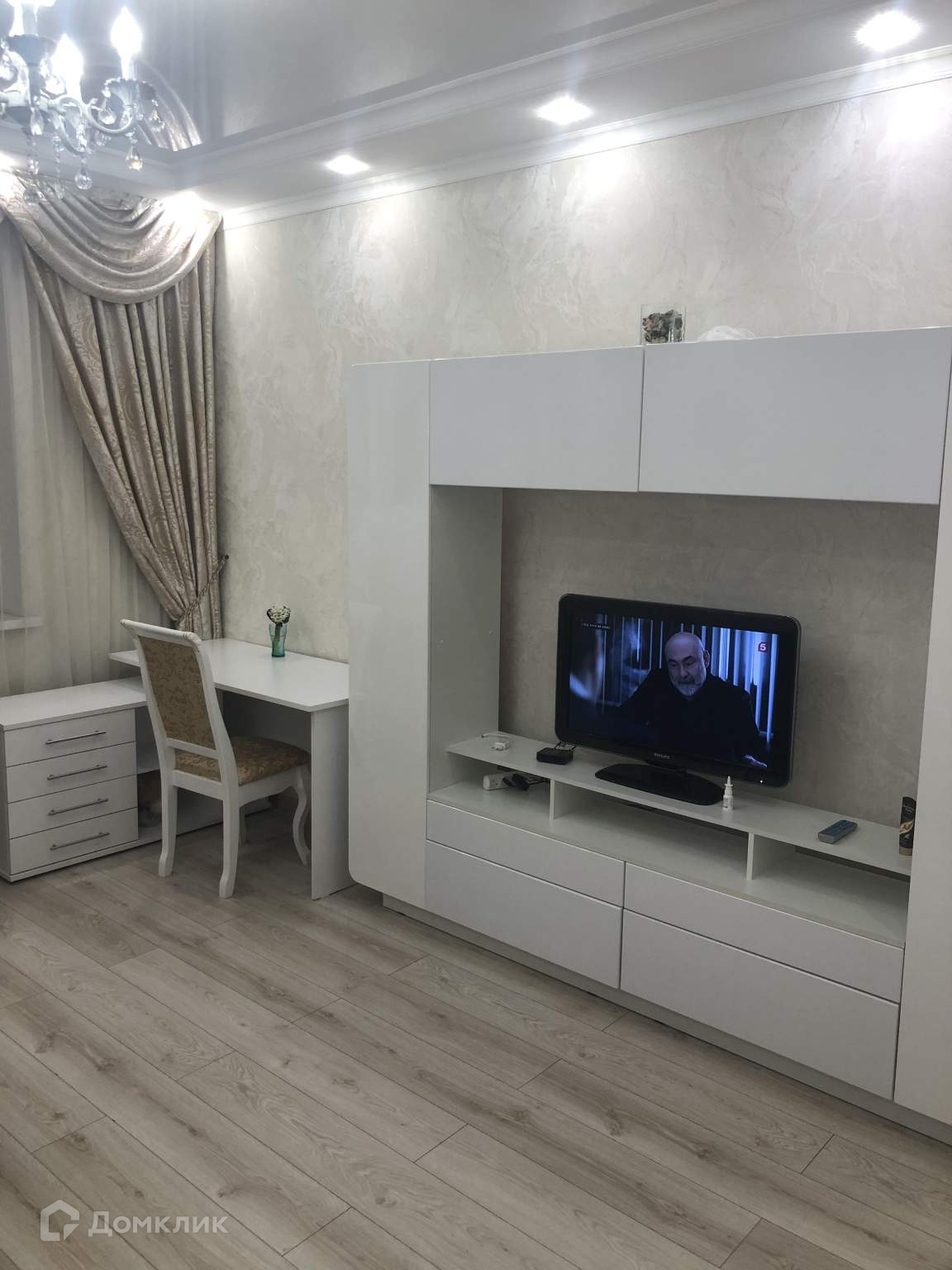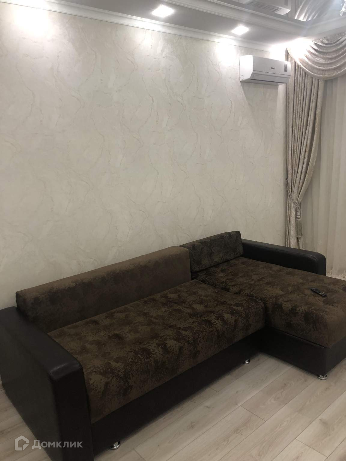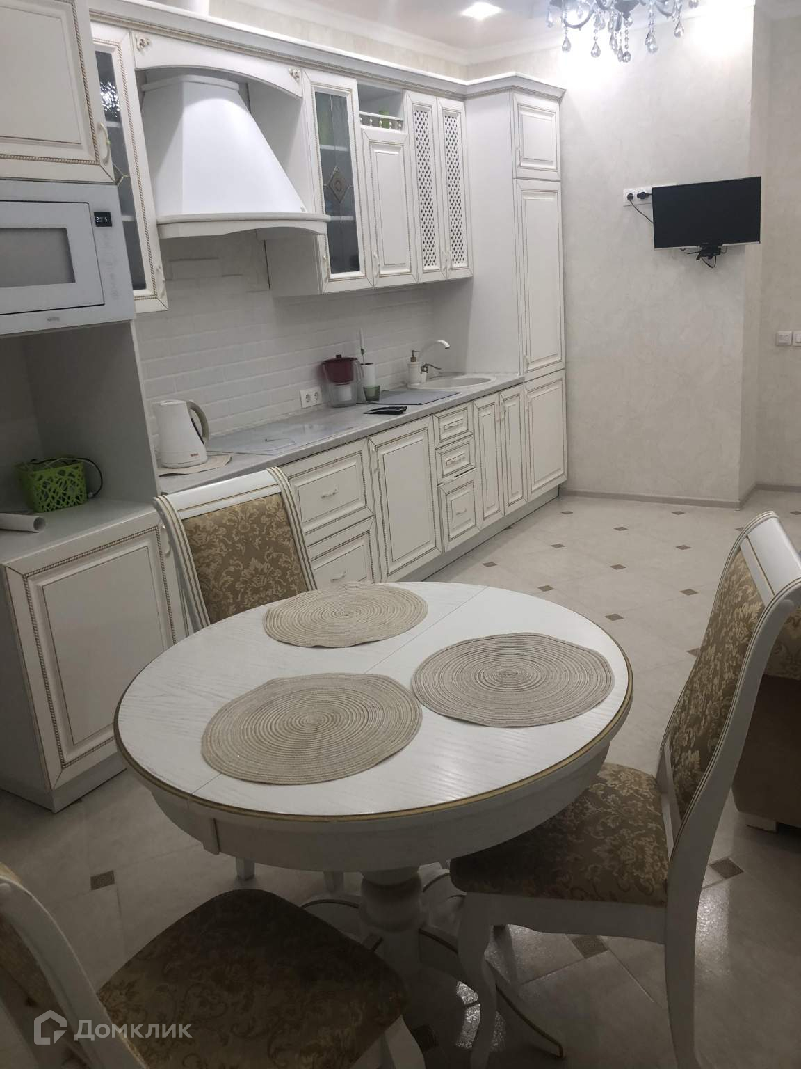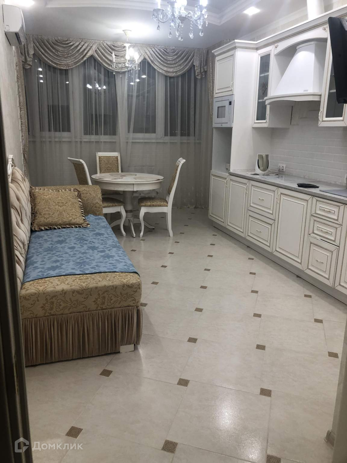 Жилая площадь 24 кв.м, кухня 12 кв.м, в квартире четыре спальных места.