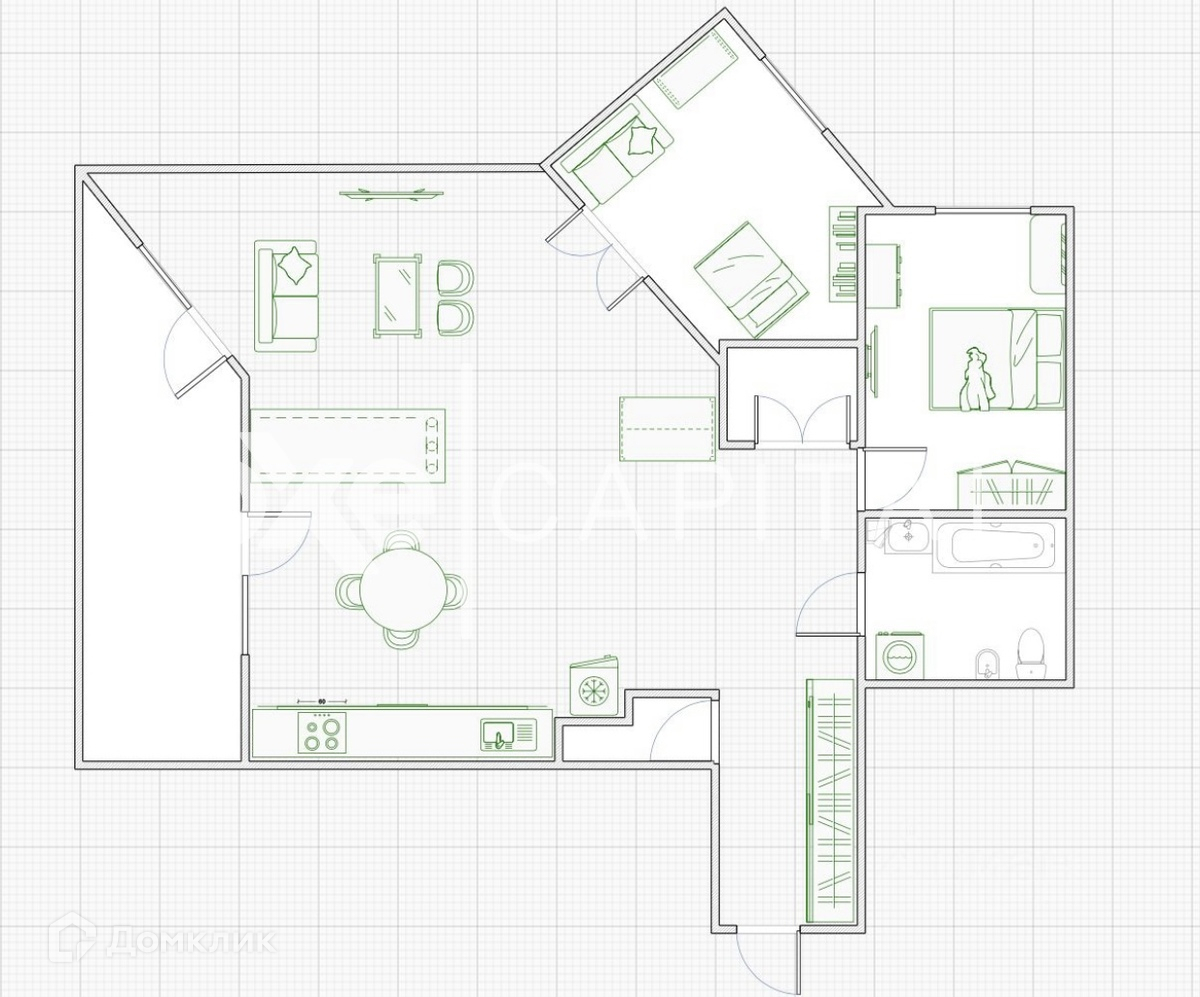 Большая кухня, объединенная с гостиной и две изолированные спальни.