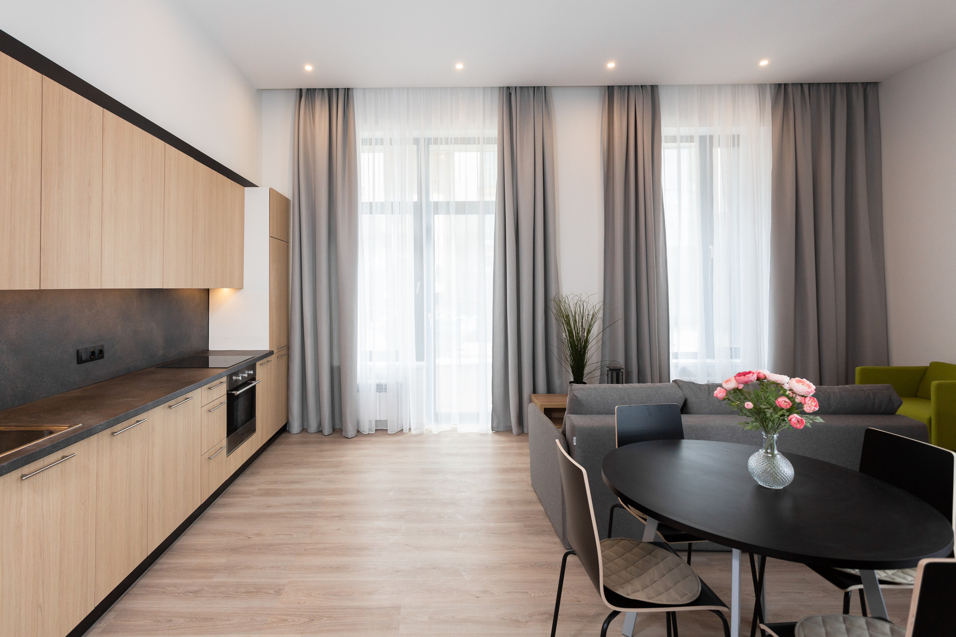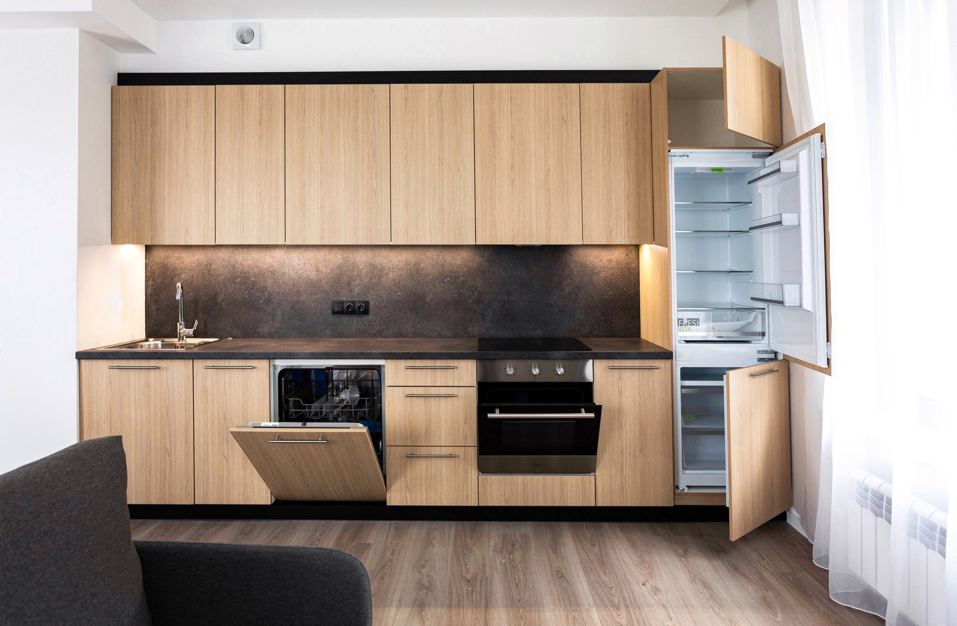 Апартамент меблирован стильной современной мебелью и оснащен всей необходимой бытовой техникой: встроенный холодильник, посудомоечная машина, духовой шкаф, варочная панель, стиральная машина, телевизор.