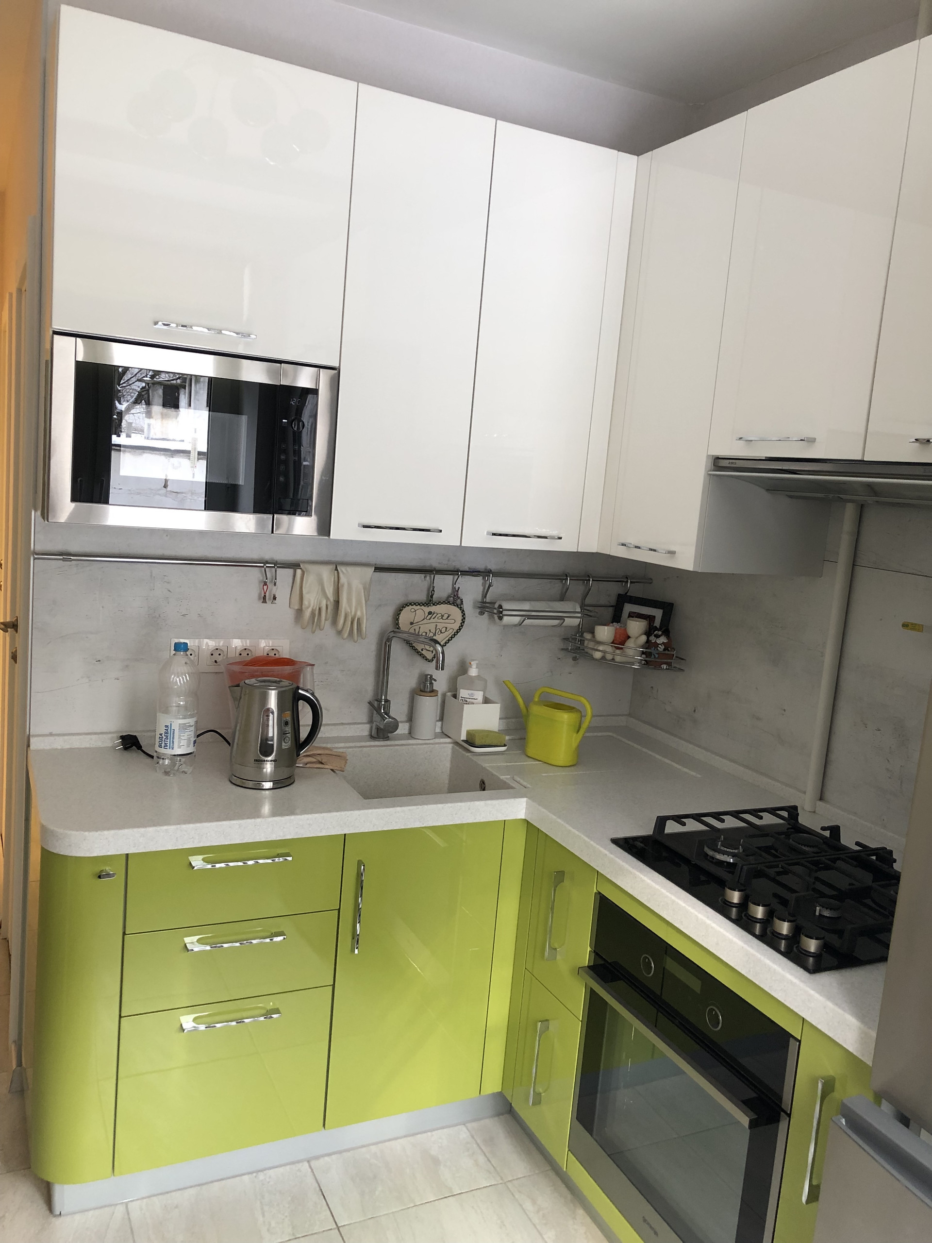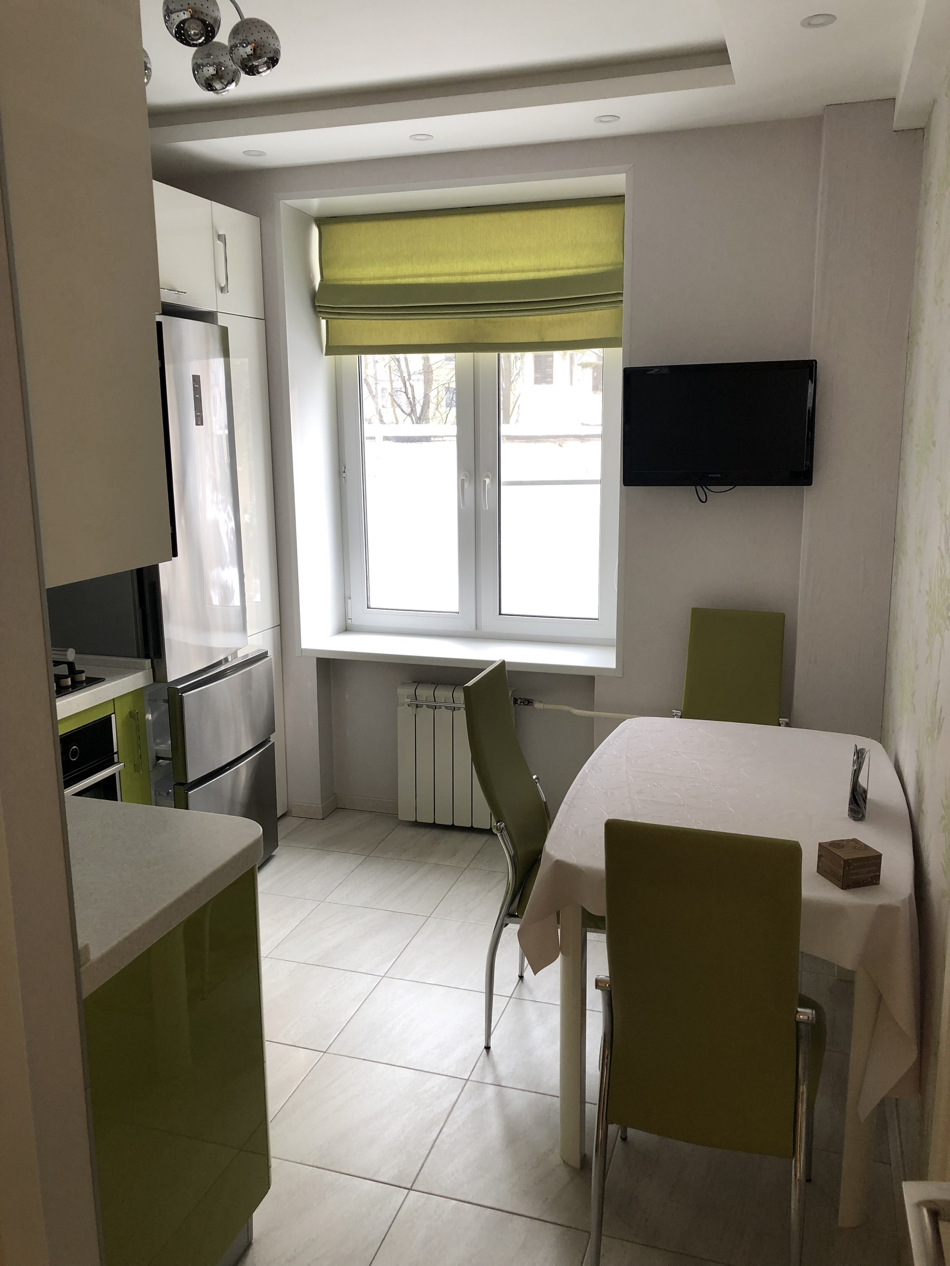 Современная кухня со столешницей из искусственного камня, встроенными газовой варочной панелью, электрическим духовым шкафом и микроволновкой. Большой холодильник Haier. Настенный маленький телевизор.