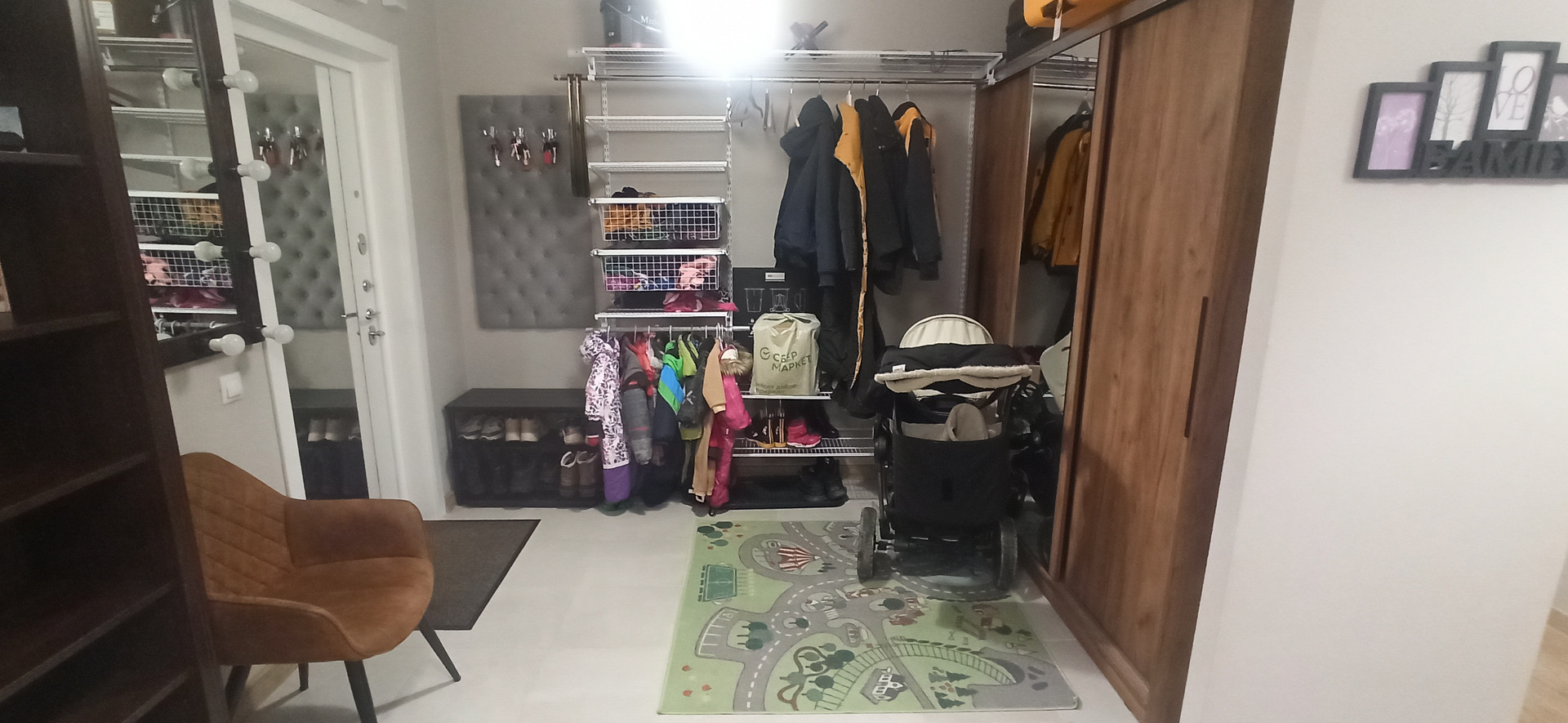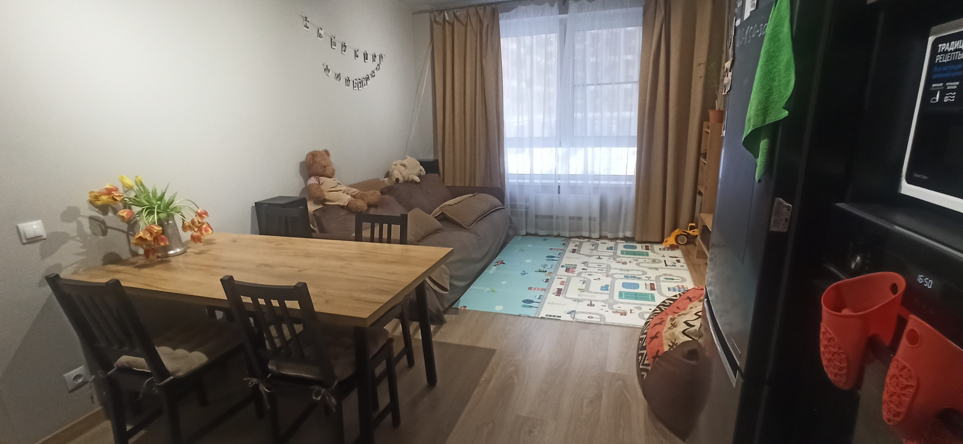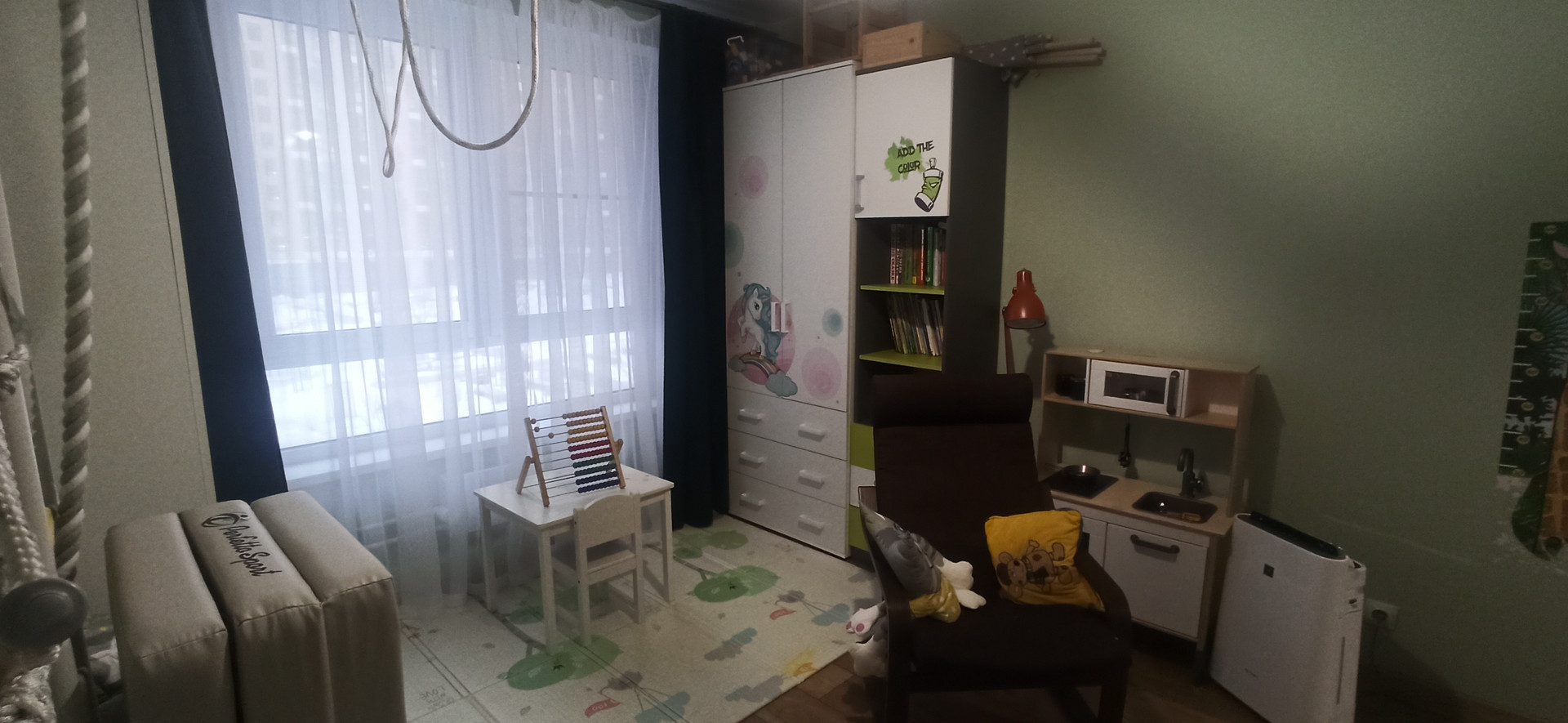 Квартира оборудована кухней с большой рабочей поверхностью, варочной панелью, духовым шкафом, посудомойкой, холодильником, микроволновкой, измельчителем и фильтром для воды с осмосом. Во всех комнатах установлены кондиционеры, в спальне и детской бризеры(приточная вентиляция, означает, что вы можете никогда не открывать окна, не слушать шум с улицы и не впускать пыль и пыльцу в дом, что особенно важно, если в семье есть аллергик).