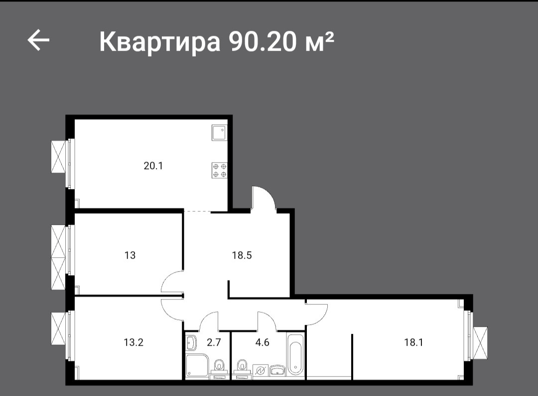С апреля сдается 3-комнатная квартира в новостройке от ПИК с просторной кухней. 90.3м2 общая площадь, кухня 20м2, большая прихожая, 2 санузла и 3 изолированные комнаты (13, 13 и 18м2).