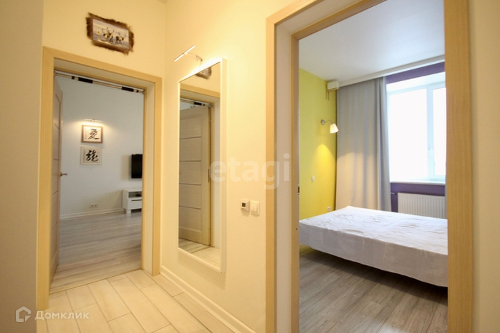 - Большая двуспальная кровать, телевизор, раскладной диван в зале, шторы блэкаут, не пропускающие солнечные лучи, также установлен теплый пол, два кондиционера в каждой комнате;