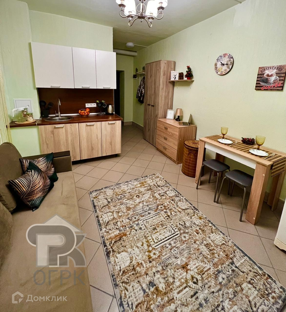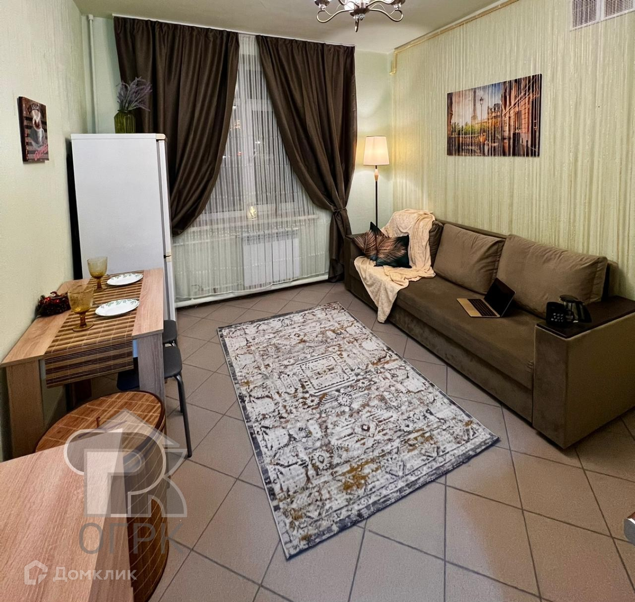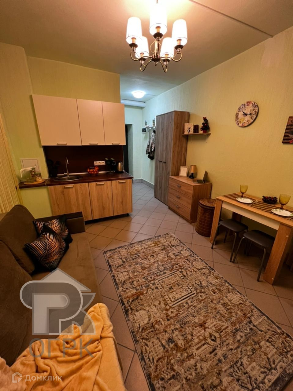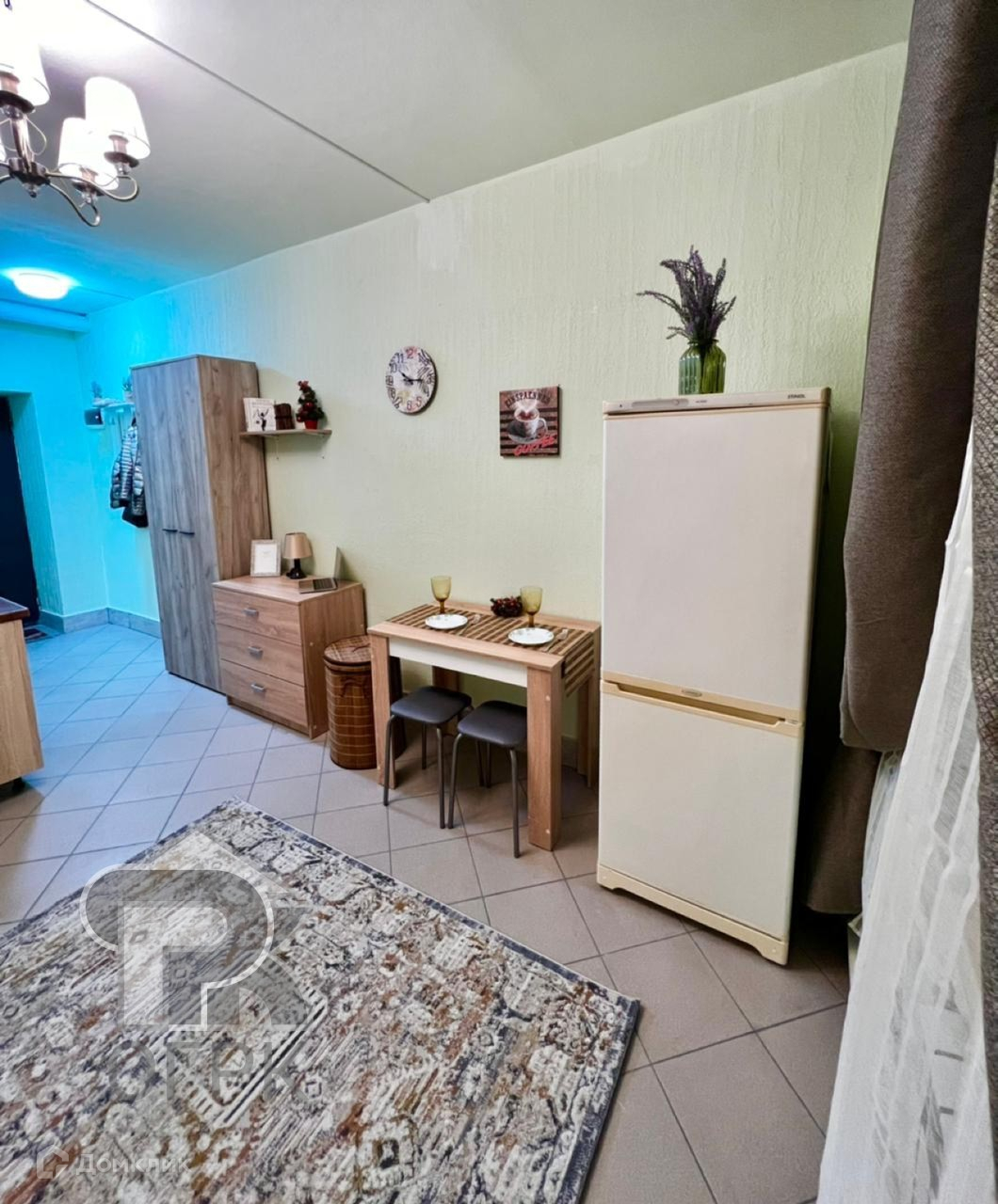 В студии есть: стиральная машина, холодильник, диван, стол, кухонный гарнитур.