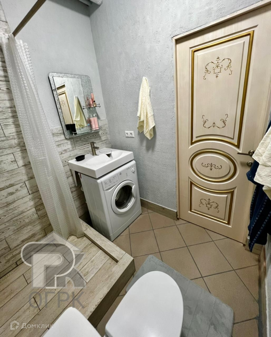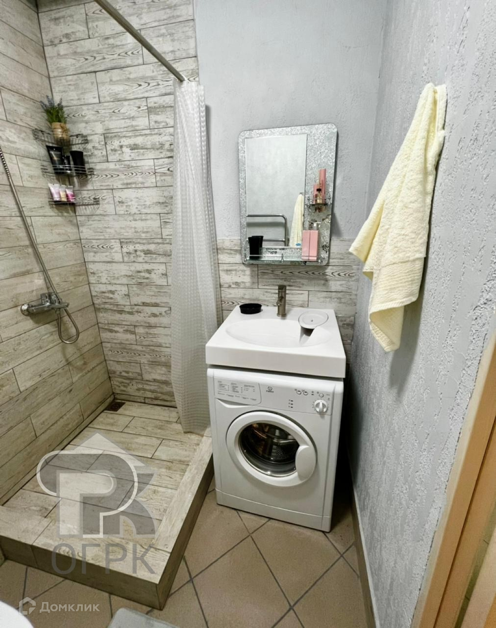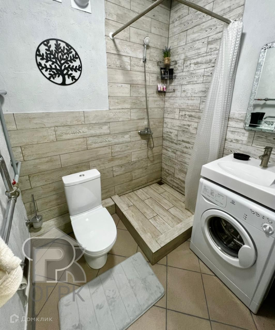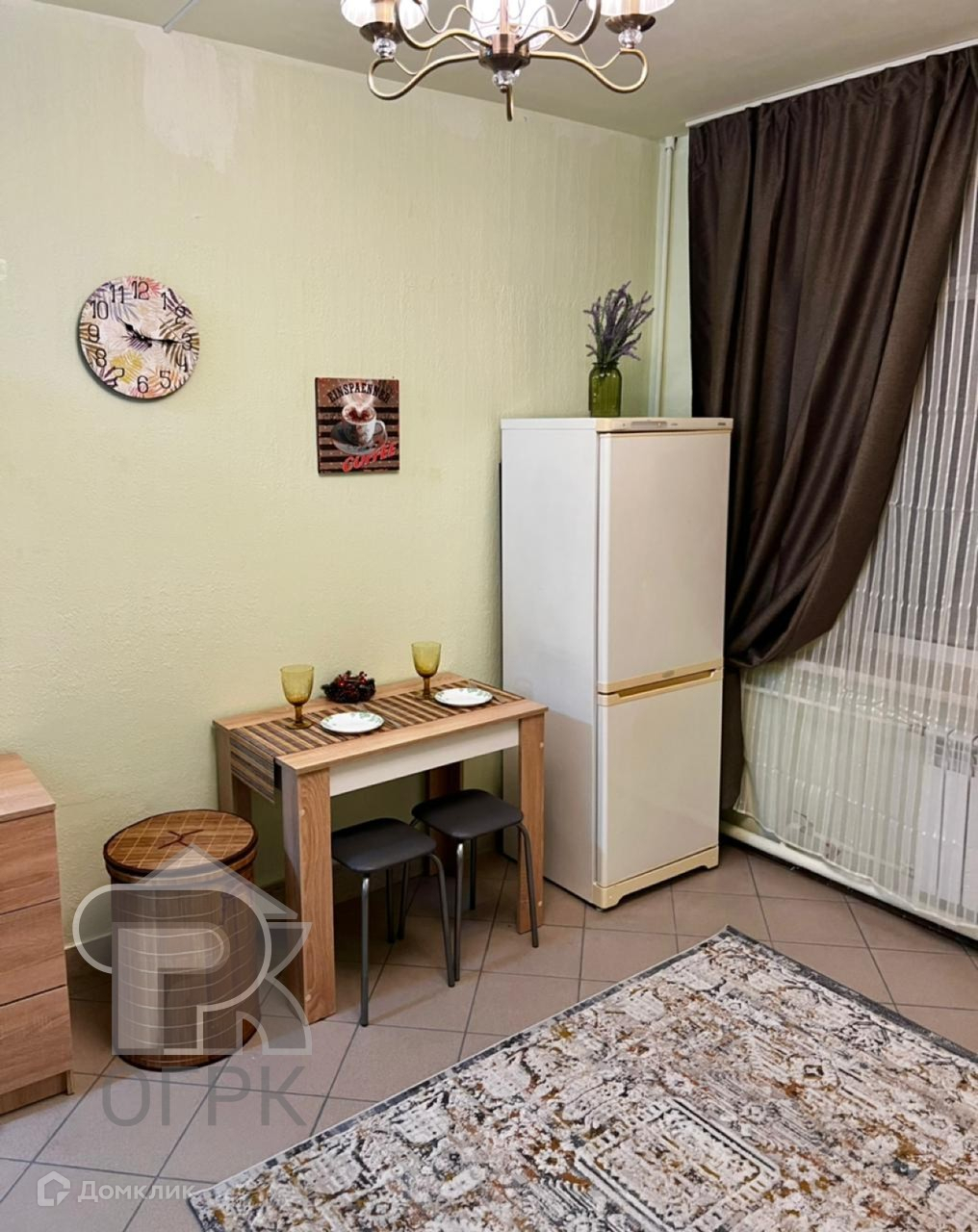 В студии есть: стиральная машина, холодильник, диван, стол, кухонный гарнитур.