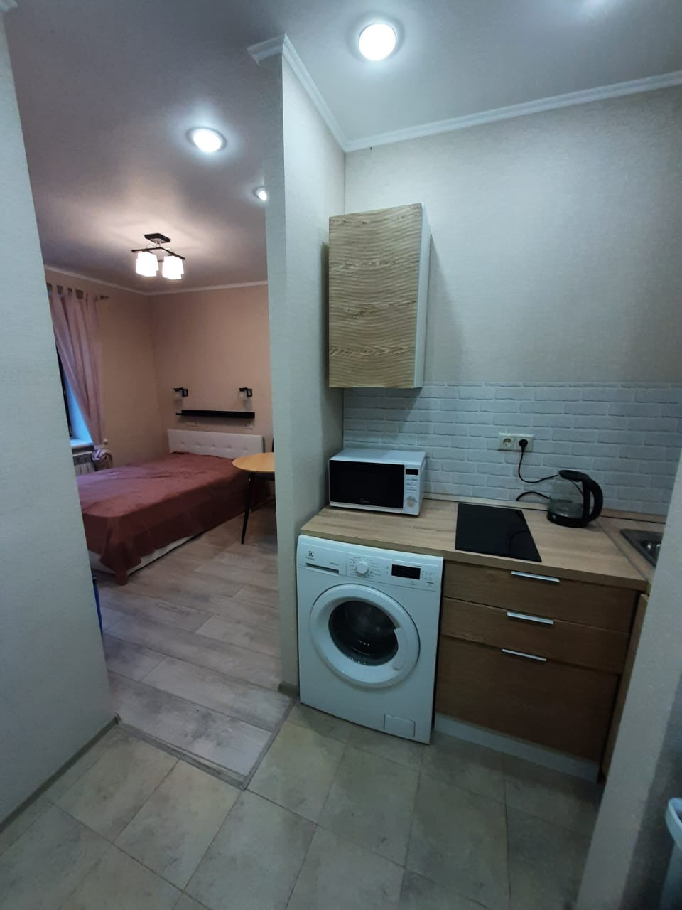 Студия полностью меблирована и оборудованна всей необходимой бытовой техникой: стиральная машина, свч-печь, холодильник.