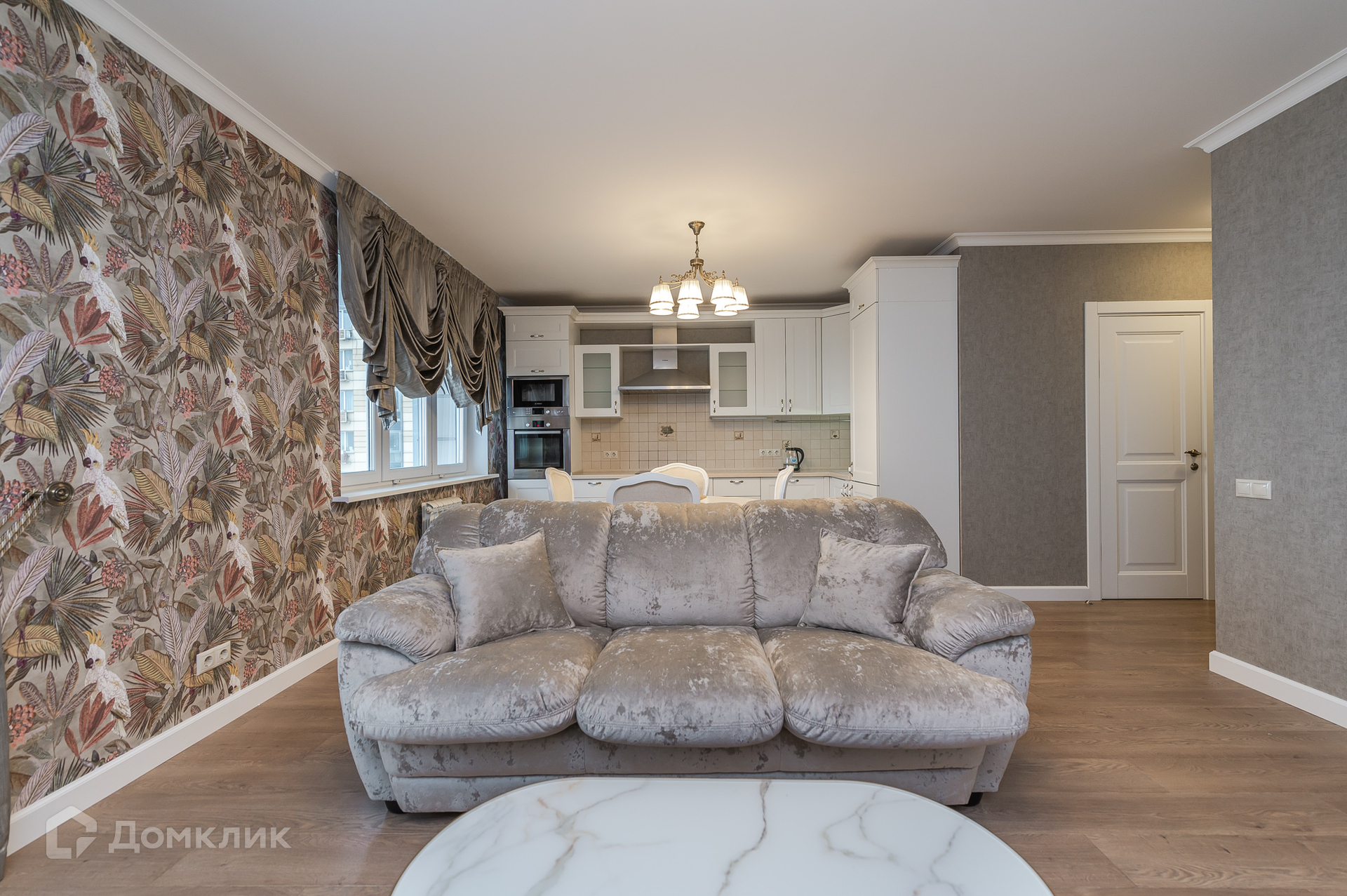 Большая просторная гостиная совмещенная с кухней, прекрасная мягкая мебель в диванной зоне с новым телевизором с хорошим быстродействующим процессором, отлично зонированое пространство - просторная столовая группа. Большая  функциональная кухня - вся бытовая техника представлена дорогим модельным рядом, есть фильтр для воды.