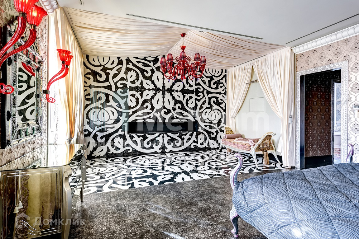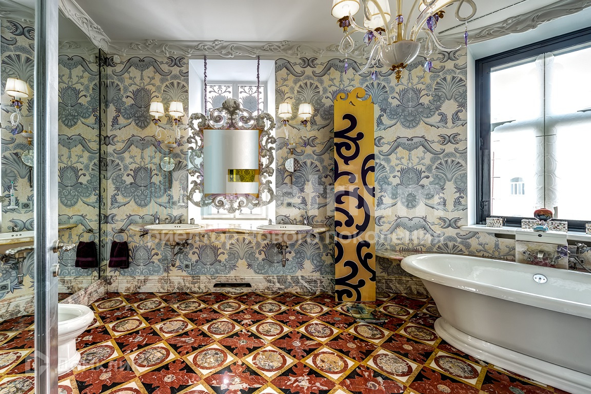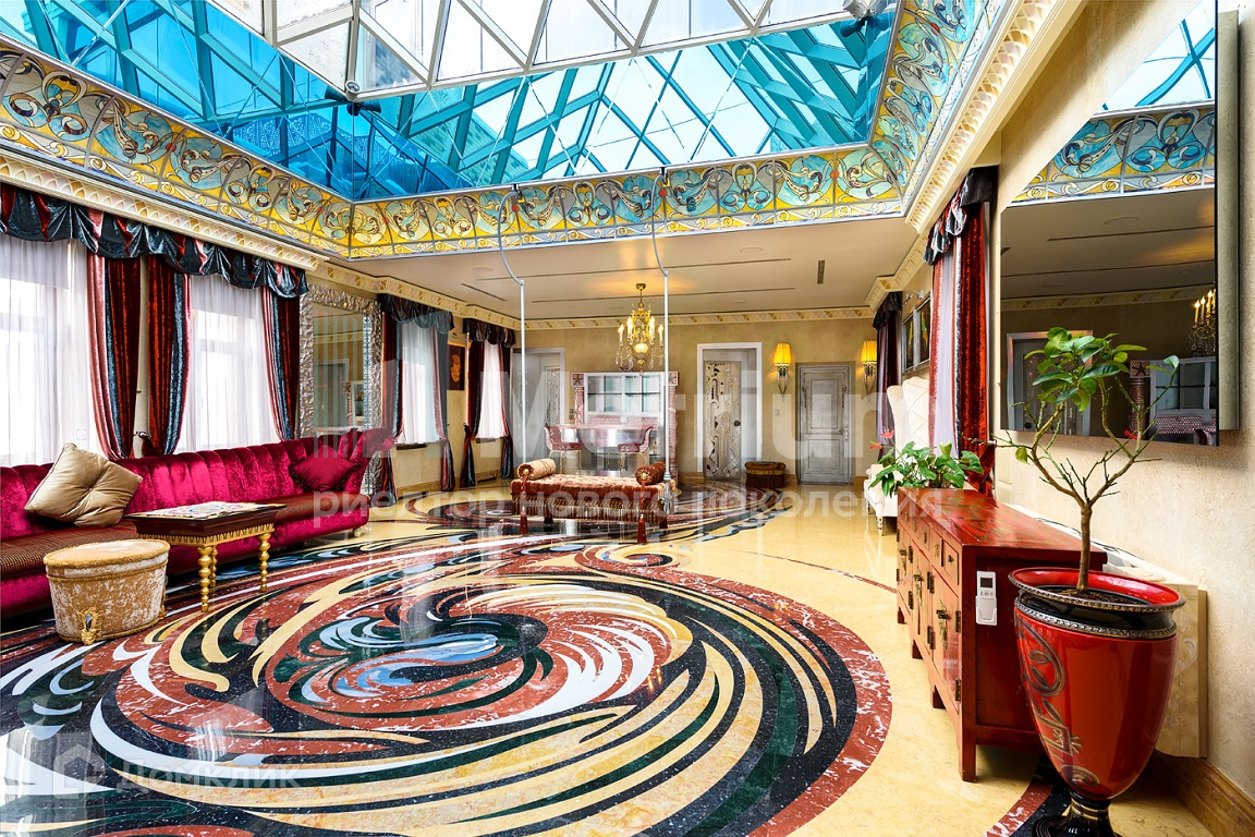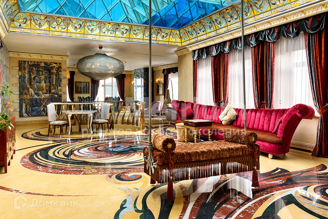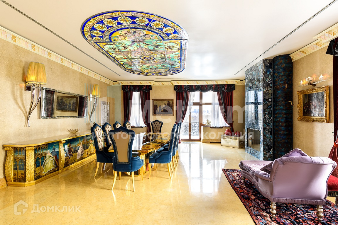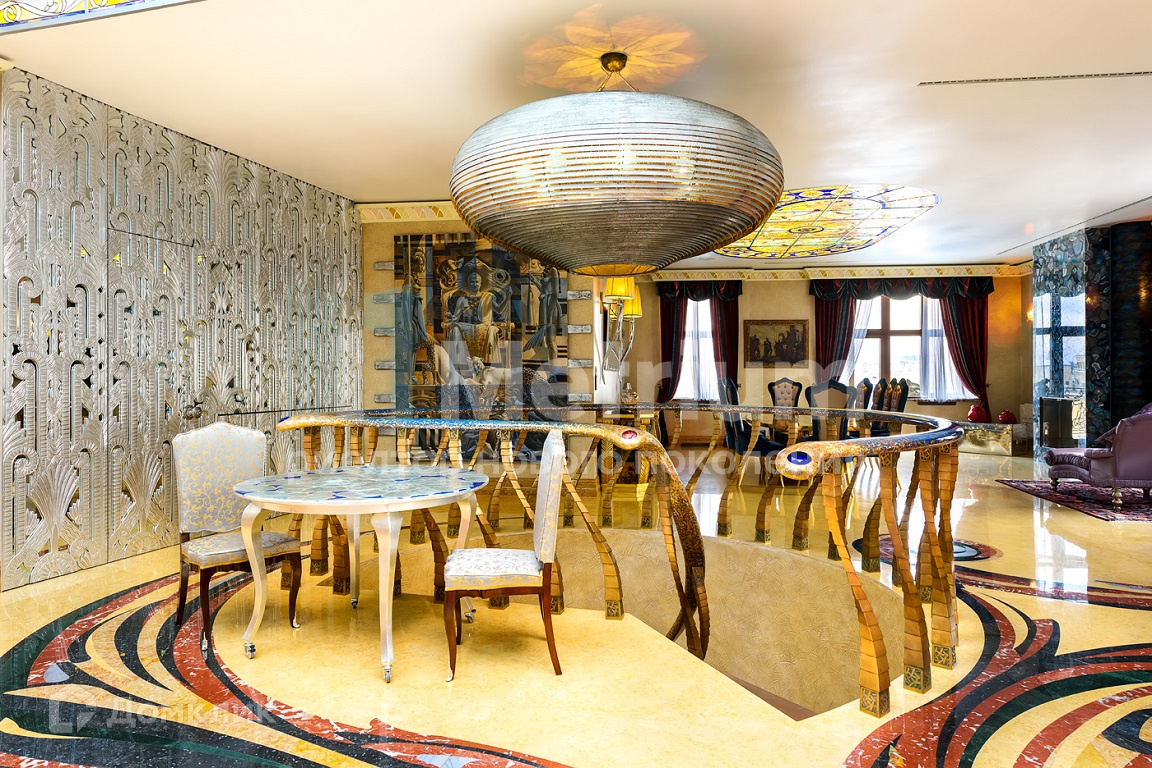Пентхаус выполнен в уникальном дизайне, сочетающем в себе стиль и комфорт, авторскую современную и антикварную мебель, предметы интерьера индивидуального исполнения. В отделке использованы только натуральные материалы из разных уголков мира: эксклюзивные сорта камня, дерева, кожи. На четвёртом этаже располагаются главная спальня с камином и ванной комнатой, душевая, гардеробная комната с отдельным помещением для туалетного столика, гостиная-кабинет с газовым камином, детская спальня и санузел. На пятом этаже - просторная гостиная с потолочными качелями и стеклянным куполом, бар, столовая с дровяным камином и выходом на балкон, кухня, комната для персонала и санузел. На шестом этаже - 3 спальни с отдельными санузлами, хамам, массажная, прачечная, открытая терраса с роскошными видами на исторический центр Москвы и Храм Христа Спасителя.