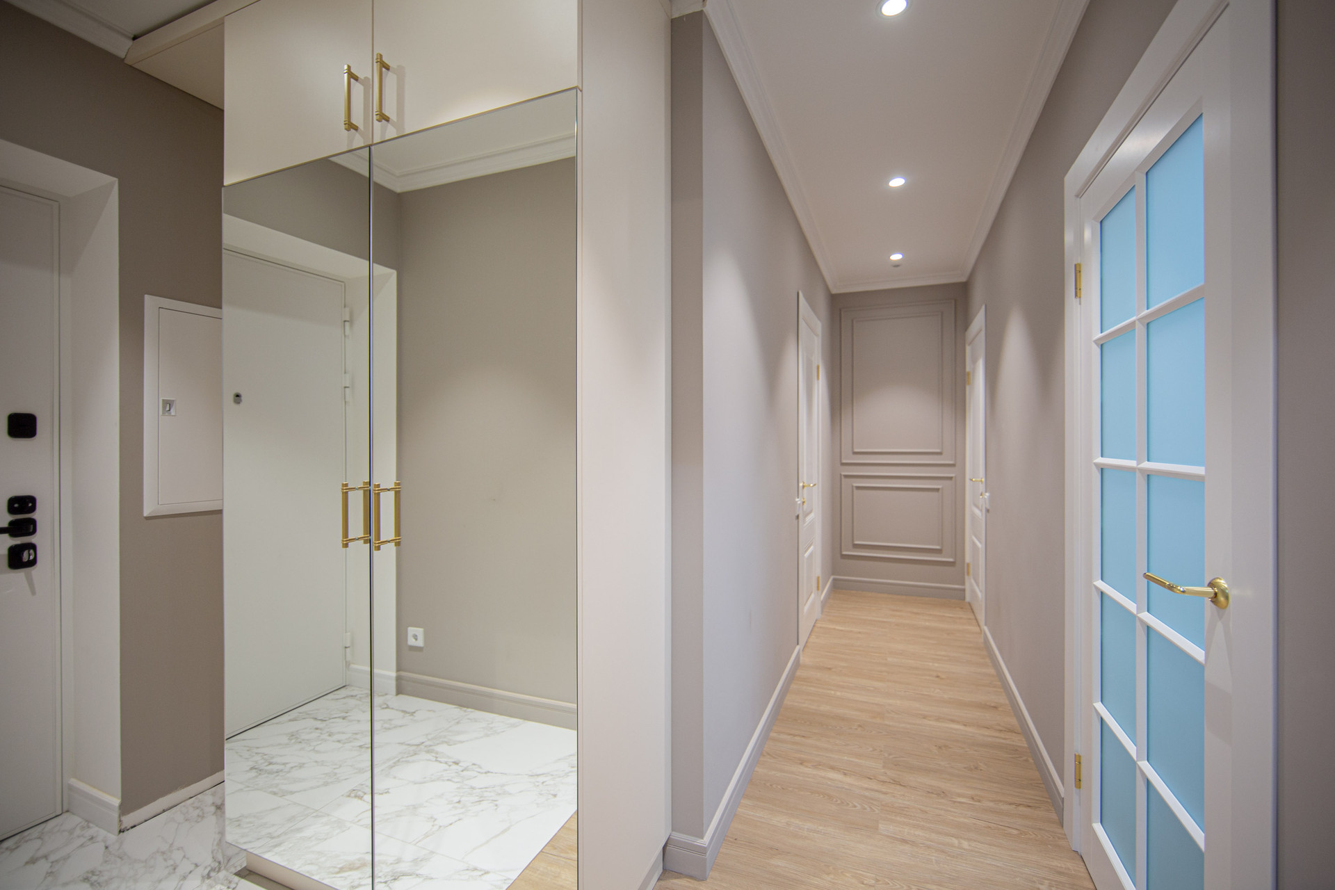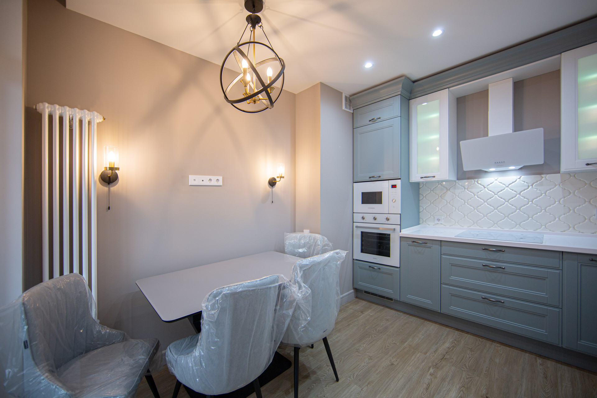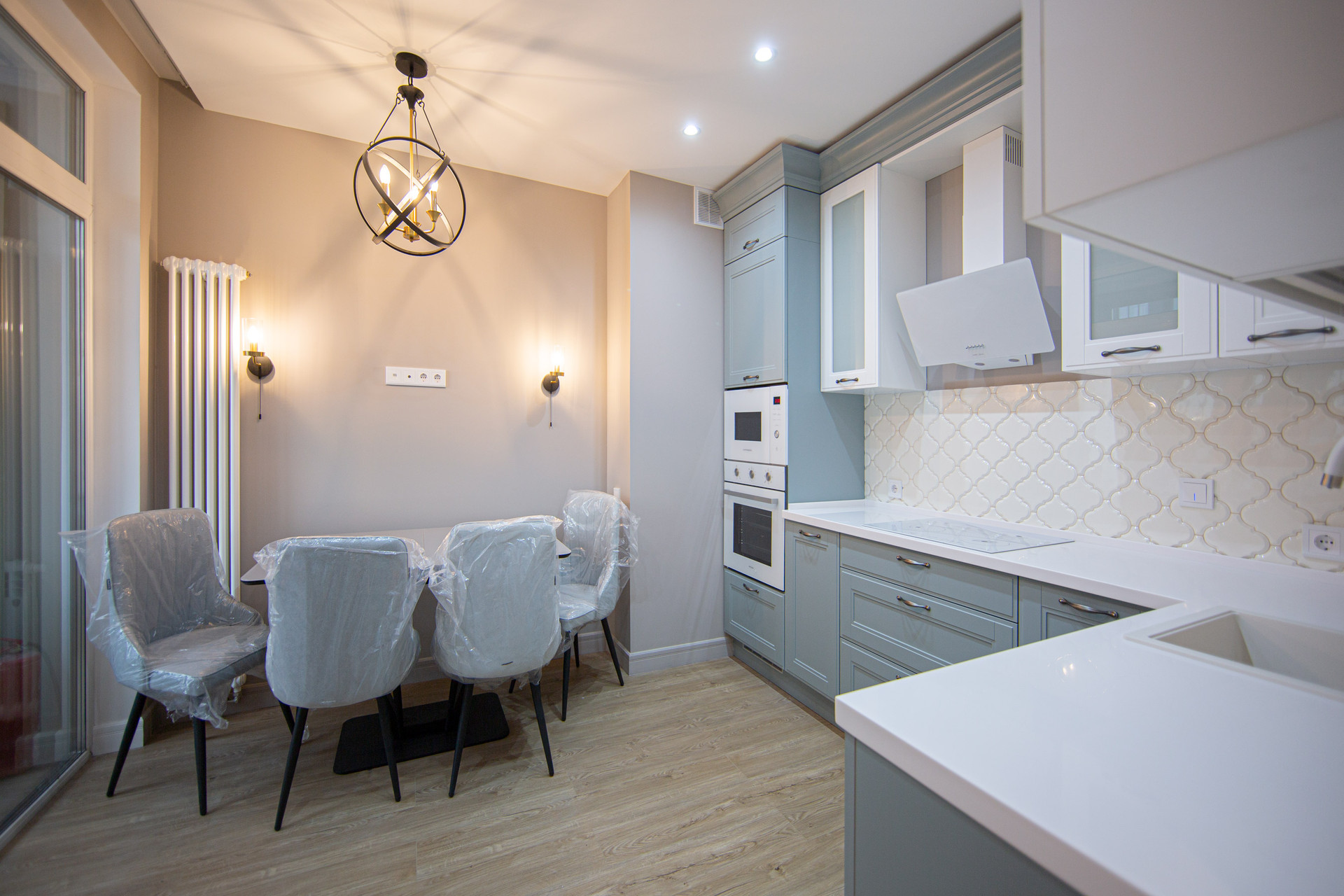 Нежные и спокойные оттенки в отделке и мебели, большие она и панорамное остекление на кухне-гостиной - все это создает оптимистичное настроение и уверенность, что все будет хорошо!