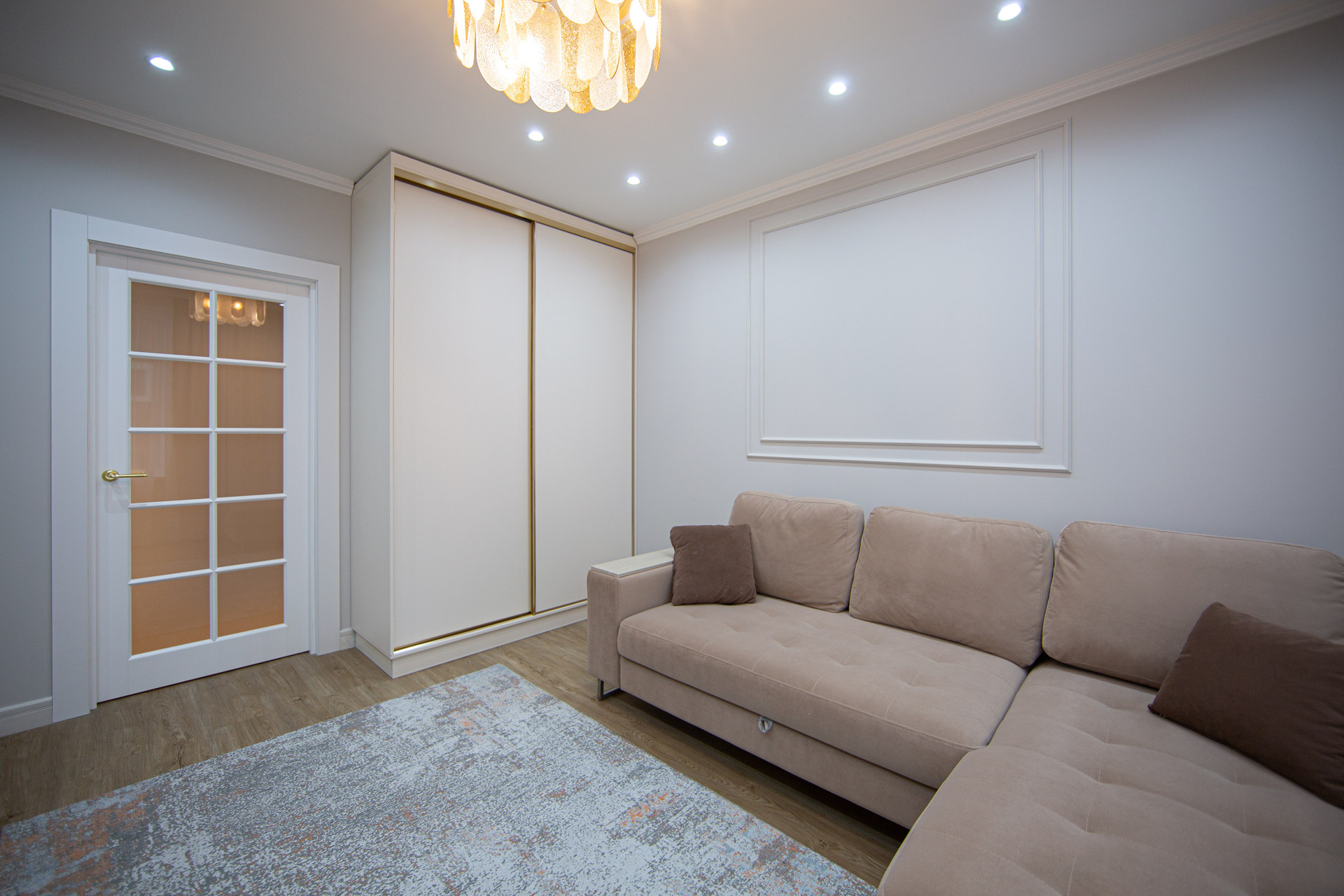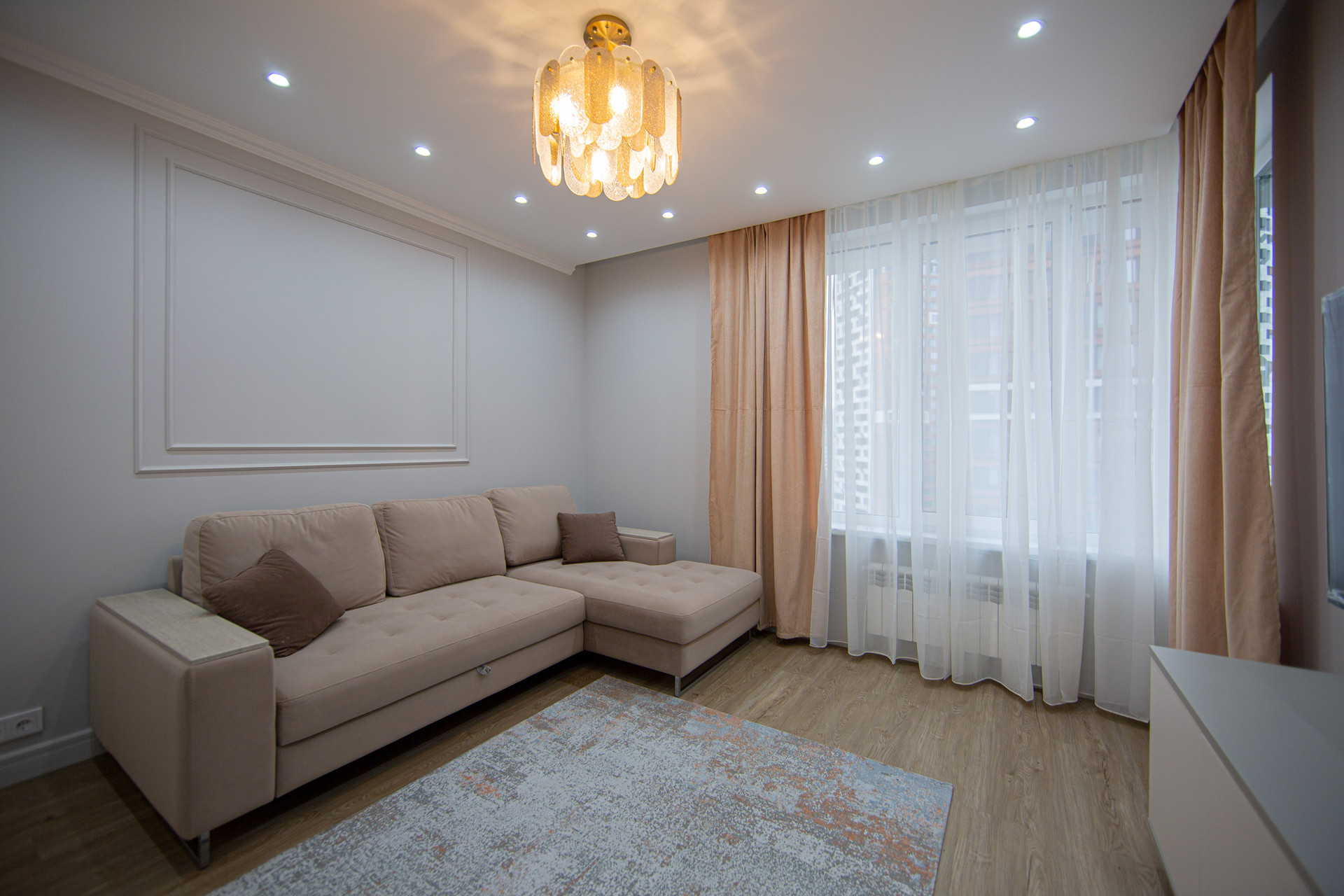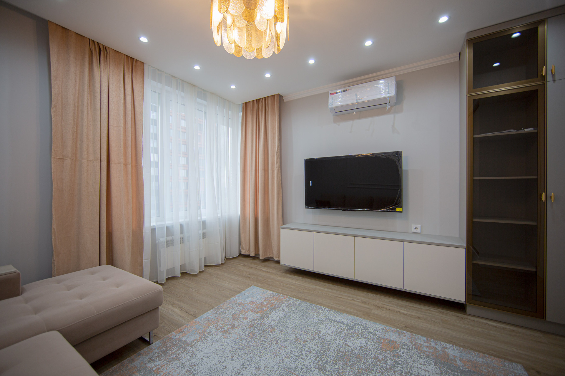 В большой комнате стоит царь-диван, с удобным спальным местом и ящиками для хранения постельного белья. Вместительные шкафы, ТВ и тумба, кондиционер.