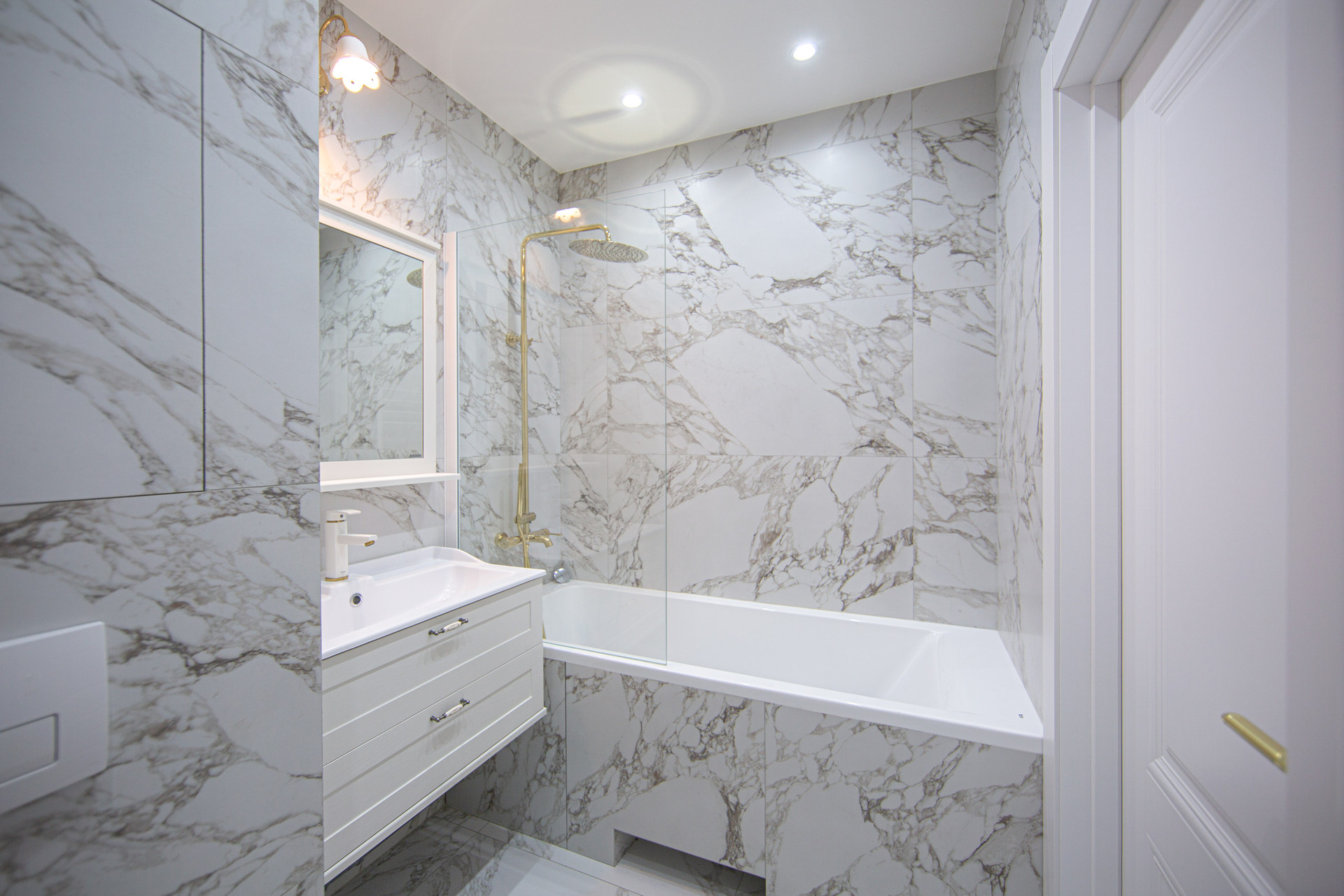 Красивая светлая ванная комната вместительная и удобная.